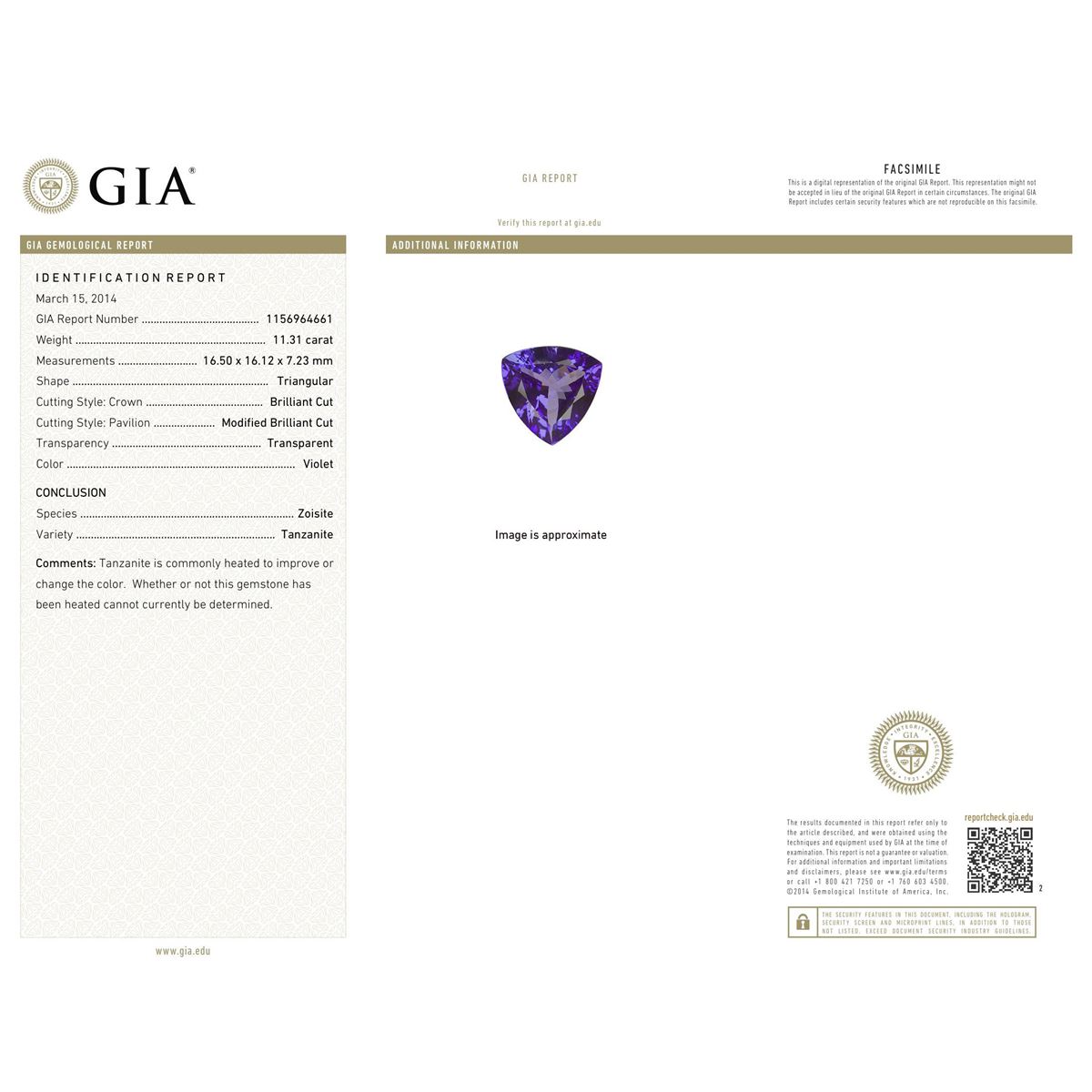 One electronically tested 14KT white gold Ladies combination cast & assembled pendant & chain 17.5" long, medium fancy cable link with a lobster claw clasp with a high polish finish. Condition is new. Identified with markings of "14K". Containing: One Hundred Ninety-Seven prong set round brilliant cut diamonds, measuring 0.90 - 0.90 x 0.54mm (depth est.) approximate. Total Weight of 197 Stones = 0.85ct. Clarity: I-1 to I-2. Color: H - I, Cut is Good. One prong set triangle modified brilliant cut natural tanzanite, measuring 16.50 x 16.12 x 7.23mm, exact weight 11.31ct., clarity is eye clean, type I, medium light, moderately strong, violet color, (GIA V 4/4), cut is very good. GIA Report: 1156964661.Total Weight of Colored Stones 11.31ct. Total Weight of Diamonds 0.85ct. Total Weight of Pendant & Chain 19.50 grams. GGL Appraised at $21,940.00.
