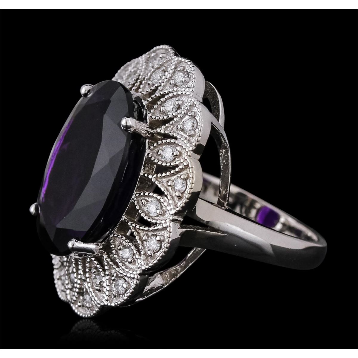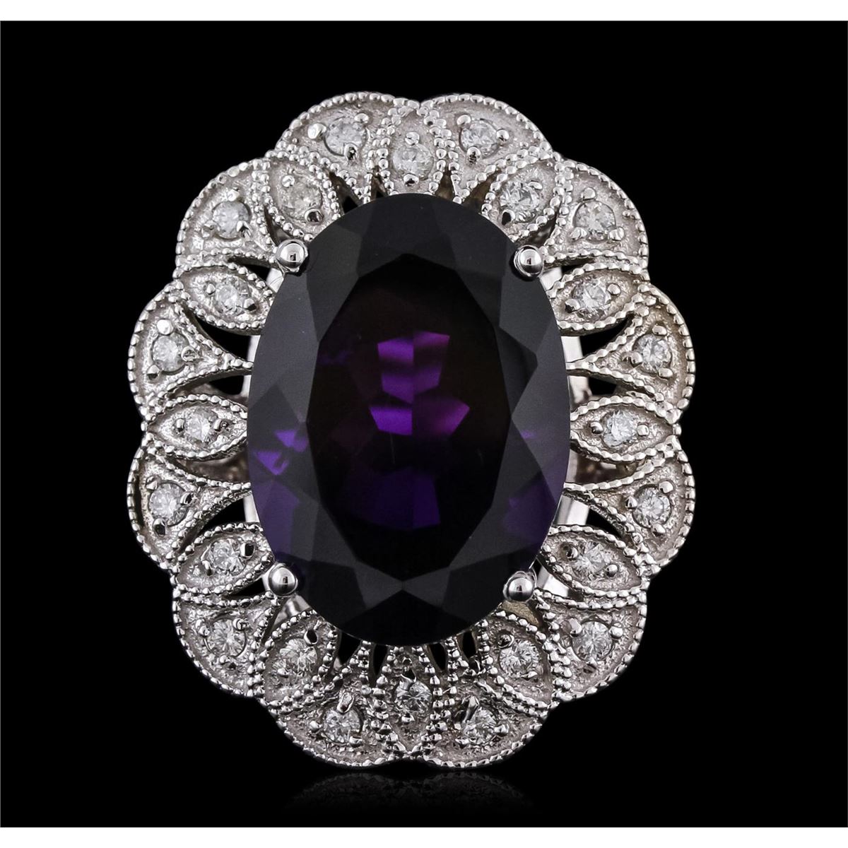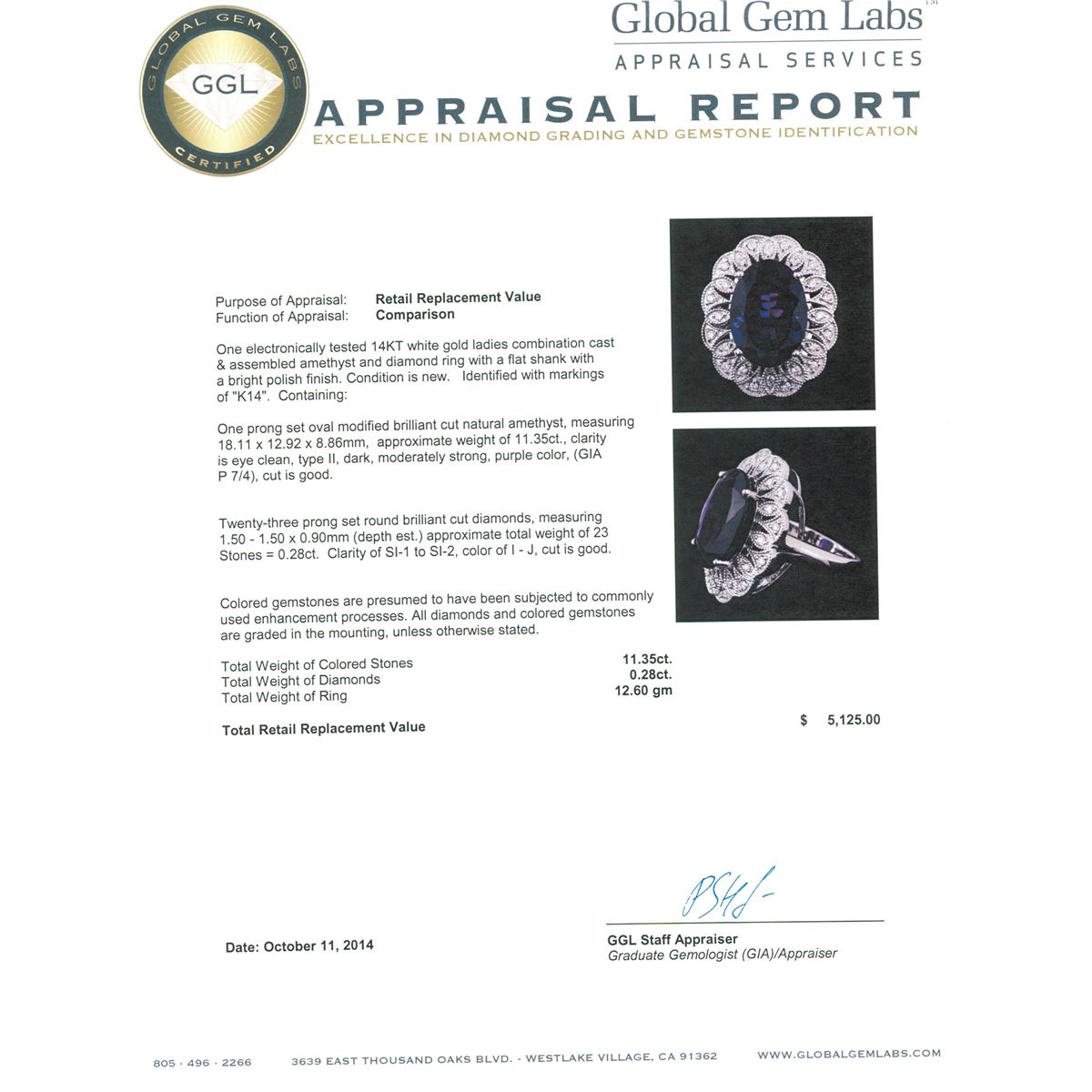 One electronically tested 14KT white gold ladies combination cast & assembled amethyst and diamond ring with a flat shank with a bright polish finish. Identified with markings of "K14". Condition is new. Containing: One prong set oval modified brilliant cut natural amethyst, measuring 18.11 x 12.92 x 8.86mm, approximate weight of 11.35ct., clarity is eye clean, type II, dark, moderately strong, purple color, (GIA P 7/4), cut is good. Twenty-Three prong set round brilliant cut diamonds, measuring 1.50 - 1.50 x 0.90mm (depth est.) approximate total weight of 23 Stones = 0.28ct. Clarity: SI-1 to SI-2. Color: I - J, Cut is Good. Colored gemstones are presumed to have been subjected to commonly used enhancement processes. All diamonds and colored gemstones are graded in the mounting, unless otherwise stated. Total Weight of Colored Stones 11.35ct. Total Weight of Diamonds 0.28ct. Total Weight of Ring 12.60 grams. GGL Appraised at $5,125.00.
