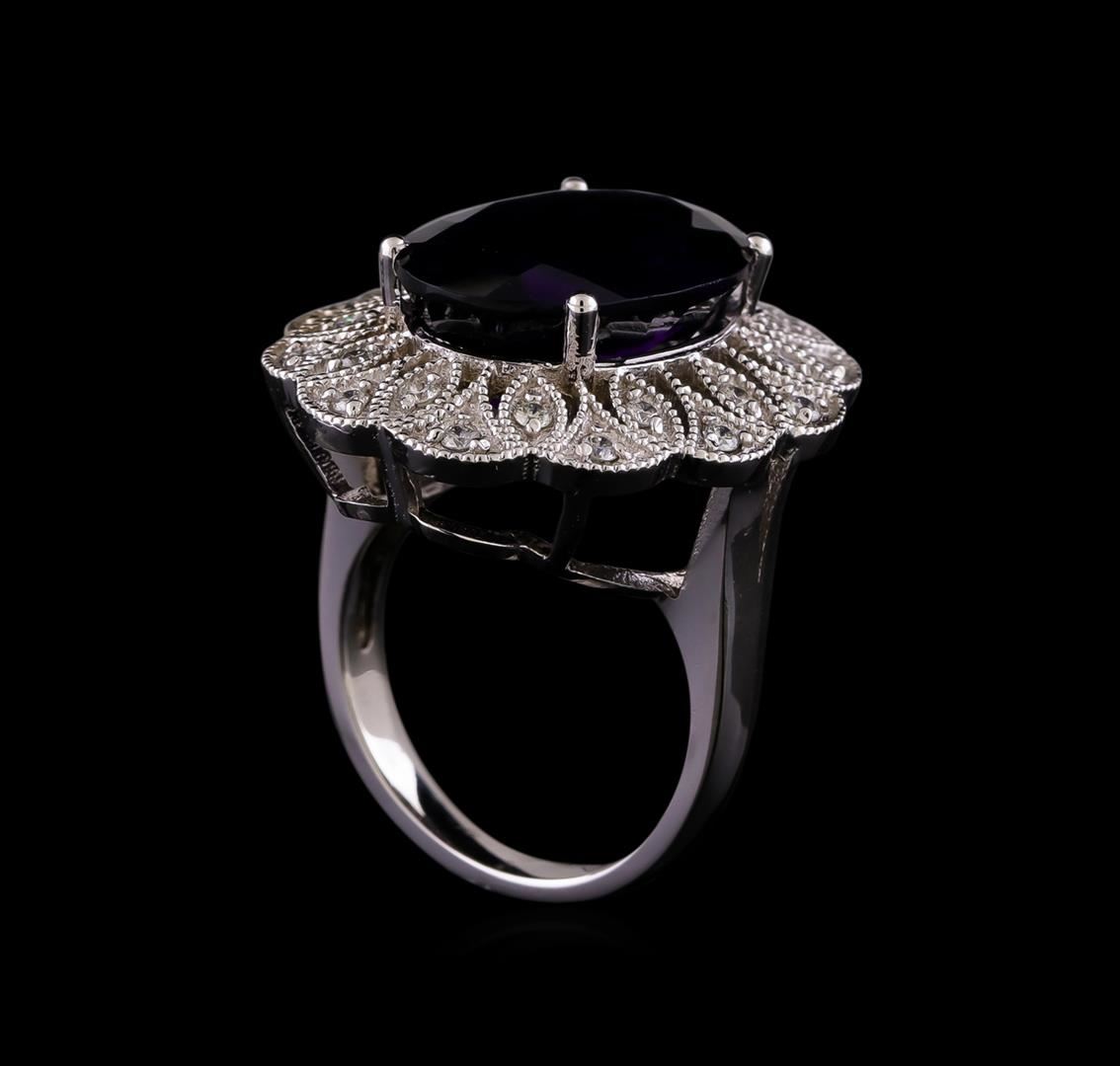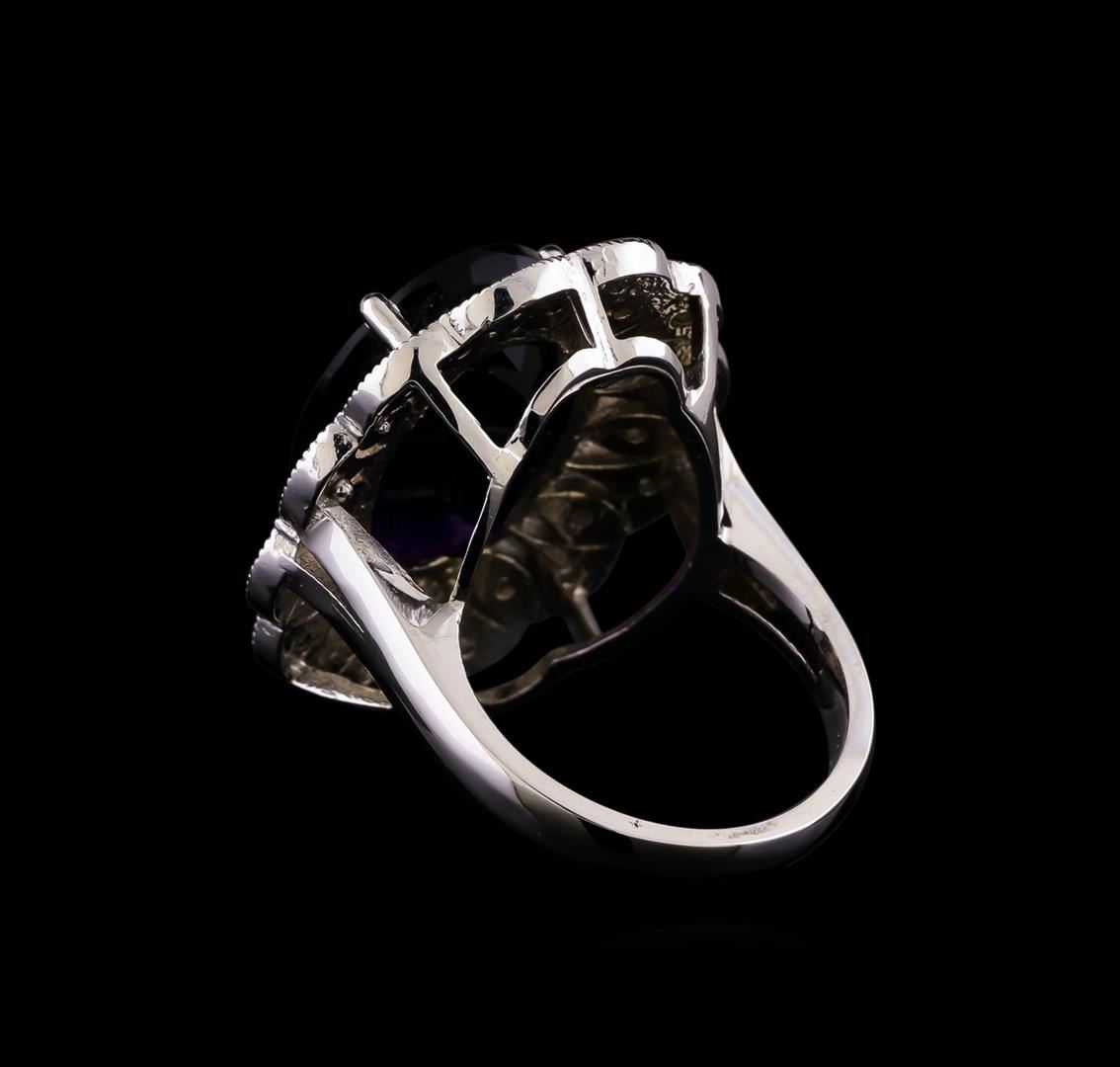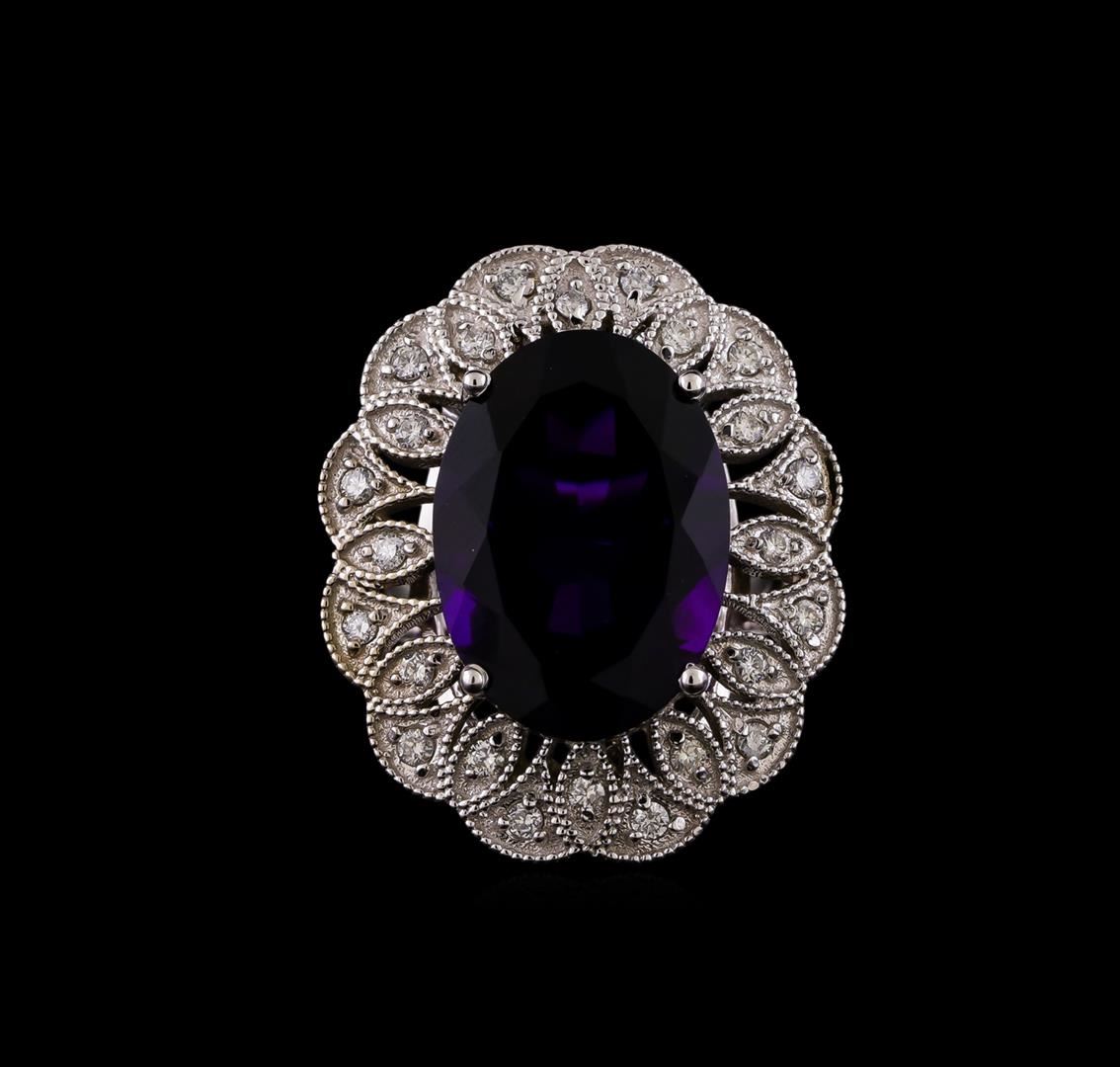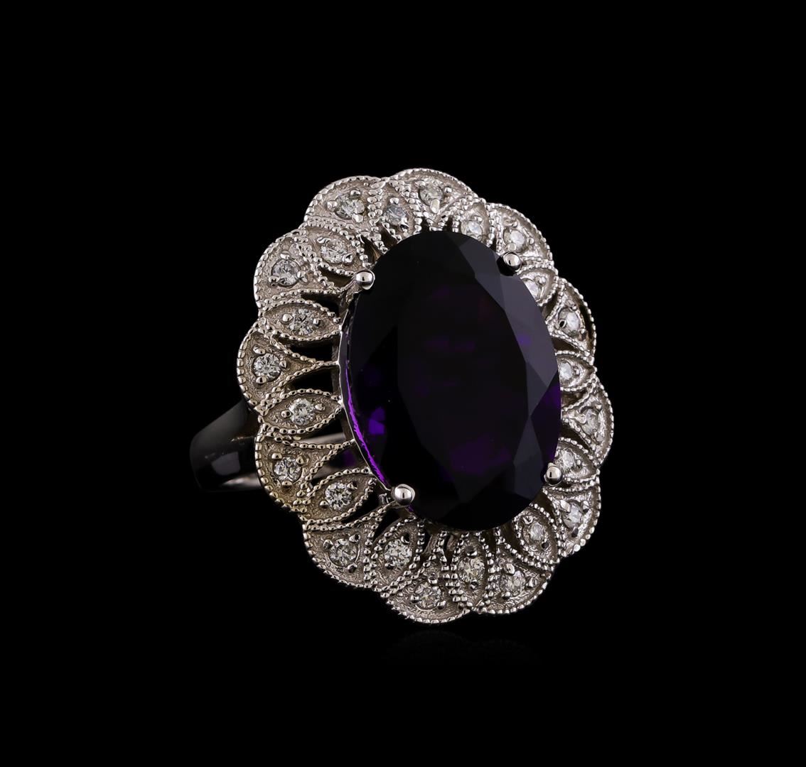 One electronically tested 14KT white gold ladies combination cast & assembled amethyst and diamond ring with a flat shank with a bright polish finish. Identified with markings of "K14". Condition is new. Containing: One prong set oval modified brilliant cut natural amethyst, measuring 18.11 x 12.92 x 8.86mm, approximate weight of 11.35ct., clarity is eye clean, type II, dark, moderately strong, purple color, (GIA P 7/4), cut is good. Twenty-Three prong set round brilliant cut diamonds, measuring 1.50 - 1.50 x 0.90mm (depth est.) approximate total weight of 23 Stones = 0.28ct. Clarity: SI-1 to SI-2. Color: I - J, Cut is Good. Colored gemstones are presumed to have been subjected to commonly used enhancement processes. All diamonds and colored gemstones are graded in the mounting, unless otherwise stated. Total Weight of Colored Stones 11.35ct. Total Weight of Diamonds 0.28ct. Total Weight of Ring 12.60 grams. GGL Appraised at $5,125.00.