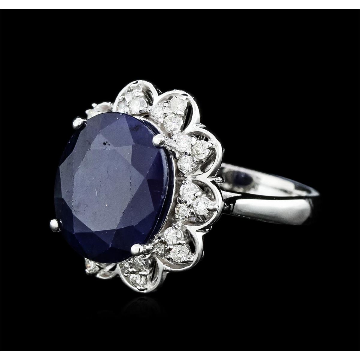 One electronically tested 14KT white gold ladies cast sapphire and diamond ring with a bright polish finish. Identified with markings of "K14". Condition is new. Containing: One prong set oval modified brilliant cut natural blue sapphire, measuring 14.18 x 12.11 x 7.87mm, approximate weight of 11.35ct., clarity is heavily included, type II, dark, moderately strong, blue color, (GIA B 7/4), cut is good. Thirty prong set round brilliant cut diamonds, measuring 1.50 - 1.50 x 0.90mm (depth est.) approximate total weight of 30 Stones = 0.37ct. Clarity: SI-2 to I-1. Color: I - J, Cut is Good. Colored gemstones are presumed to have been subjected to commonly used enhancement processes. All diamonds and colored gemstones are graded in the mounting, unless otherwise stated. Total Weight of Colored Stones 11.35ct. Total Weight of Diamonds 0.37ct. Total Weight of Ring 7.60 grams. GGL Appraised at $3,615.00.