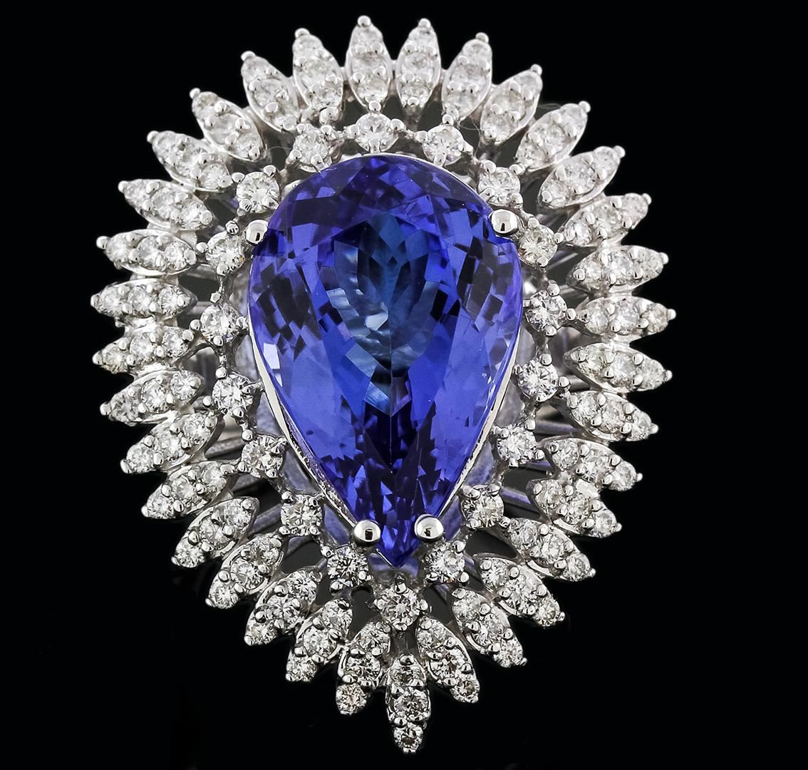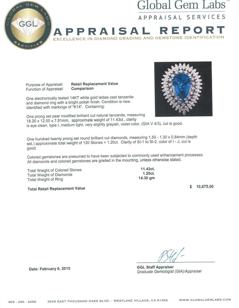 One electronically tested 14KT white gold ladies cast tanzanite and diamond ring with a bright polish finish. Identified with markings of "K14". Condition is new. Containing: One prong set pear modified brilliant cut natural tanzanite, measuring 18.20 x 12.00 x 7.81mm, approximate weight of 11.43ct., clarity is eye clean, type I, medium light, very slightly grayish, violet color, (GIA V 4/3), cut is good. One Hundred Twenty prong set round brilliant cut diamonds, measuring 1.50 - 1.30 x 0.84mm (depth est.) approximate. total weight of 120 Stones = 1.20ct. Clarity: SI-1 to SI-2. Color: I - J, Cut is Good. Colored gemstones are presumed to have been subjected to commonly used enhancement processes. All diamonds and colored gemstones are graded in the mounting, unless otherwise stated. Total Weight of Colored Stones 11.43ct. Total Weight of Diamonds 1.20ct. Total Weight of Ring 14.30 grams. GGL Appraised at $10,675.00.