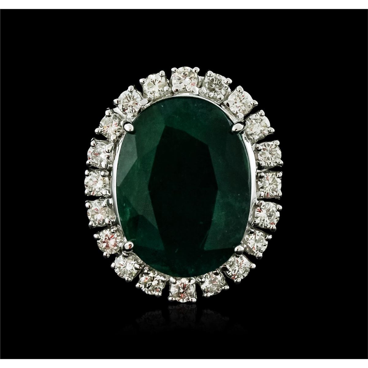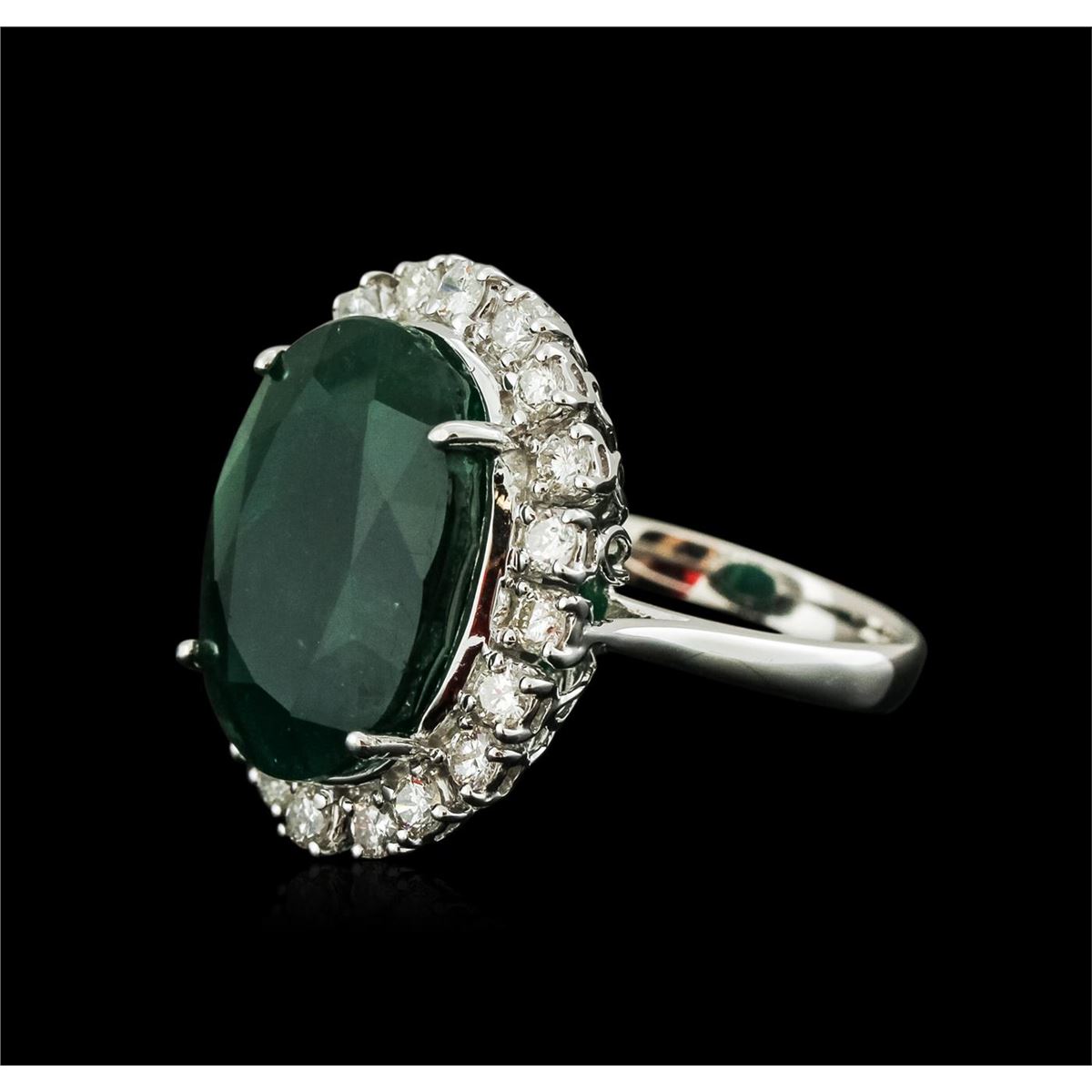 One electronically tested 14KT white gold ladies cast emerald and diamond ring with a bright polish finish. Identified with markings of "14K". Condition is new. Containing: One prong set oval modified brilliant cut natural emerald, measuring 18.51 x 13.55 x 8.00mm, approximate weight of 11.46ct., clarity is heavily included, type III, dark, moderately strong, green color, (GIA G 7/4), cut is good. Twenty prong set round brilliant cut diamonds, measuring 2.50 - 2.50 x 1.50mm (depth est.) approximate total weight of 20 Stones = 1.14ct. Clarity: SI-1 to SI-2. Color: I - J, Cut is Good. Colored gemstones are presumed to have been subjected to commonly used enhancement processes. All diamonds and colored gemstones are graded in the mounting, unless otherwise stated. Total Weight of Colored Stones 11.46ct. Total Weight of Diamonds 1.14ct. Total Weight of Ring 10.20 grams. GGL Appraised at $6,965.00.