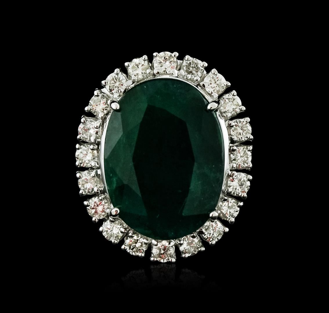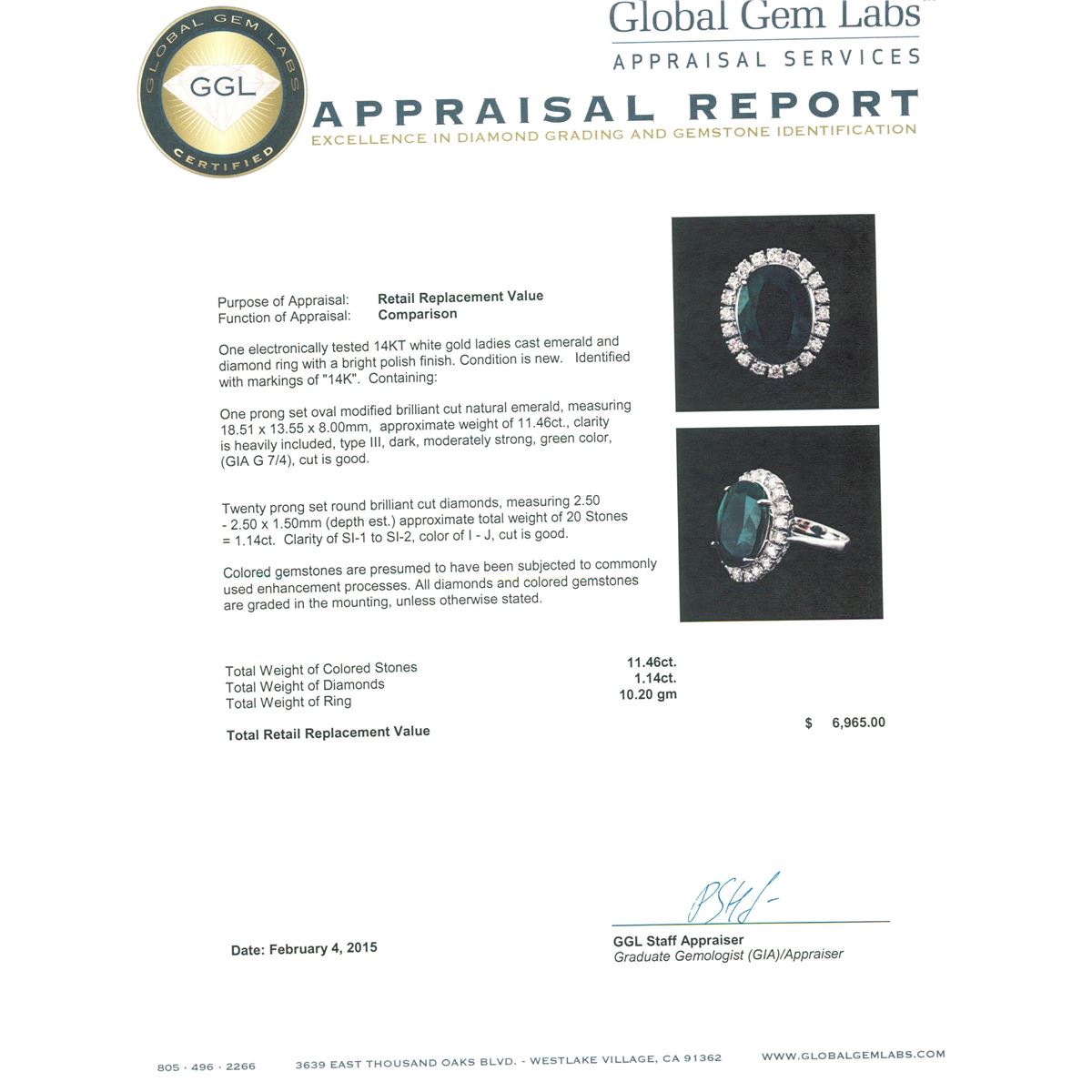 One electronically tested 14KT white gold ladies cast emerald and diamond ring with a bright polish finish. Identified with markings of "14K". Condition is new. Containing: One prong set oval modified brilliant cut natural emerald, measuring 18.51 x 13.55 x 8.00mm, approximate weight of 11.46ct., clarity is heavily included, type III, dark, moderately strong, green color, (GIA G 7/4), cut is good. Twenty prong set round brilliant cut diamonds, measuring 2.50 - 2.50 x 1.50mm (depth est.) approximate total weight of 20 Stones = 1.14ct. Clarity: SI-1 to SI-2. Color: I - J, Cut is Good. Colored gemstones are presumed to have been subjected to commonly used enhancement processes. All diamonds and colored gemstones are graded in the mounting, unless otherwise stated. Total Weight of Colored Stones 11.46ct. Total Weight of Diamonds 1.14ct. Total Weight of Ring 10.20 grams. GGL Appraised at $6,965.00.