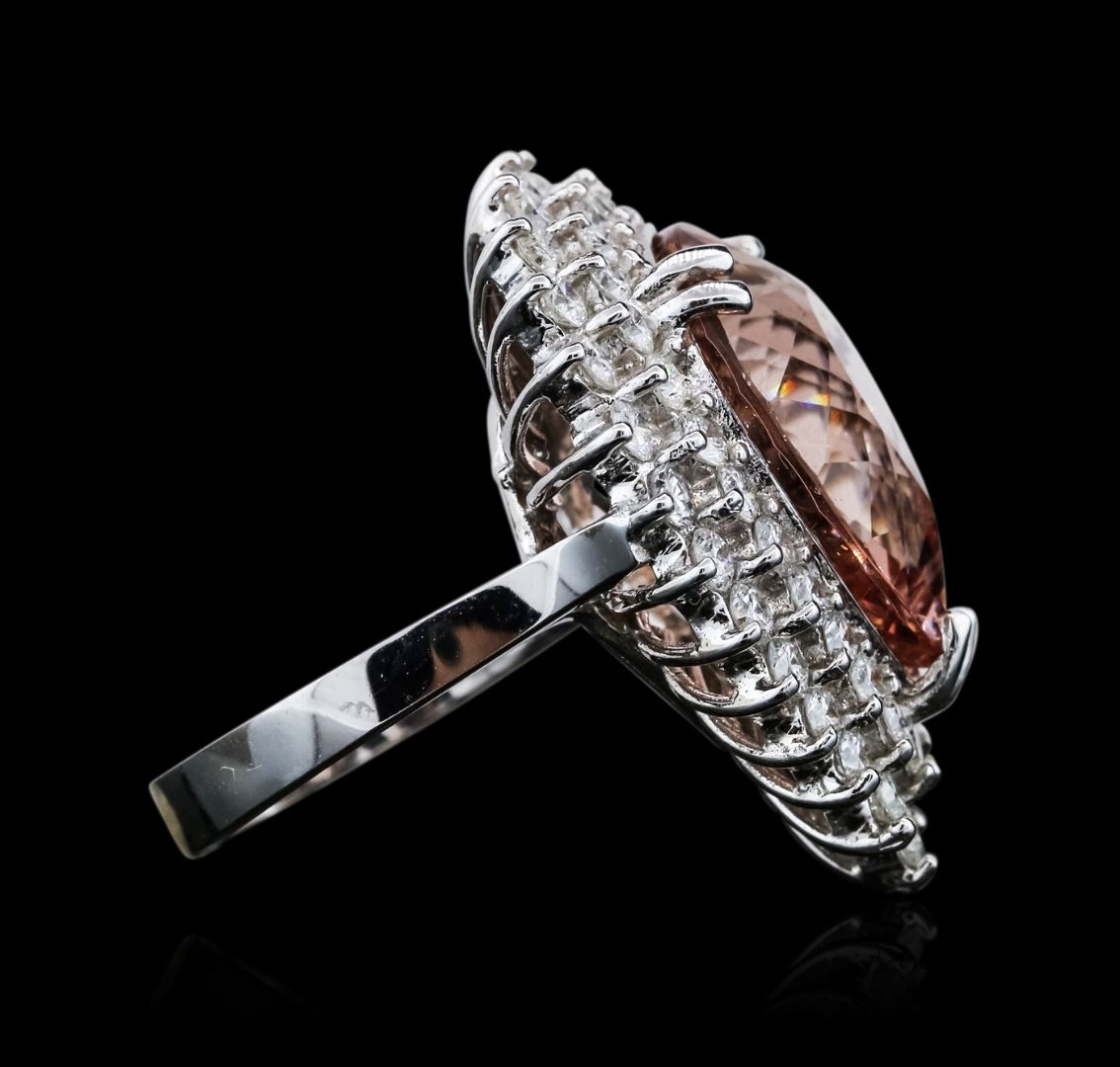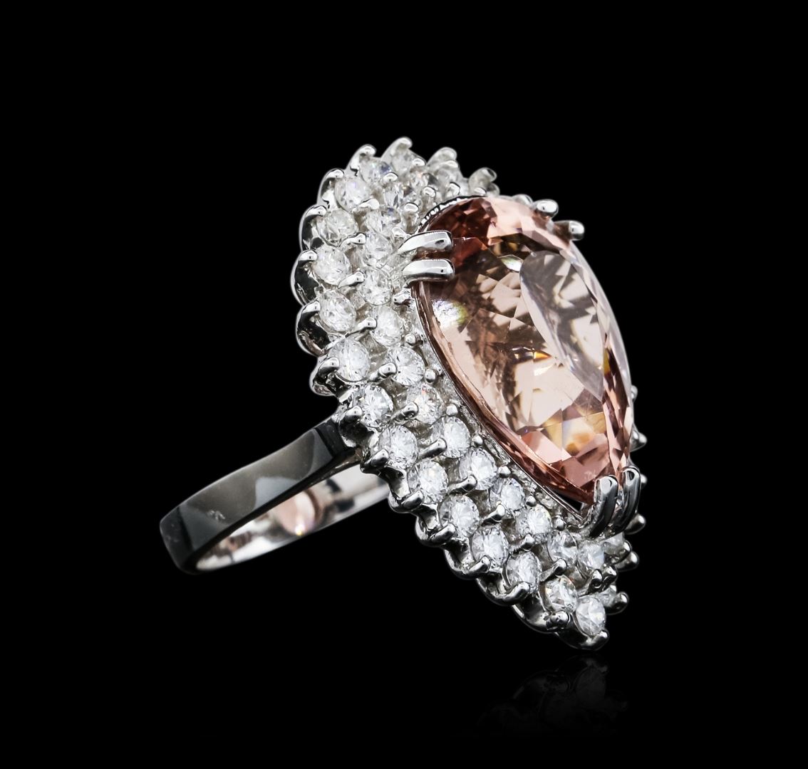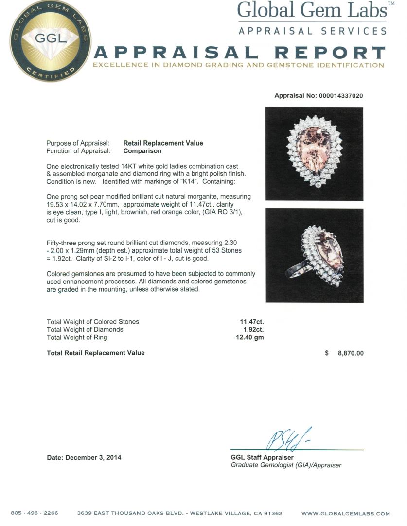 One electronically tested 14KT white gold ladies combination cast & assembled morganatic and diamond ring with a bright polish finish. Identified with markings of "K14". Condition is new. Containing: One prong set pear modified brilliant cut natural morganite, measuring 19.53 x 14.02 x 7.70mm, approximate weight of 11.47ct., clarity is eye clean, type I, light, brownish, red orange color, (GIA RO 3/1), cut is good. Fifty-Three prong set round brilliant cut diamonds, measuring 2.30 - 2.00 x 1.29mm (depth est.) approximate total weight of 53 Stones = 1.92ct. Clarity: SI-2 to I-1. Color: I - J, Cut is Good. Colored gemstones are presumed to have been subjected to commonly used enhancement processes. All diamonds and colored gemstones are graded in the mounting, unless otherwise stated. Total Weight of Colored Stones 11.47ct. Total Weight of Diamonds 1.92ct. Total Weight of Ring 12.40 grams. GGL Appraised at $8,870.00.