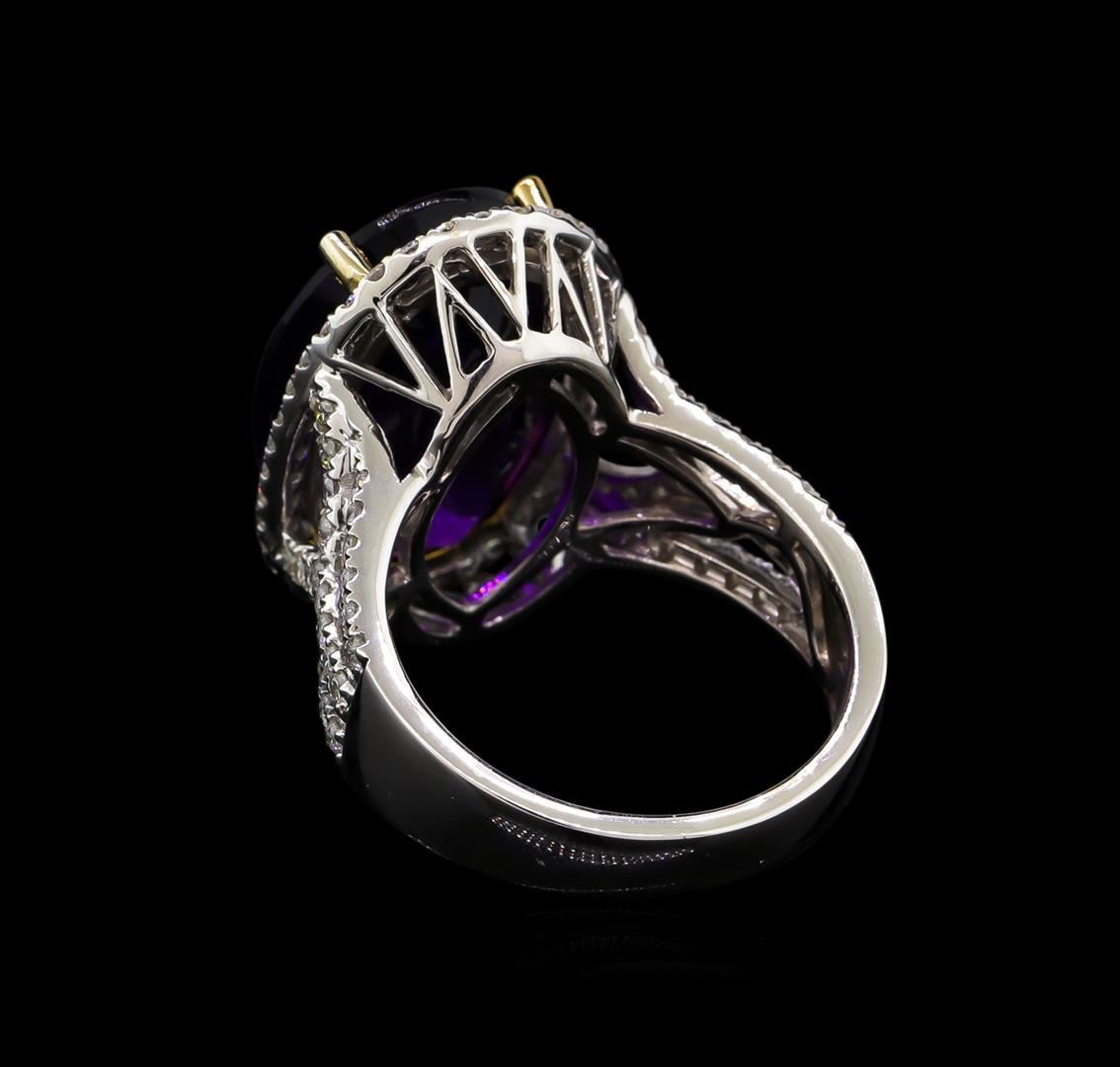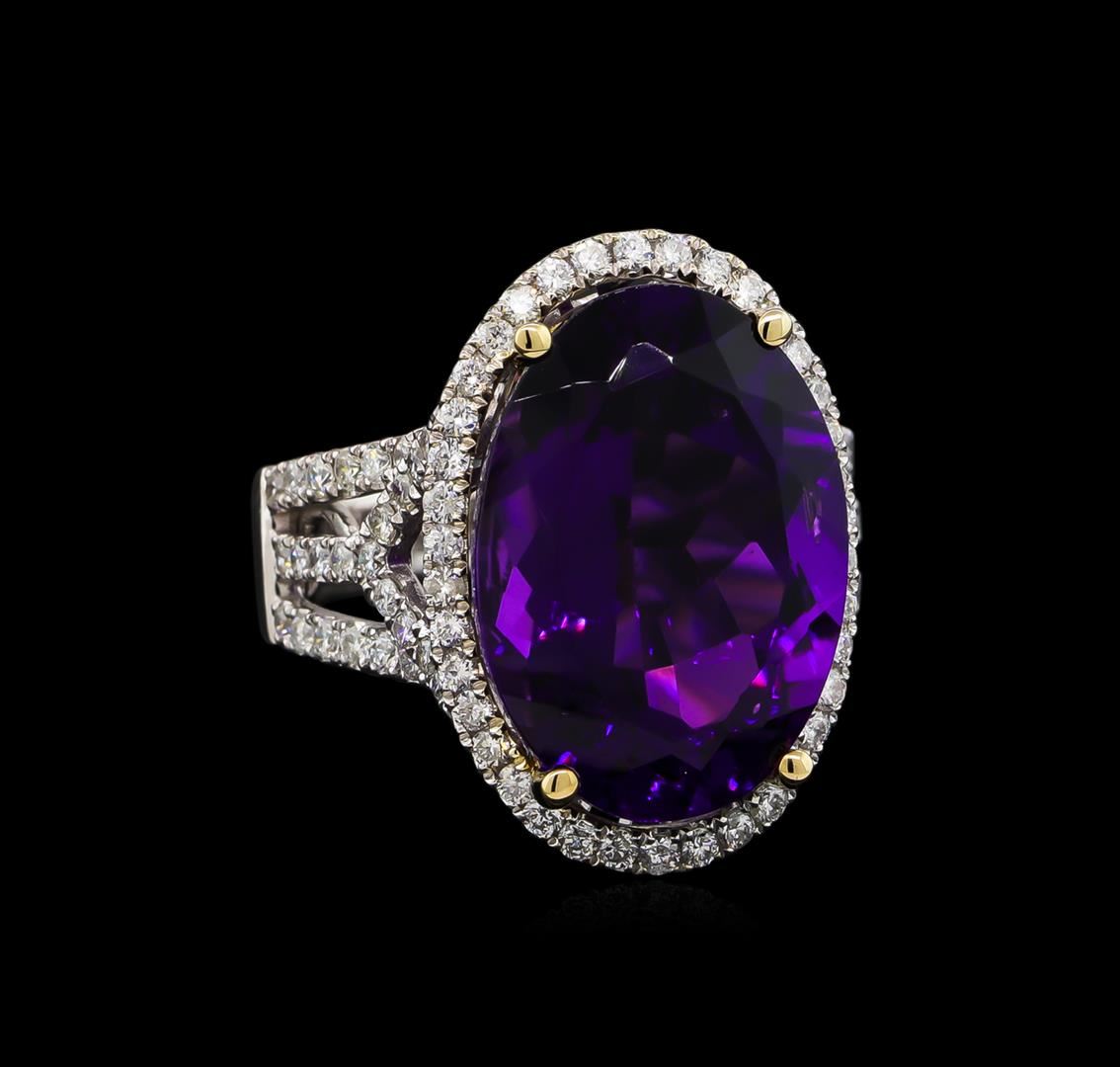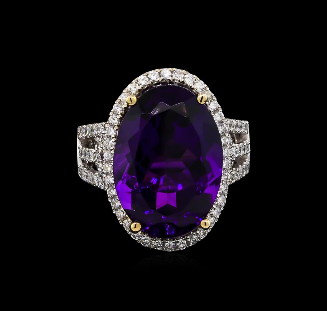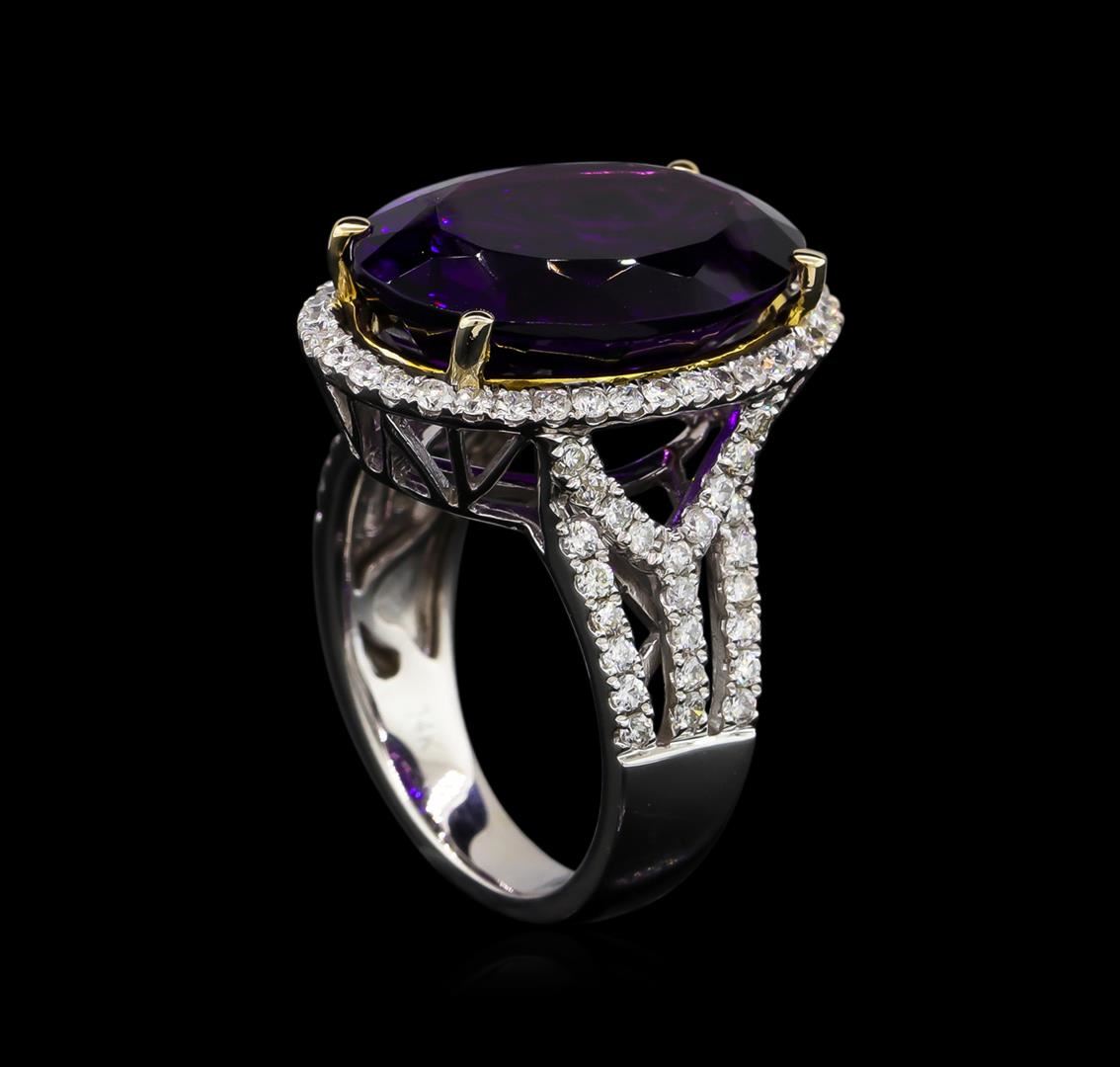 One electronically tested 14KT white gold ladies cast amethyst and diamond ring with a bright polish finish. Condition is new, good workmanship. The featured amethyst is set within a diamond bezel supported by diamond set split shoulders, completed by a three and one-half millimeter wide band. Identified with markings of "14K". Containing: One prong set oval mixed cut natural amethyst, measuring 18.00 x 12.90 x 8.50mm, 6%. bulge factor, approximate weight of 11.51ct., clarity is eye clean, type II, dark, moderately strong, reddish purple color, (GIA rP 7/4), cut is good. Transmitting light with no distortion, transparent. Colored Stone Grading Report attached. Graded in the setting. Eighty-Eight prong set round brilliant cut diamonds, measuring 1.60 - 1.40 x 0.90mm (depth est.) approximate. Total Weight of 88 Stones = 1.21ct. Graded in the setting. Clarity: SI-1 to I-1. Color: G - I. Total Weight of Colored Stones 11.51ct. Total Weight of Diamonds 1.21ct. Total Weight of Ring 9.32grams. AIG Appraised at $5,710.00.