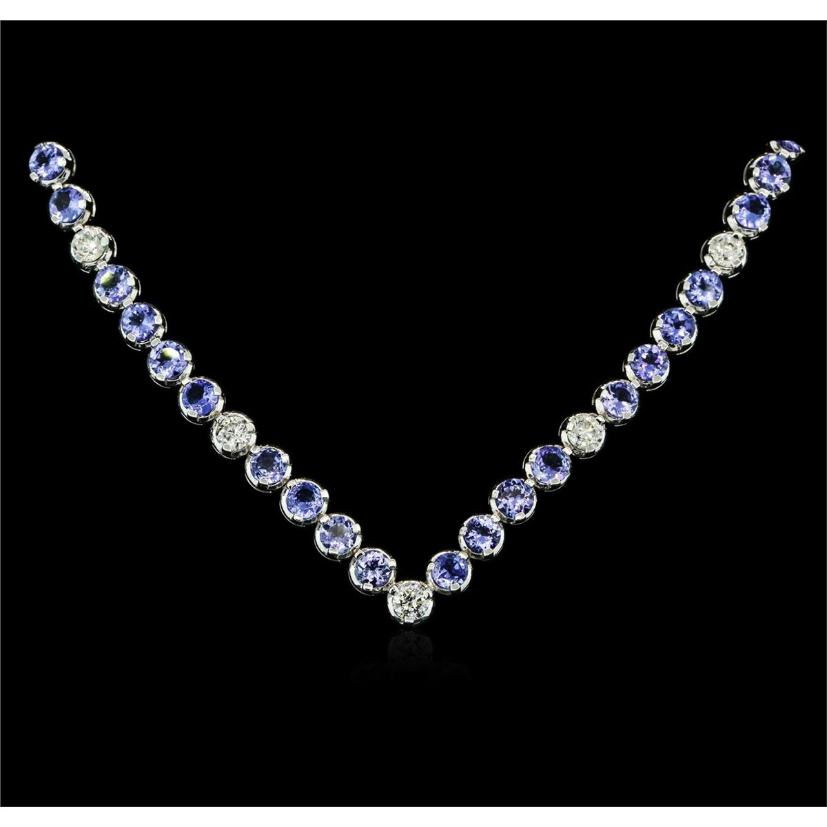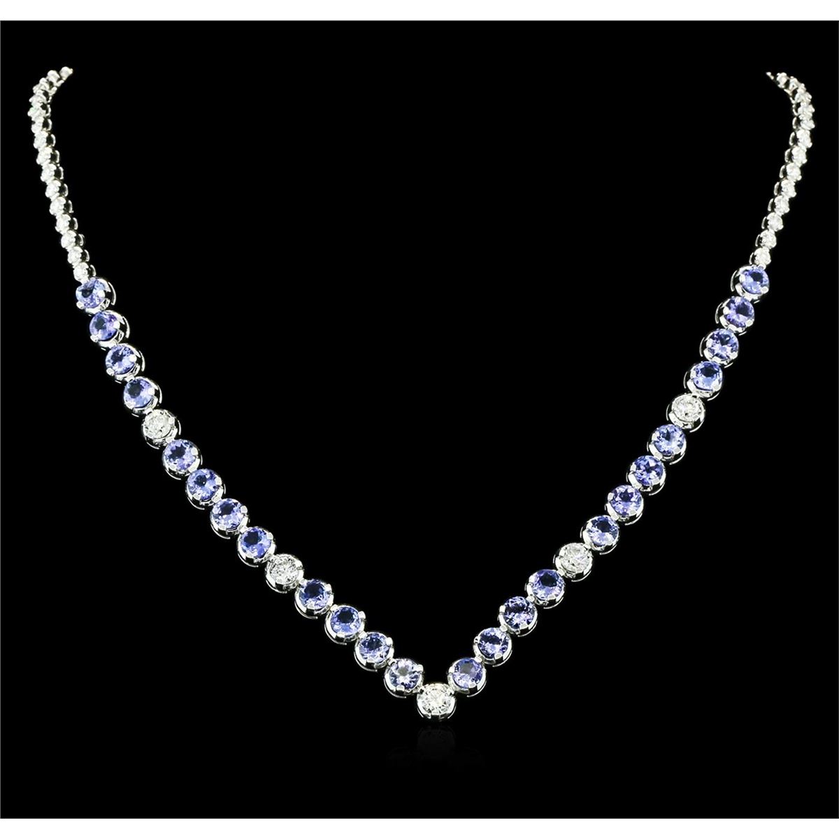 One electronically tested 14KT white gold ladies combination cast & assembled tanzanite and diamond necklace with a hidden box clasp with safety closer with a bright polish finish. Identified with markings of "14K". Condition is new. Containing: Twenty-four prong set round modified brilliant cut natural tanzanites, measuring 5.17 - 4.80 x 2.66 mm, approximate total weight of 11.52ct., clarity is eye clean, type I, medium light, very slightly grayish, violet color, (GIA V 4/3), cut is good. Five prong set round brilliant cut diamonds, measuring 4.79 - 4.30 x 2.95mm (depth est.) approximate total weight of 5 Stones = 1.86ct. Clarity: SI-2 to I-1. Color: I - J, Cut is Good. All diamonds and colored gemstones are graded in the mounting, unless otherwise stated. Colored gemstones are presumed to have been subjected to commonly used enhancement processes. Sixty-Six prong set round brilliant cut diamonds, measuring 2.00 - 2.00 x 1.20mm (depth est.) approximate total weight of 66 Stones = 1.93ct. Clarity: SI-2. Color: I - J, Cut is Good. All diamonds and colored gemstones are graded in the mounting, unless otherwise stated. Colored gemstones are presumed to have been subjected to commonly used enhancement processes. Total Weight of Colored Stones 11.52ct. Total Weight of Diamonds 3.79ct. Total Weight of Necklace 37.50 grams. GGL Appraised at $18,980.00.