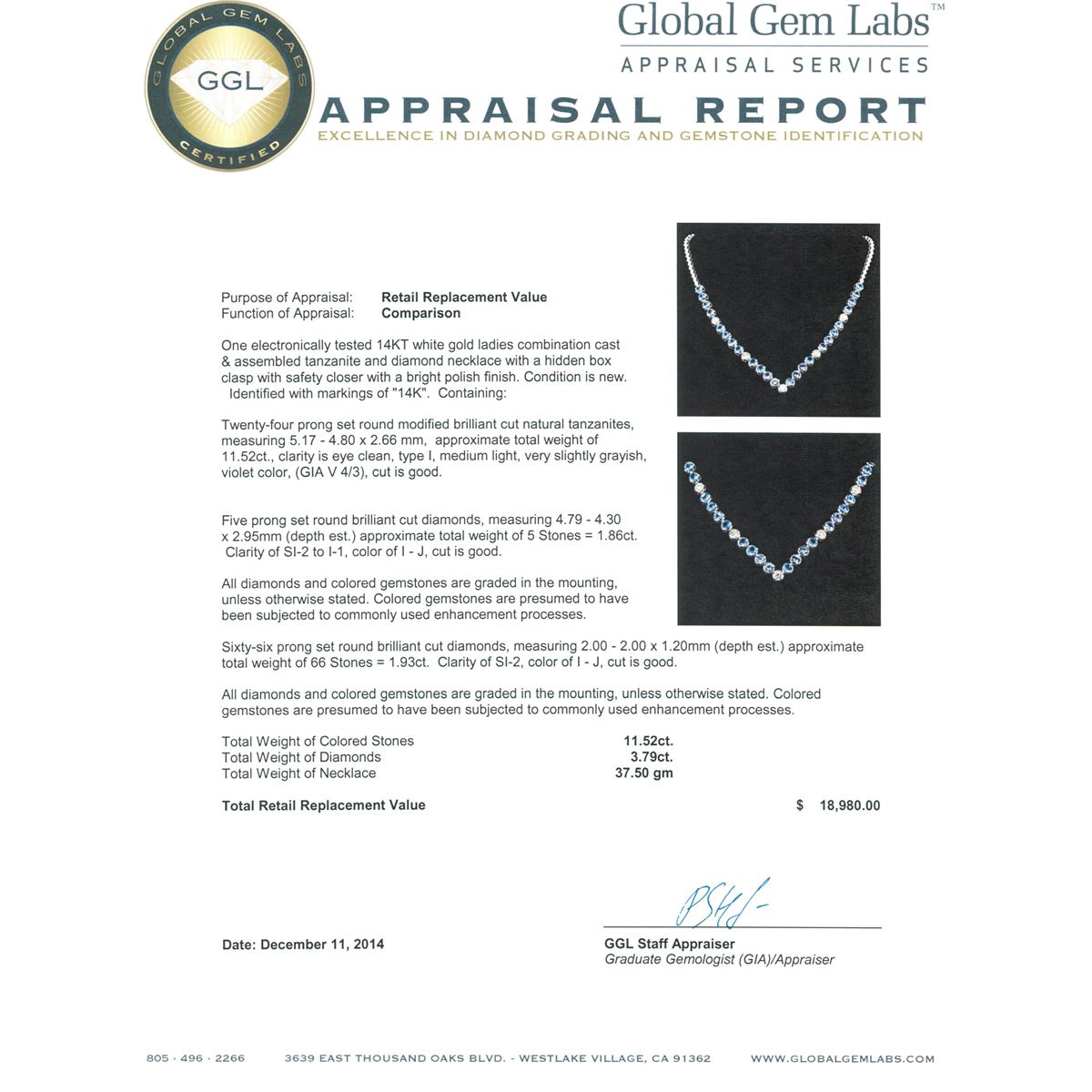 One electronically tested 14KT white gold ladies combination cast & assembled tanzanite and diamond necklace with a hidden box clasp with safety closer with a bright polish finish. Identified with markings of "14K". Condition is new. Containing: Twenty-four prong set round modified brilliant cut natural tanzanites, measuring 5.17 - 4.80 x 2.66 mm, approximate total weight of 11.52ct., clarity is eye clean, type I, medium light, very slightly grayish, violet color, (GIA V 4/3), cut is good. Five prong set round brilliant cut diamonds, measuring 4.79 - 4.30 x 2.95mm (depth est.) approximate total weight of 5 Stones = 1.86ct. Clarity: SI-2 to I-1. Color: I - J, Cut is Good. All diamonds and colored gemstones are graded in the mounting, unless otherwise stated. Colored gemstones are presumed to have been subjected to commonly used enhancement processes. Sixty-Six prong set round brilliant cut diamonds, measuring 2.00 - 2.00 x 1.20mm (depth est.) approximate total weight of 66 Stones = 1.93ct. Clarity: SI-2. Color: I - J, Cut is Good. All diamonds and colored gemstones are graded in the mounting, unless otherwise stated. Colored gemstones are presumed to have been subjected to commonly used enhancement processes. Total Weight of Colored Stones 11.52ct. Total Weight of Diamonds 3.79ct. Total Weight of Necklace 37.50 grams. GGL Appraised at $18,980.00.