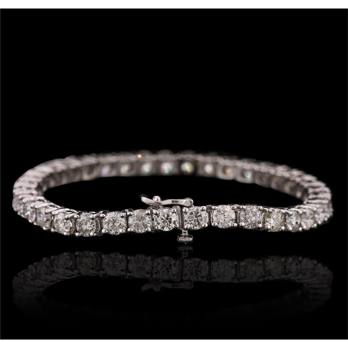One electronically tested 14KT white gold ladies combination cast & assembled tennis bracelet with a hidden box clasp with a bright polish finish. Measurements: 7" in length. Identified with markings of "14K". Condition is new. Containing: Thirty-Seven prong set round brilliant cut diamonds, measuring 4.40 - 4.40 x 2.64mm (depth est.) approximate total weight of 37 Stones = 11.53ct. Clarity: I-1 to I-3. Color: I - K, Cut is Good. All diamonds are graded in the mounting, unless otherwise stated. Total Weight of Diamonds 11.53ct. Total Weight of Bracelet 19.30 grams. GGL Appraised at $34,570.00.