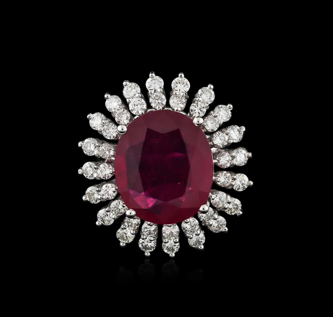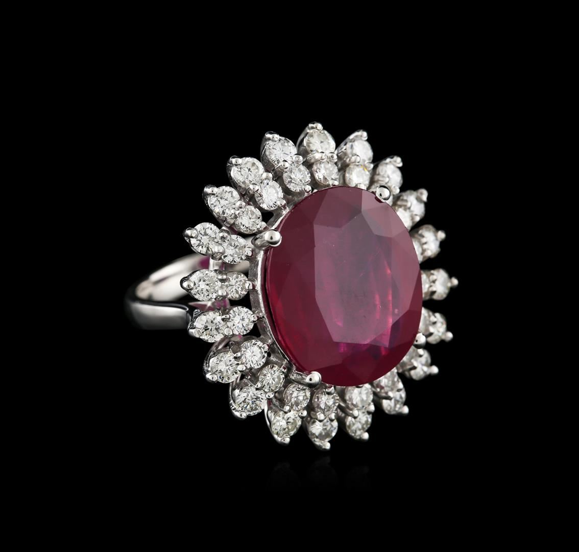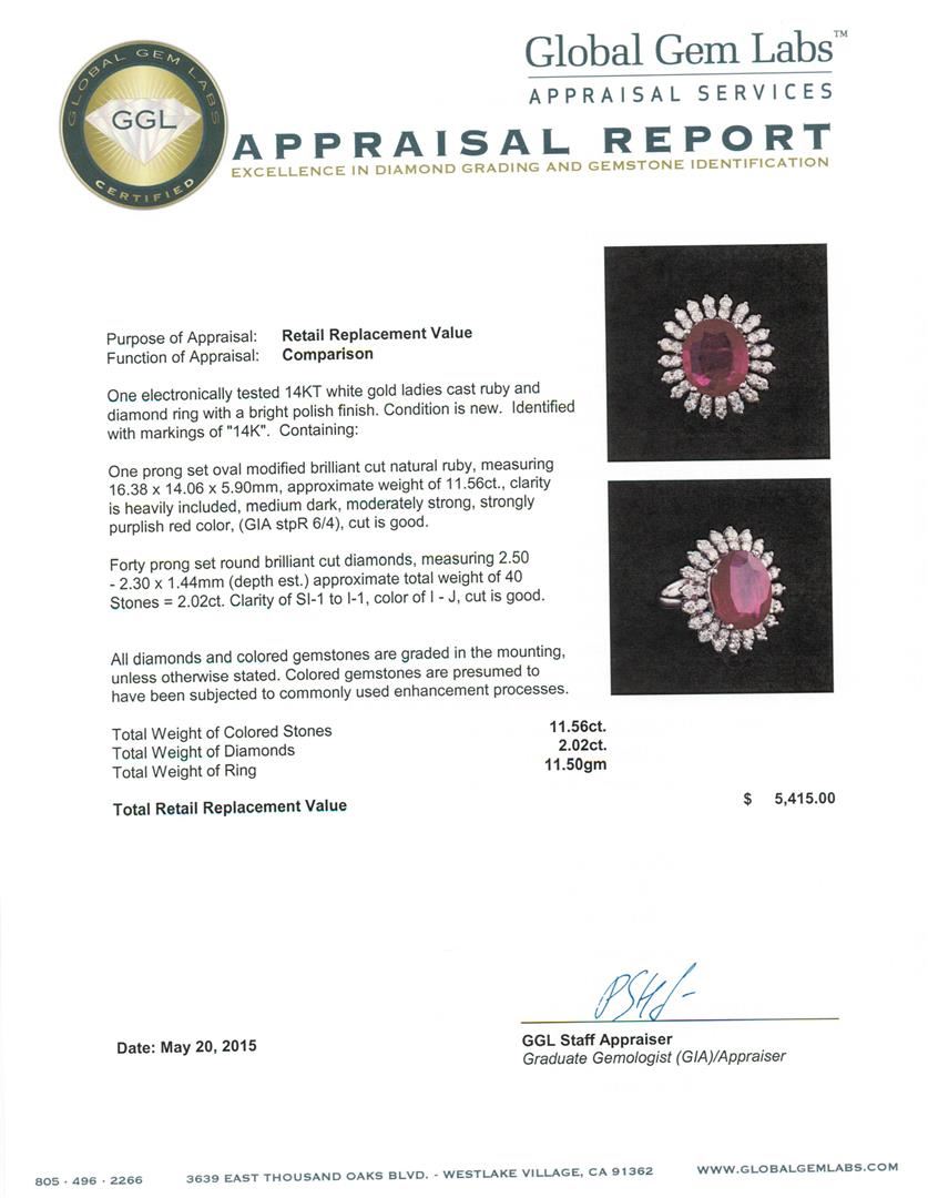 One electronically tested 14KT white gold ladies cast ruby and diamond ring with a bright polish finish. Identified with markings of "14K". Condition is new. Containing: One prong set oval modified brilliant cut natural ruby, measuring 16.38 x 14.06 x 5.90mm, approximate weight of 11.56ct., clarity is heavily included, medium dark, moderately strong, strongly purplish red color, (GIA stpR 6/4), cut is good. Forty prong set round brilliant cut diamonds, measuring 2.50 - 2.30 x 1.44mm (depth est.) approximate total weight of 40 Stones = 2.02ct. Clarity: SI-1 to I-1. Color: I - J, Cut is Good. All diamonds and colored gemstones are graded in the mounting, unless otherwise stated. Colored gemstones are presumed to have been subjected to commonly used enhancement processes. Total Weight of Colored Stones 11.56ct. Total Weight of Diamonds 2.02ct. Total Weight of Ring 11.50 grams. GGL Appraised at $5,415.00.
