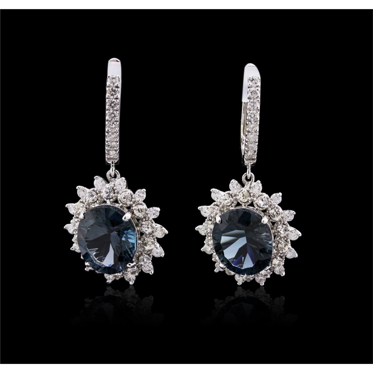 One pair electronically tested 14KT white gold ladies cast topaz and diamond earrings with hinged clip backs with a bright polish finish. Identified with markings of "14K". Condition is new. Containing: Two prong set oval modified mixed cut natural blue topazes, measuring 12.00 x 10.00 x 6.50mm, approximate total weight of 11.56ct., clarity is eye clean, type I, medium, moderately strong, greenish blue color, (GIA gB 5/4), cut is good. Seventy-Two prong set round brilliant cut diamonds, measuring 1.60 - 1.30 x 0.87mm (depth est.) approximate total weight of 72 Stones = 0.80ct. Clarity: SI-2 to I-1. Color: I - J, Cut is Good. Colored gemstones are presumed to have been subjected to commonly used enhancement processes. All diamonds and colored gemstones are graded in the mounting, unless otherwise stated. Total Weight of Colored Stones 11.56ct. Total Weight of Diamonds 0.80ct. Total Weight of Earrings 10.20 grams. GGL Appraised at $5,420.00.