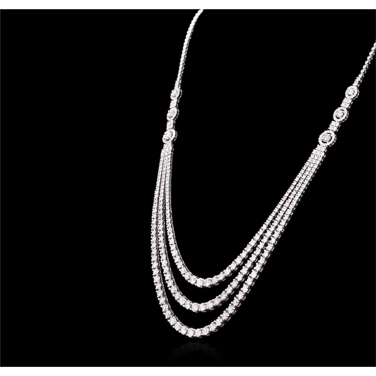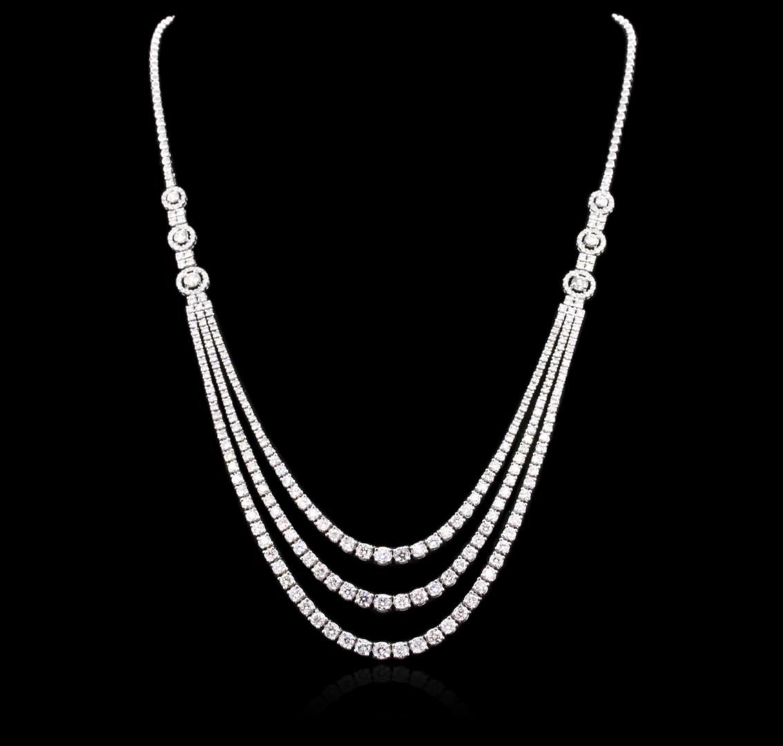 One electronically tested 14KT white gold ladies cast diamond necklace with a hidden box clasp with safety closer with a bright polish finish. Measurements: 16.85" in length Identified with markings of "14K". Condition is new. Containing: One Hundred Twenty prong set round brilliant cut diamonds, measuring 3.50 - 2.00 x 1.65mm (depth est.) approximate total weight of 120 Stones = 9.13ct. Clarity: SI-1 to I-1. Color: I - J, Cut is Good. Two Hundred One prong set round brilliant cut diamonds, measuring 1.50 - 1.50 x 0.90mm (depth est.) approximate total weight of 201 Stones = 2.47ct. Clarity: SI-2 to I-1. Color: I - J, Cut is Good. All diamonds are graded in the mounting, unless otherwise stated. Total Weight of Diamonds 11.60ct. Total Weight of Necklace 28.70 grams. GGL Appraised at $30,100.00.