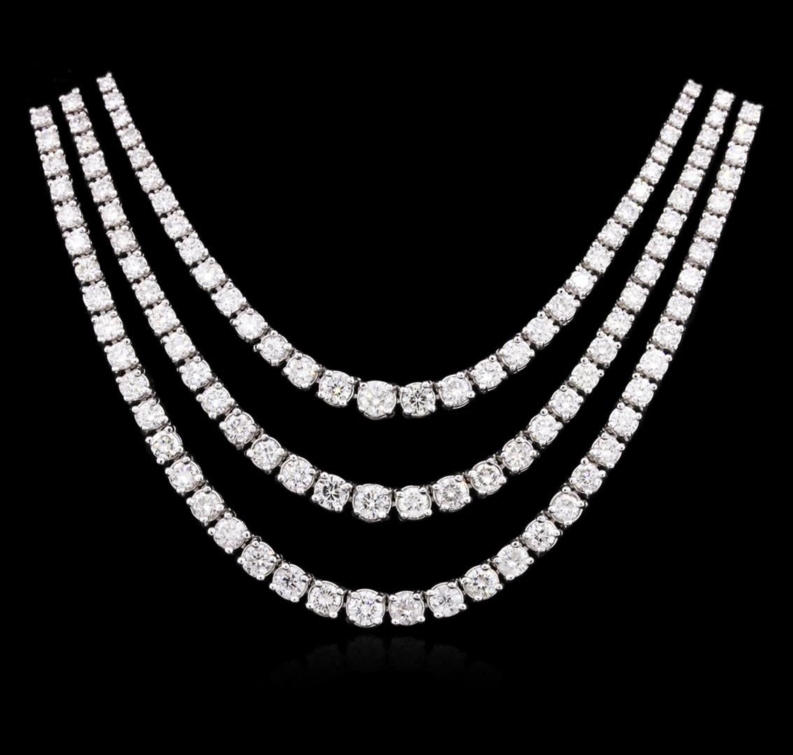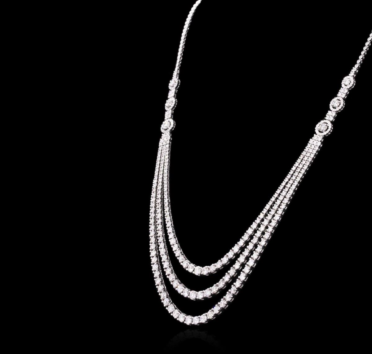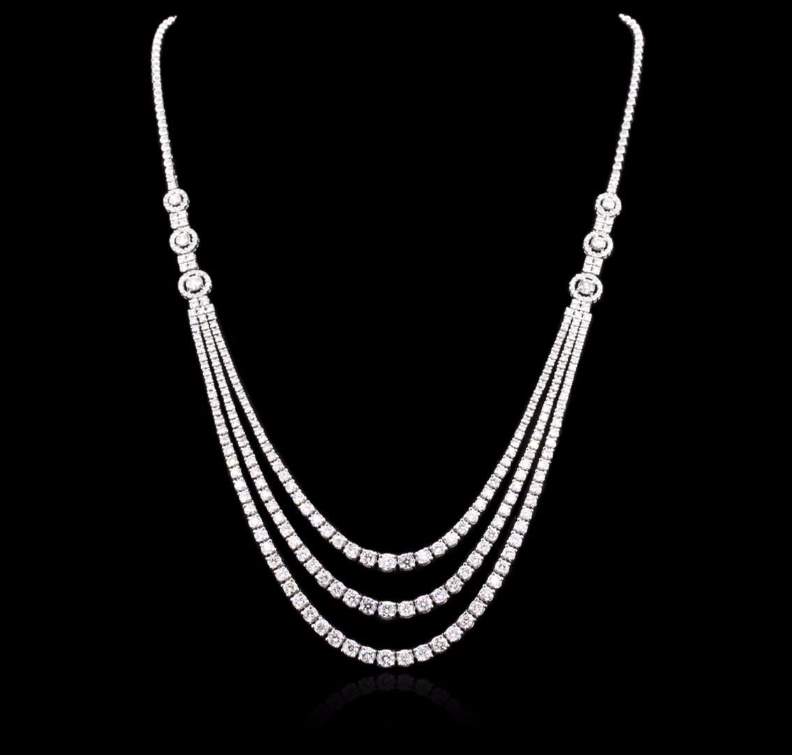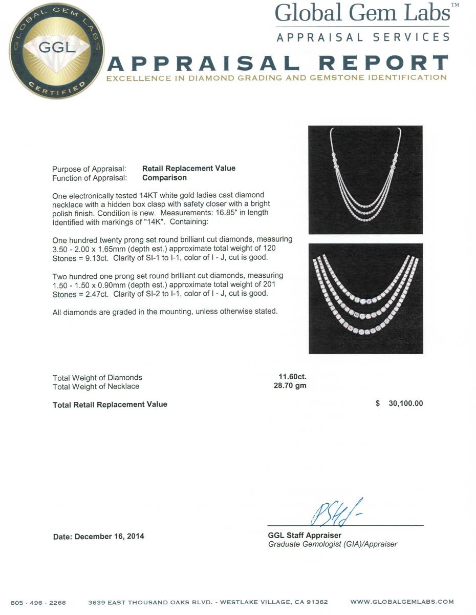 One electronically tested 14KT white gold ladies cast diamond necklace with a hidden box clasp with safety closer with a bright polish finish. Measurements: 16.85" in length Identified with markings of "14K". Condition is new. Containing: One Hundred Twenty prong set round brilliant cut diamonds, measuring 3.50 - 2.00 x 1.65mm (depth est.) approximate total weight of 120 Stones = 9.13ct. Clarity: SI-1 to I-1. Color: I - J, Cut is Good. Two Hundred One prong set round brilliant cut diamonds, measuring 1.50 - 1.50 x 0.90mm (depth est.) approximate total weight of 201 Stones = 2.47ct. Clarity: SI-2 to I-1. Color: I - J, Cut is Good. All diamonds are graded in the mounting, unless otherwise stated. Total Weight of Diamonds 11.60ct. Total Weight of Necklace 28.70 grams. GGL Appraised at $30,100.00.