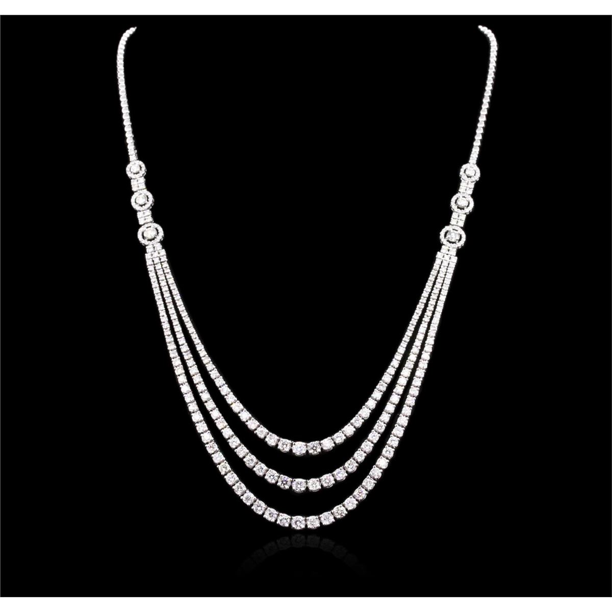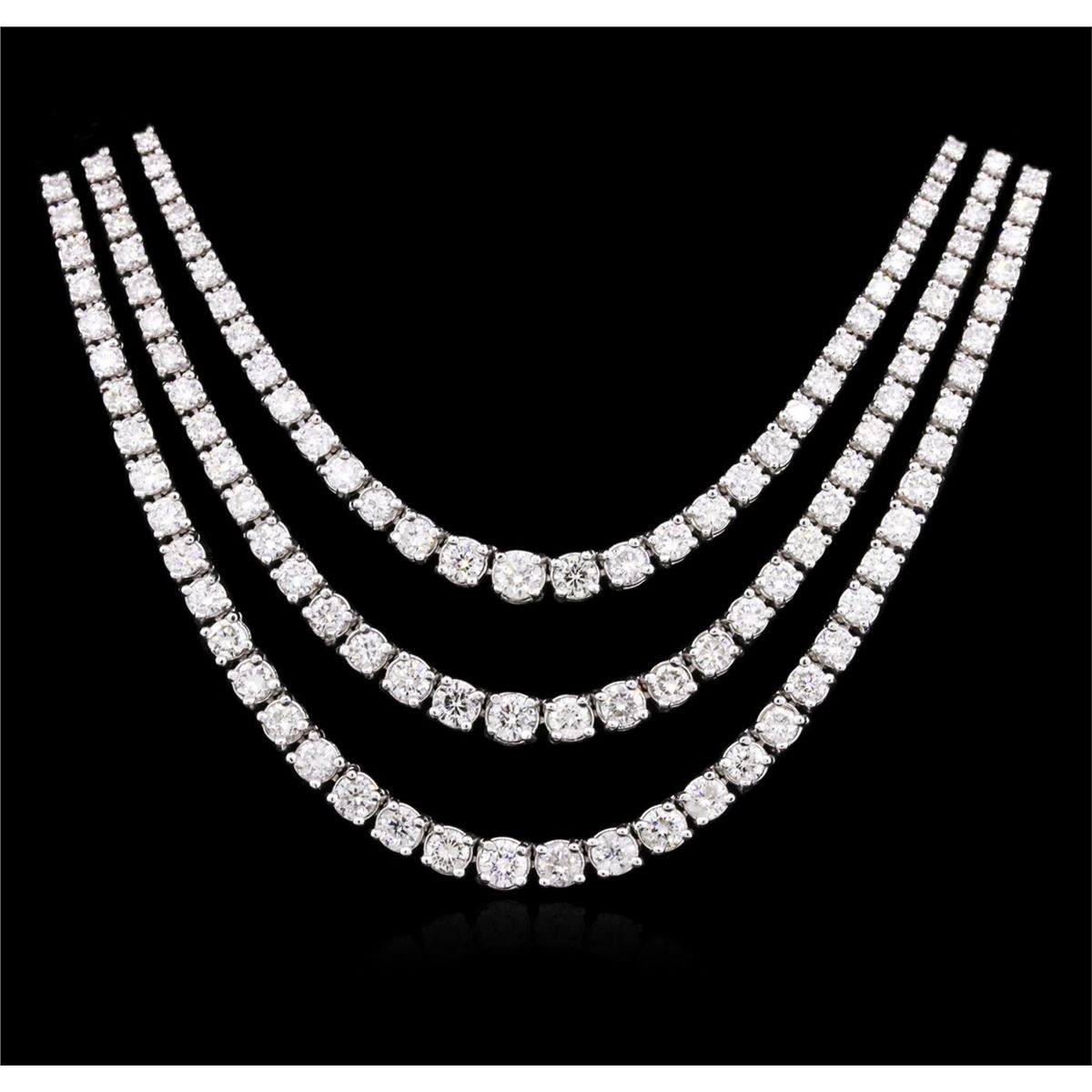 One electronically tested 14KT white gold ladies cast diamond necklace with a hidden box clasp with safety closer with a bright polish finish. Measurements: 16.85" in length Identified with markings of "14K". Condition is new. Containing: One Hundred Twenty prong set round brilliant cut diamonds, measuring 3.50 - 2.00 x 1.65mm (depth est.) approximate total weight of 120 Stones = 9.13ct. Clarity: SI-1 to I-1. Color: I - J, Cut is Good. Two Hundred One prong set round brilliant cut diamonds, measuring 1.50 - 1.50 x 0.90mm (depth est.) approximate total weight of 201 Stones = 2.47ct. Clarity: SI-2 to I-1. Color: I - J, Cut is Good. All diamonds are graded in the mounting, unless otherwise stated. Total Weight of Diamonds 11.60ct. Total Weight of Necklace 28.70 grams. GGL Appraised at $30,100.00.
