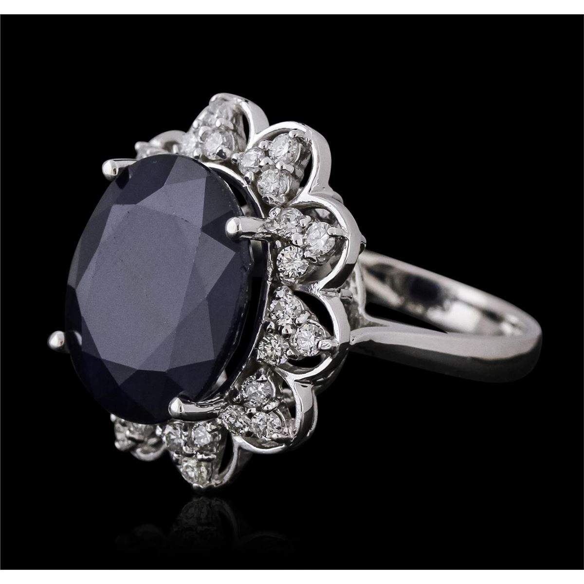 One electronically tested 14KT white gold ladies combination cast & assembled sapphire and diamond ring with a flat shank with a bright polish finish. Identified with markings of "K14". Condition is new. Containing: One prong set oval modified brilliant cut natural blue sapphire, measuring 15.15 x 13.03 x 7.31mm, approximate weight of 11.61ct., clarity is heavily included, type II, dark, strong, blue color, (GIA B 7/5), cut is good. Thirty prong set round brilliant cut diamonds, measuring 1.70 - 1.70 x 1.02mm (depth est.) approximate total weight of 30 Stones = 0.54ct. Clarity: SI-1 to I-1. Color: I - J, Cut is Good. Colored gemstones are presumed to have been subjected to commonly used enhancement processes. All diamonds and colored gemstones are graded in the mounting, unless otherwise stated. Total Weight of Colored Stones 11.61ct. Total Weight of Diamonds 0.54ct. Total Weight of Ring 8.50 grams. GGL Appraised at $6,410.00.