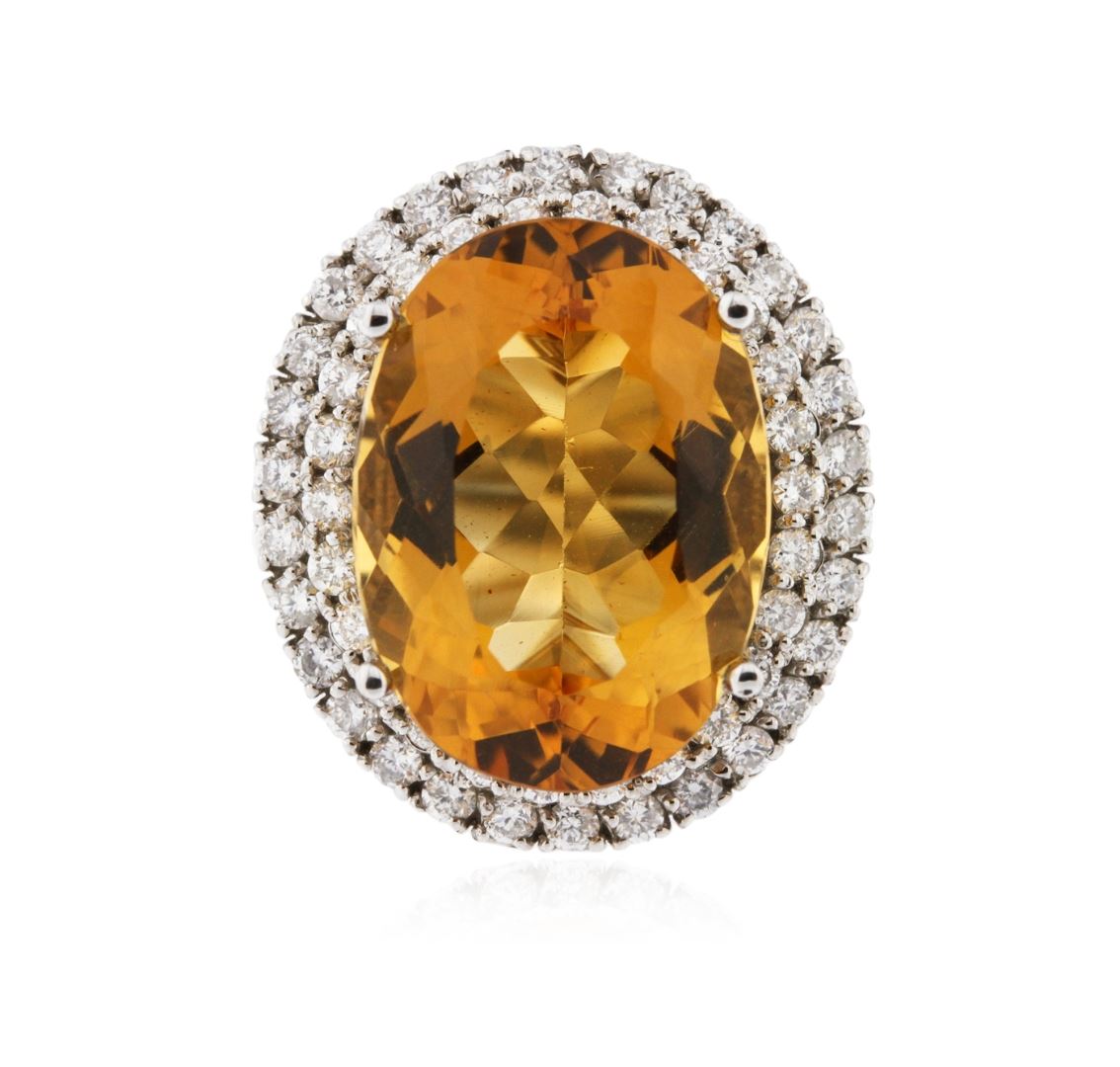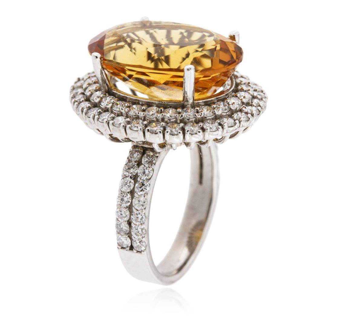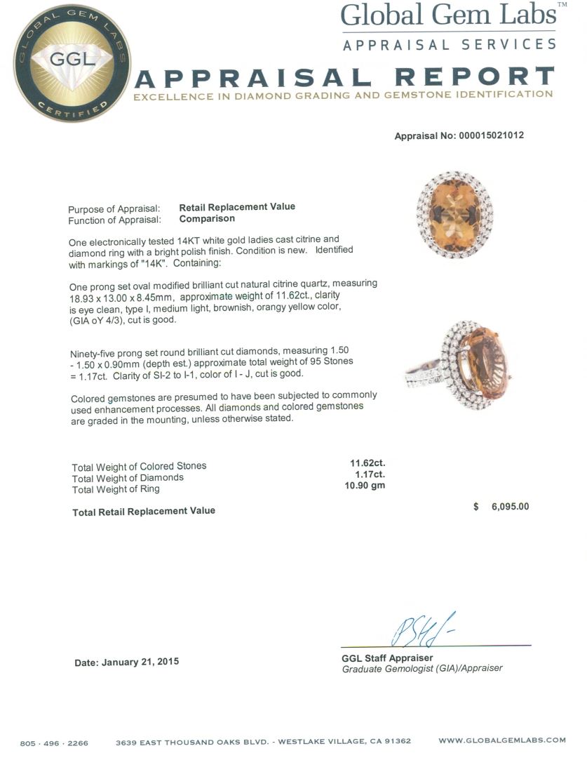 One electronically tested 14KT white gold ladies cast citrine and diamond ring with a bright polish finish. Identified with markings of "14K". Condition is new. Containing: One prong set oval modified brilliant cut natural citrine quartz, measuring 18.93 x 13.00 x 8.45mm, approximate weight of 11.62ct., clarity is eye clean, type I, medium light, brownish, orangy yellow color, (GIA oY 4/3), cut is good. Ninety-Five prong set round brilliant cut diamonds, measuring 1.50 - 1.50 x 0.90mm (depth est.) approximate total weight of 95 Stones = 1.17ct. Clarity: SI-2 to I-1. Color: I - J, Cut is Good. Colored gemstones are presumed to have been subjected to commonly used enhancement processes. All diamonds and colored gemstones are graded in the mounting, unless otherwise stated. Total Weight of Colored Stones 11.62ct. Total Weight of Diamonds 1.17ct. Total Weight of Ring 10.90 grams. GGL Appraised at $6,095.00.