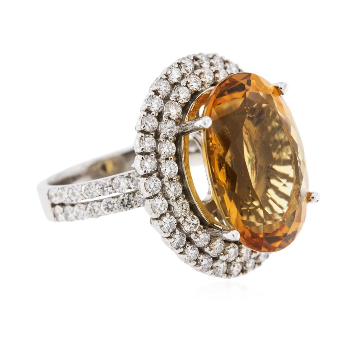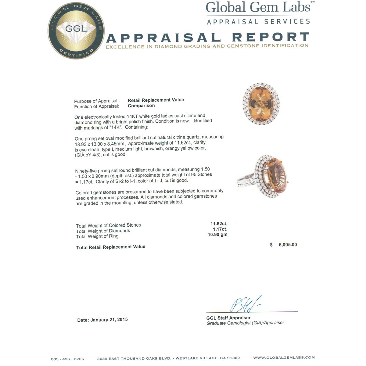 One electronically tested 14KT white gold ladies cast citrine and diamond ring with a bright polish finish. Identified with markings of "14K". Condition is new. Containing: One prong set oval modified brilliant cut natural citrine quartz, measuring 18.93 x 13.00 x 8.45mm, approximate weight of 11.62ct., clarity is eye clean, type I, medium light, brownish, orangy yellow color, (GIA oY 4/3), cut is good. Ninety-Five prong set round brilliant cut diamonds, measuring 1.50 - 1.50 x 0.90mm (depth est.) approximate total weight of 95 Stones = 1.17ct. Clarity: SI-2 to I-1. Color: I - J, Cut is Good. Colored gemstones are presumed to have been subjected to commonly used enhancement processes. All diamonds and colored gemstones are graded in the mounting, unless otherwise stated. Total Weight of Colored Stones 11.62ct. Total Weight of Diamonds 1.17ct. Total Weight of Ring 10.90 grams. GGL Appraised at $6,095.00.