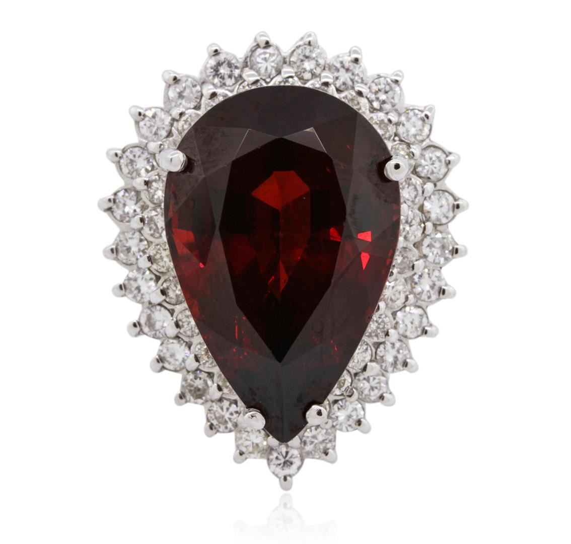 One electronically tested 14KT white gold ladies cast garnet and diamond ring with a bright polish finish. The featured garnet is set within two tiered diamond bezels, completed by a two and one-half millimeter wide band. Identified with markings of "14K". Condition is new, good workmanship. Containing: One prong set pear mixed cut natural almandite garnet, measuring 10.30 x 13.35 x 9.90mm, 6%. bulge factor, approximate weight of 11.69ct., clarity is eye clean, type II, dark, slightly brownish, orangy red color, (GIA oR 7/2), cut is good. Transmitting light with no distortion, transparent. Colored Stone Grading Report attached. Refractive index testing results of 1.80. This is a conclusive result for almandite garnet. Graded in the setting. Twenty-Seven prong set round brilliant cut diamonds, measuring 2.10 - 2.00 x 1.23mm (depth est.) approximate total weight of 27 Stones = 0.95ct. Graded in the setting. Clarity: SI-1 to I-1. Color: G - I Twenty-Six prong set round brilliant cut diamonds, measuring 1.70 - 1.60 x 0.99mm (depth est.) approximate total weight of 26 Stones = 0.52ct. Graded in the setting. Clarity: SI-1 to I-1. Color: H - J. Total Weight of Colored Stones 11.69ct. Total Weight of Diamonds 1.47ct. Total Weight of Ring 12.55 grams. AIG Appraised at $6,510.00.