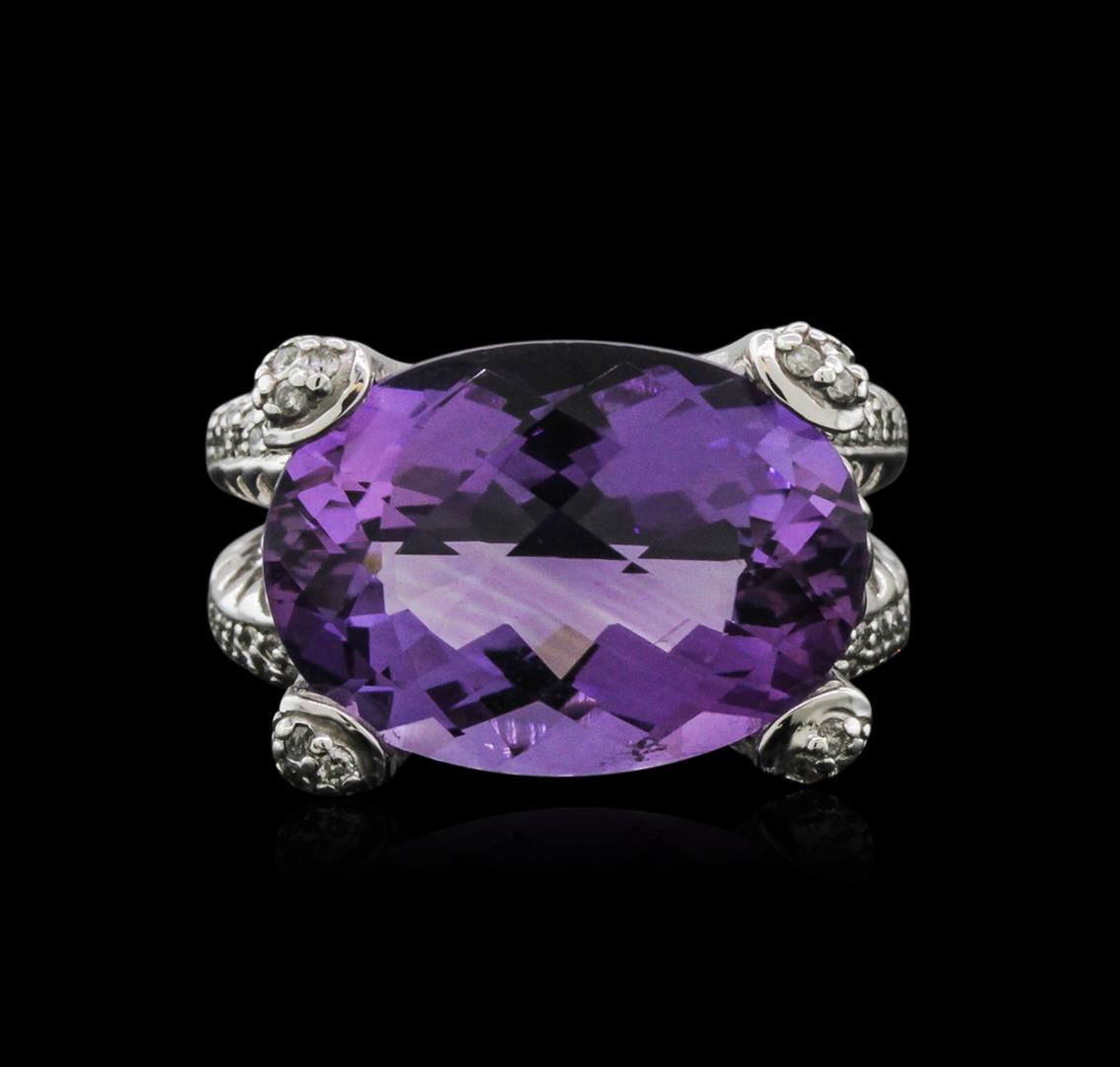 One electronically tested 14KT white gold ladies cast amethyst and diamond ring with a split shoulder shank with a bright polish finish. Trademark is EFFY. Identified with markings of "14K". Condition is new. Containing: One prong set oval modified mixed cut natural amethyst, measuring 17.94 x 12.94 x 9.03mm, approximate weight of 11.71ct., clarity is eye clean, type II, medium light, moderately strong, purple color, (GIA P 4/4), cut is good. Two Hundred Seventy-Two prong set round brilliant cut diamonds, measuring 1.00 - 1.00 x 0.60mm (depth est.) approximate total weight of 272 Stones = 0.98ct. Clarity of I-1 to I-2, Color of I - J. All diamonds and colored gemstones are graded in the mounting, unless otherwise stated. Colored gemstones are presumed to have been subjected to commonly used enhancement processes. Total Weight of Colored Stones 11.71ct. Total Weight of Diamonds 0.98ct. Total Weight of Ring 12.00 grams. GGL Appraised at $4,405.00.
