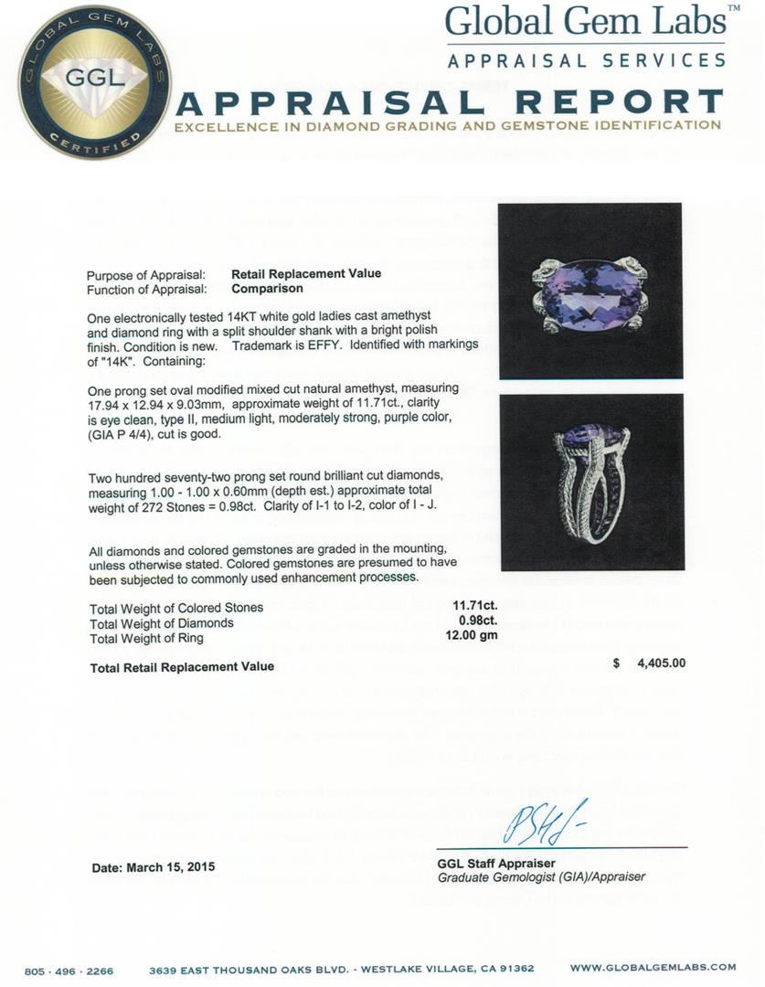 One electronically tested 14KT white gold ladies cast amethyst and diamond ring with a split shoulder shank with a bright polish finish. Trademark is EFFY. Identified with markings of "14K". Condition is new. Containing: One prong set oval modified mixed cut natural amethyst, measuring 17.94 x 12.94 x 9.03mm, approximate weight of 11.71ct., clarity is eye clean, type II, medium light, moderately strong, purple color, (GIA P 4/4), cut is good. Two Hundred Seventy-Two prong set round brilliant cut diamonds, measuring 1.00 - 1.00 x 0.60mm (depth est.) approximate total weight of 272 Stones = 0.98ct. Clarity of I-1 to I-2, Color of I - J. All diamonds and colored gemstones are graded in the mounting, unless otherwise stated. Colored gemstones are presumed to have been subjected to commonly used enhancement processes. Total Weight of Colored Stones 11.71ct. Total Weight of Diamonds 0.98ct. Total Weight of Ring 12.00 grams. GGL Appraised at $4,405.00.