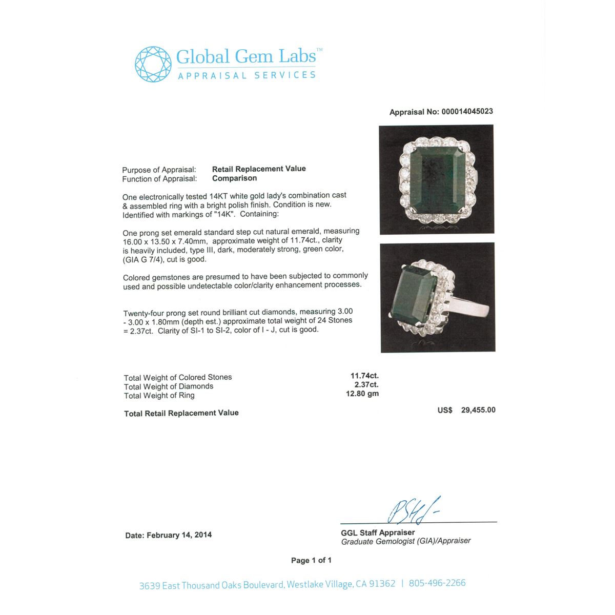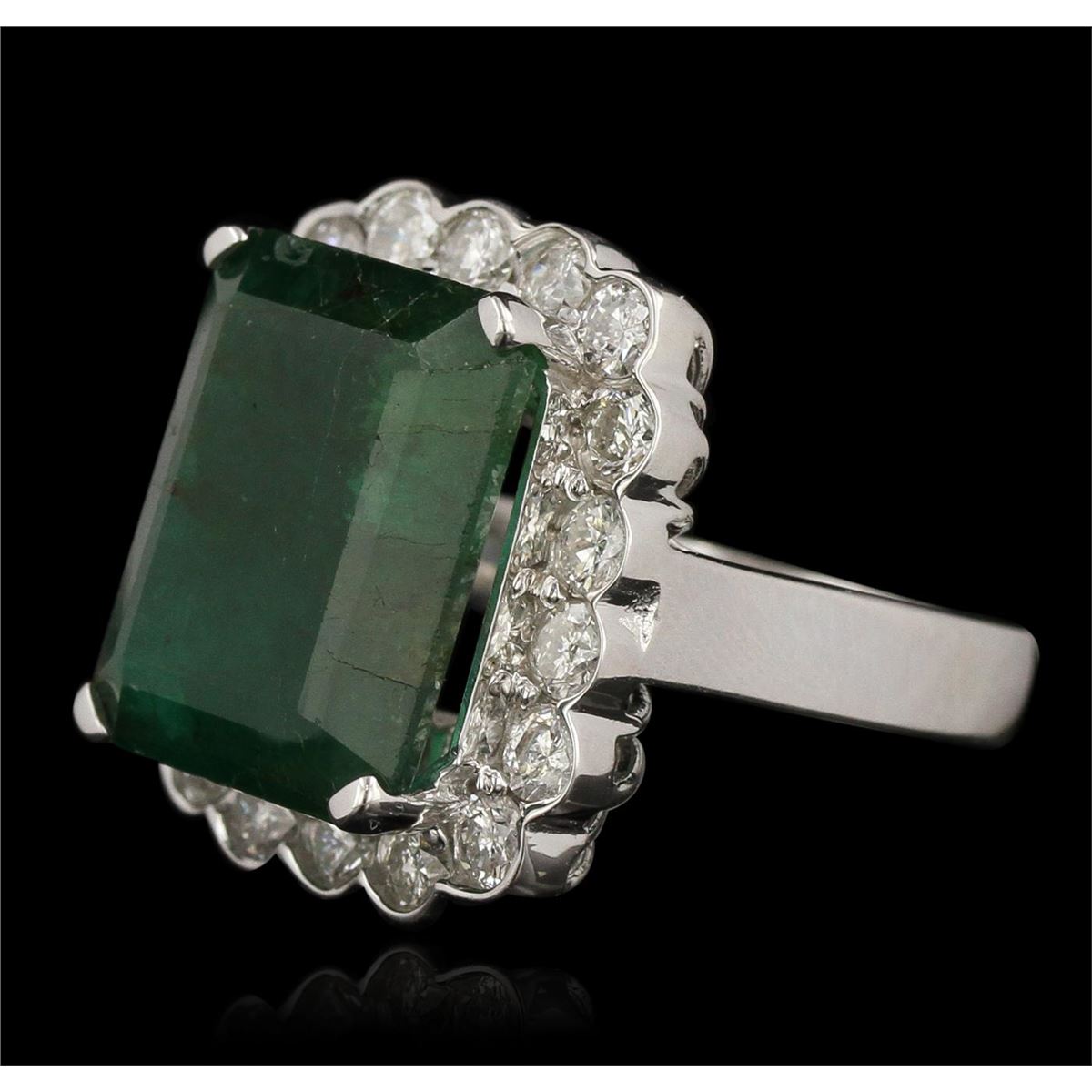 One electronically tested 14KT white gold Ladies combination cast & assembled ring with a bright polish finish. Condition is new. Identified with markings of "14K". Containing: One prong set emerald standard step cut natural emerald, measuring 16.00 x 13.50 x 7.40mm, approximate weight of 11.74ct., clarity is heavily included, type III, dark, moderately strong, green color, (GIA G 7/4), cut is good. Colored gemstones are presumed to have been subjected to commonly used and possible undetectable color/clarity enhancement processes. Twenty-Four prong set round brilliant cut diamonds, measuring 3.00 - 3.00 x 1.80mm (depth est.) approximate total weight of 24 Stones = 2.37ct. Clarity of SI-1 to SI-2, Color of I - J, Cut is Good. Total Weight of Colored Stones 11.74ct. Total Weight of Diamonds 2.37ct. Total Weight of Ring 12.80gm. GGL Appraised at $29,455.00.