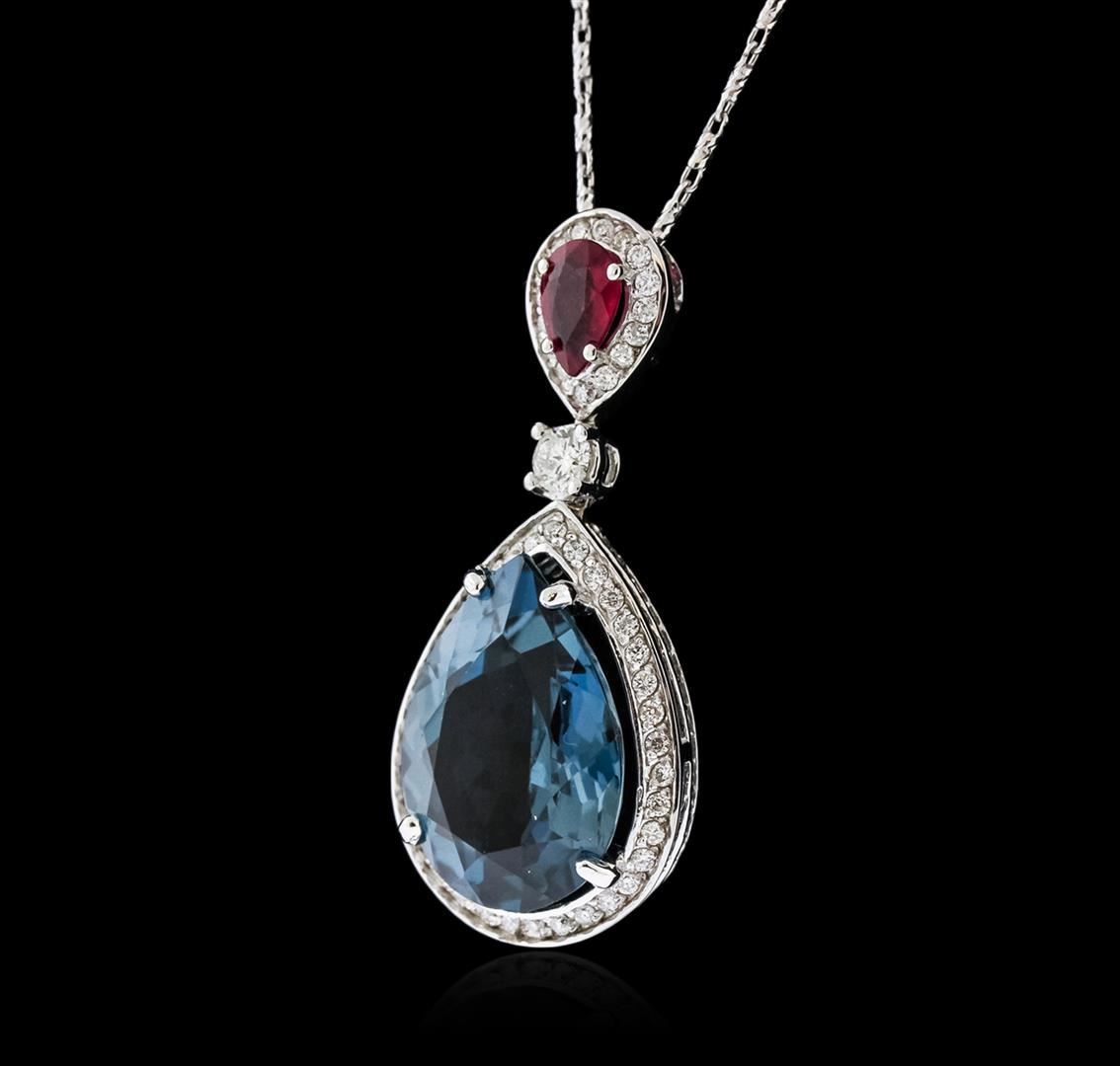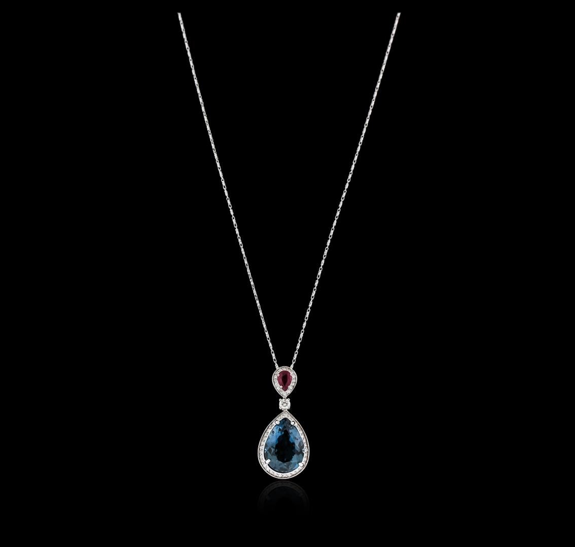 One electronically tested 14KT white gold ladies cast topaz, ruby and diamond pendant & chain 18.0" long, with a lobster claw clasp with a bright polish finish. Identified with markings of "14K". Condition is new. Containing: One prong set pear modified brilliant cut natural blue topaz, measuring 17.65 x 12.74 x 7.41mm, approximate weight of 11.76ct., clarity is eye clean, type I, medium light, very slightly grayish, very slightly greenish blue color, (GIA vslgB 4/3), cut is good. One prong set pear modified brilliant cut natural ruby, measuring 6.50 x 4.50 x 2.93mm, approximate weight of 0.69ct., clarity is heavily included, medium, moderately strong, strongly purplish red color, (GIA stpR 5/4), cut is good. One prong set round brilliant cut diamond, measuring 3.50 - 3.50 x 2.10mm (depth est.) approximate weight of 0.16ct. Clarity: SI-1. Color: I, Cut is Good. Eighty-Eight prong set round brilliant cut diamonds, measuring 1.30 - 1.30 x 0.78mm (depth est.) approximate total weight of 88 Stones = 0.70ct. Clarity: SI-2 to I-1. Color: I - J, Cut is Good. Colored gemstones are presumed to have been subjected to commonly used enhancement processes. All diamonds and colored gemstones are graded in the mounting, unless otherwise stated. Total Weight of Colored Stones 12.45ct. Total Weight of Diamonds 0.86ct. Total Weight of Pendant & Chain 9.30 grams. GGL Appraised at $5,010.00.