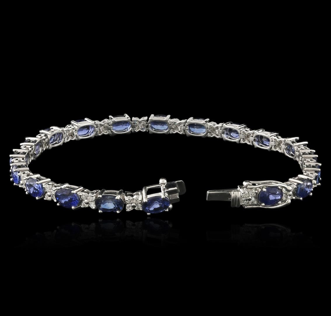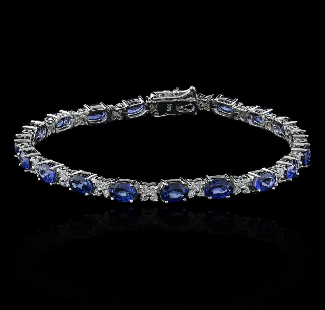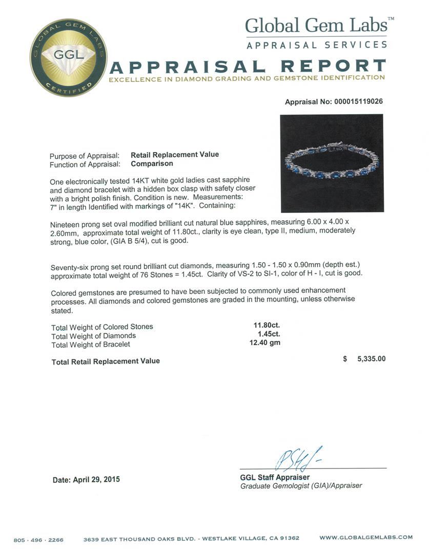 One electronically tested 14KT white gold ladies cast sapphire and diamond bracelet with a hidden box clasp with safety closer with a bright polish finish. Measurements: 7" in length Identified with markings of "14K". Condition is new. Containing: Nineteen prong set oval modified brilliant cut natural blue sapphires, measuring 6.00 x 4.00 x 2.60mm, approximate total weight of 11.80ct., clarity is eye clean, type II, medium, moderately strong, blue color, (GIA B 5/4), cut is good. Seventy-Six prong set round brilliant cut diamonds, measuring 1.50 - 1.50 x 0.90mm (depth est.) approximate total weight of 76 Stones = 1.45ct. Clarity: VS-2 to SI-1. Color: H - I, Cut is Good. Colored gemstones are presumed to have been subjected to commonly used enhancement processes. All diamonds and colored gemstones are graded in the mounting, unless otherwise stated. Total Weight of Colored Stones 11.80ct. Total Weight of Diamonds 1.45ct. Total Weight of Bracelet 12.40 grams. GGL Appraised at $5,335.00.