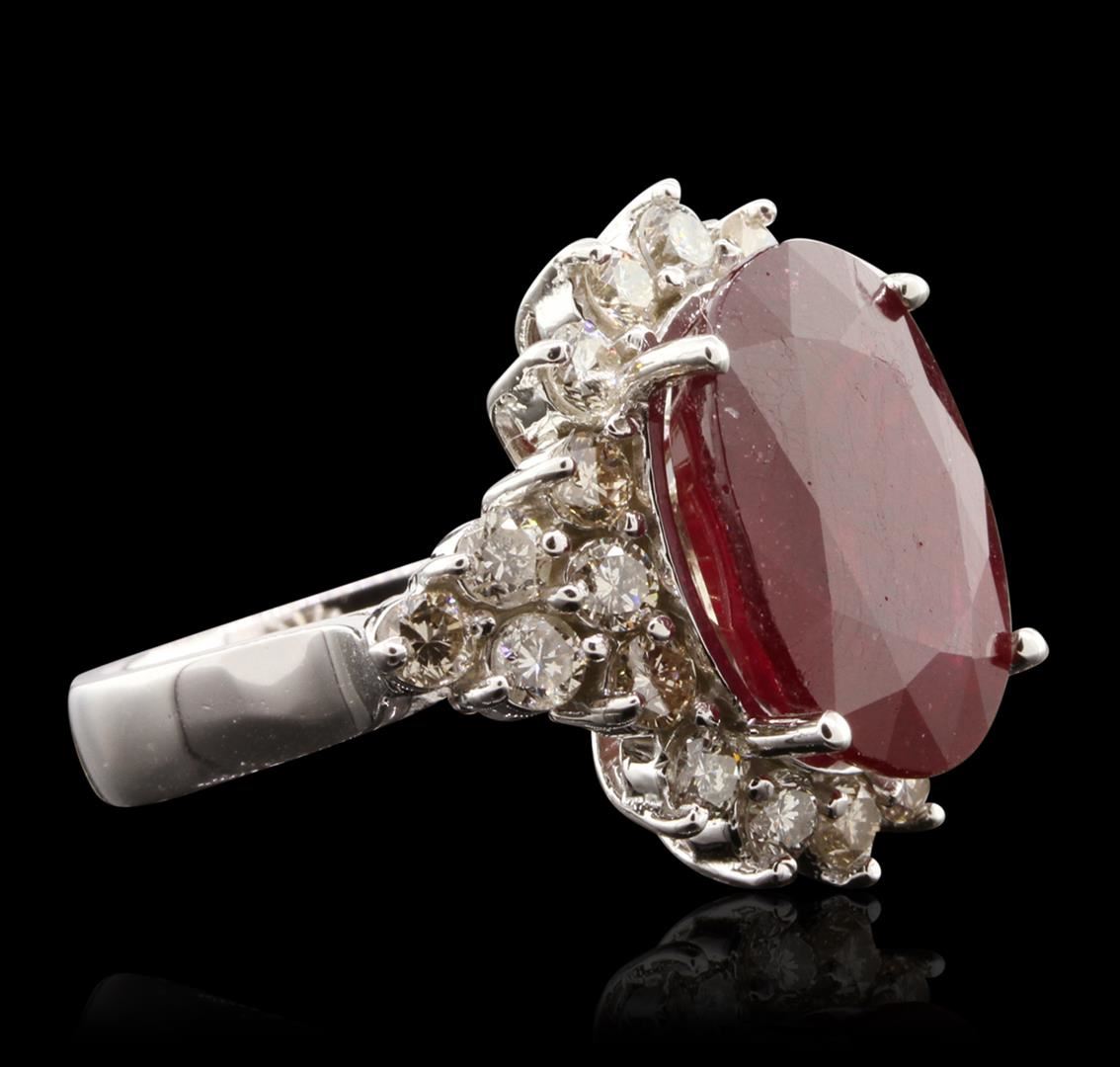 One electronically tested 14KT white gold ladies cast ruby and diamond ring with a bright polish finish. The featured ruby is set within a diamond set bezel supported by diamond set shoulders, completed by a four millimeter wide band. Identified with markings of "K14". Condition is new, good workmanship. Containing: One prong set oval mixed cut natural ruby, measuring 16.00 x 11.95 x 6.85mm, 10%. bulge factor, approximate weight of 11.87ct., clarity is heavily included, type II, dark, very slightly brownish, red color, (GIA R 7/3), cut is good. Transmitting light somewhat diffusely, transparent to translucent. Naturally occurring internal & external characteristics are present. Indications of laboratory high temperature heat treatment, with glass & flux additives. Colored Stone Grading Report attached. Graded in the setting. Ruby has a low tolerance to rhodium plating, repolishing the surface, & ultrasonic cleaning. Twenty-Two prong set round brilliant cut diamonds, measuring 2.80 - 2.70 x 1.65mm (depth est.) approximate. Total Weight of 22 Stones = 1.77ct. Graded in the setting. Clarity: SI-1 to I-1 . Total Weight of Colored Stones 11.87ct. Total Weight of Diamonds 1.77ct. AIG Appraised at $8,790.00.