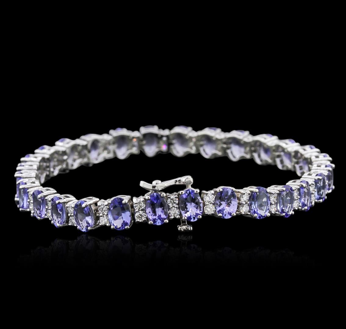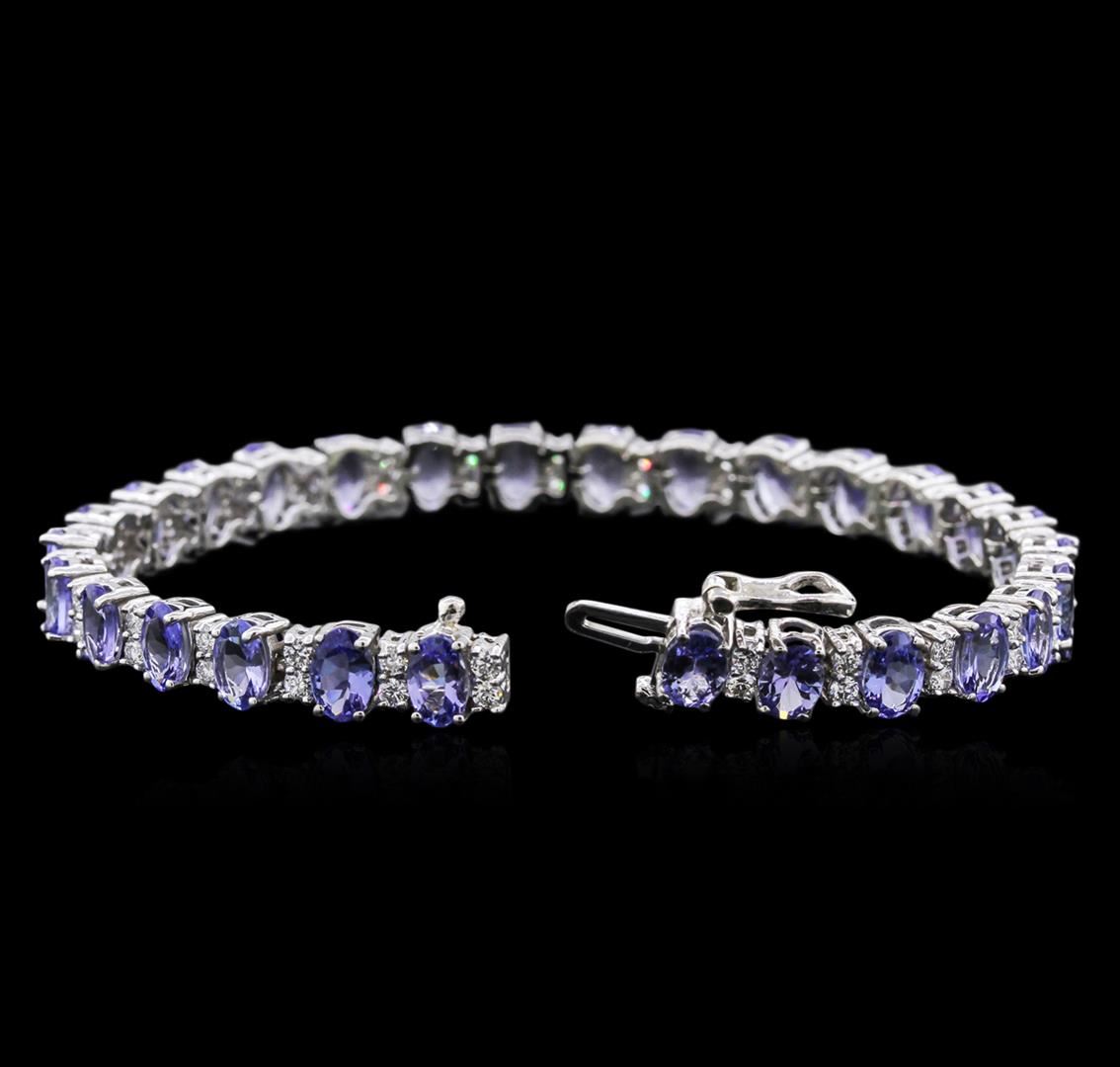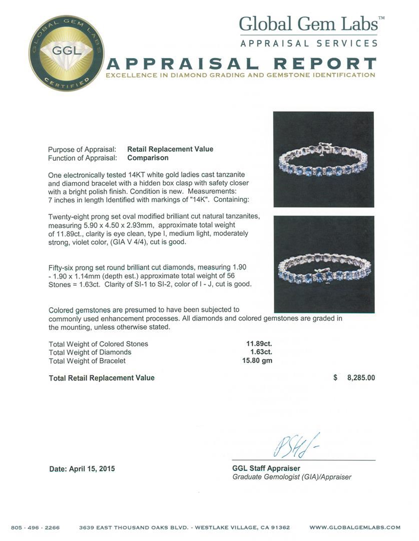 One electronically tested 14KT white gold ladies cast tanzanite and diamond bracelet with a hidden box clasp with safety closer with a bright polish finish. Condition is new. Measurements: 7 inches in length Identified with markings of "14K". Containing: Twenty-eight prong set oval modified brilliant cut natural tanzanites, measuring 5.90 x 4.50 x 2.93mm, approximate total weight of 11.89ct., clarity is eye clean, type I, medium light, moderately strong, violet color, (GIA V 4/4), cut is good. Fifty-six prong set round brilliant cut diamonds, measuring 1.90 - 1.90 x 1.14mm (depth est.) approximate total weight of 56 Stones = 1.63ct. Clarity of SI-1 to SI-2, color of I - J, cut is good. Colored gemstones are presumed to have been subjected to commonly used enhancement processes. All diamonds and colored gemstones are graded in the mounting, unless otherwise stated. Total Weight of Colored Stones 11.89ct.Total Weight of Diamonds 1.63ct. Total Weight of Bracelet 15.80 grams. GGL Appraised at $8,285.00.