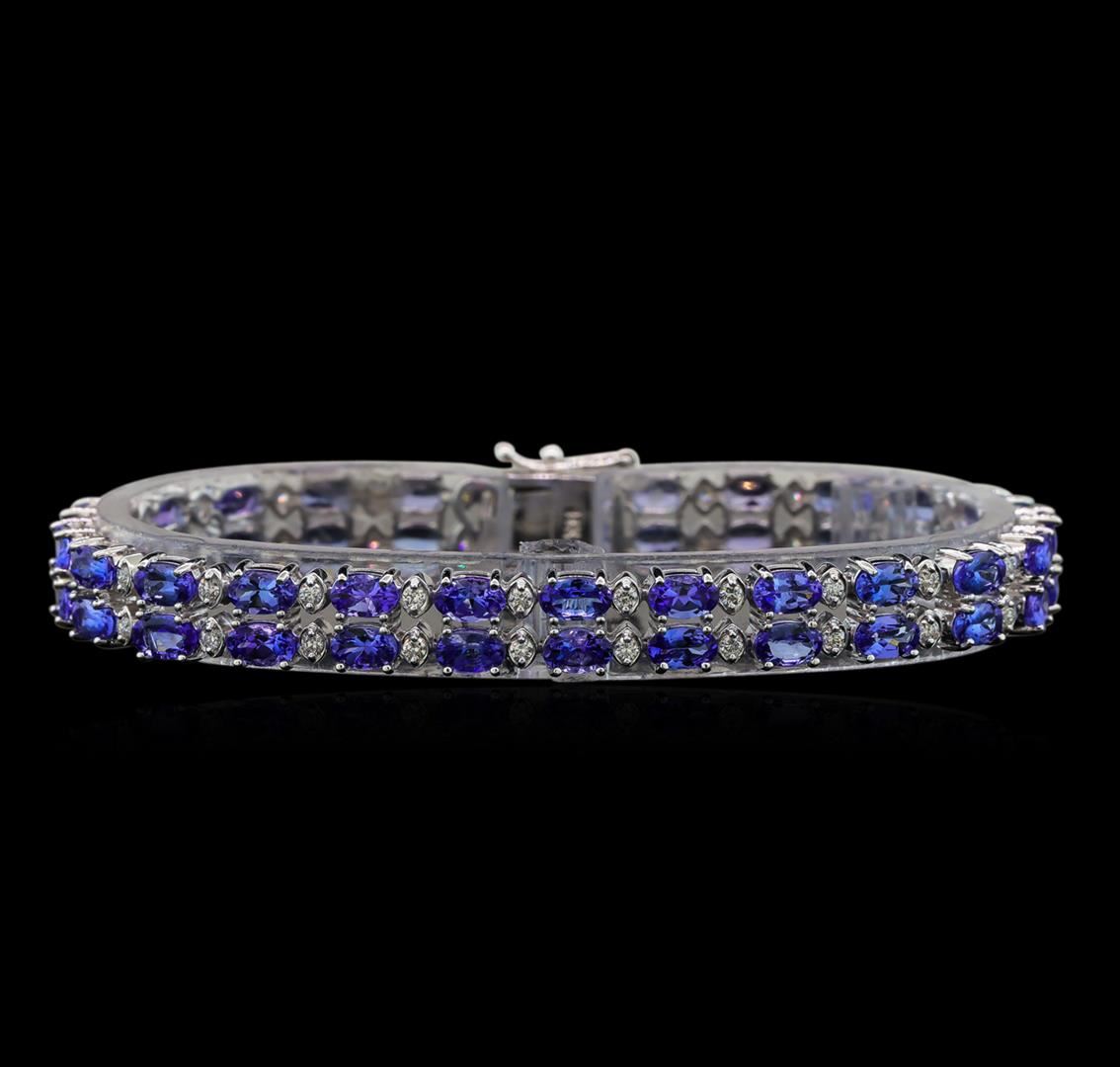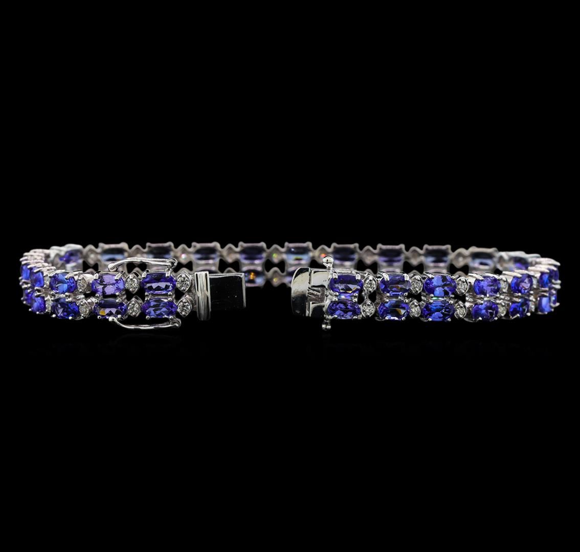 One electronically tested 14KT white gold ladies cast tanzanite and diamond bracelet with a hidden box clasp with safety closer with a bright polish finish. Measurements: 7" in length Identified with markings of "14K". Condition is new. Containing: Forty-eight prong set oval modified brilliant cut natural tanzanites, measuring 5.00 x 3.00 x 1.95mm, approximate total weight of 11.90ct., clarity is eye clean, type I, medium light, very slightly grayish, violet color, (GIA V 4/3), cut is good. Forty-Eight prong set round brilliant cut diamonds, measuring 1.50 - 1.50 x 0.90mm (depth est.) approximate total weight of 48 Stones = 0.95ct. Clarity: SI-1 to SI-2. Color: H - I, Cut is Good. Colored gemstones are presumed to have been subjected to commonly used enhancement processes. All diamonds and colored gemstones are graded in the mounting, unless otherwise stated. Total Weight of Colored Stones 11.90ct. Total Weight of Diamonds 0.95ct. Total Weight of Bracelet 17.50 grams. GGL Appraised at $8,415.00.