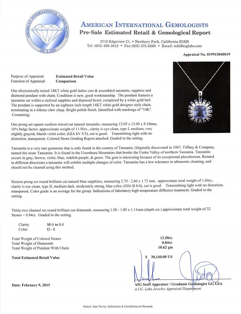 One electronically tested 14KT white gold ladies cast & assembled tanzanite, sapphire and diamond pendant with chain. The pendant features a tanzanite set within a stylized sapphire and diamond bezel, completed by a white gold bail. The pendant is supported by an eighteen inch length 14KT white gold designer style chain, terminating in a lobster claw clasp. Bright polish finish. Identified with markings of "14K". Condition is new, good workmanship. Containing: One prong set square cushion mixed cut natural tanzanite, measuring 13.05 x 13.00 x 8.10mm, 10% bulge factor, approximate weight of 11.90ct., clarity is eye clean, type I, medium, very slightly grayish, bluish violet color, (GIA bV 5/3), cut is good. Transmitting light with no distortion, transparent. Colored Stone Grading Report attached. Graded in the setting. Tanzanite is a very rare gemstone that is only found in the country of Tanzania. Originally discovered in 1967. Tiffany & Company, named the stone Tanzanite. It is found in the Usumburu Mountains that border the Umba Valley of northern Tanzania. Tanzanite occurs in gray, brown, violet, blue, reddish-purple, & green. The gem is interesting because of its exceptional pleochroism. Rotated in different directions a tanzanite will exhibit multiple changes of color. Tanzanite has a low tolerance to ultrasonic cleaning, and should not be cleaned using this method. Sixteen prong set round brilliant cut natural blue sapphires, measuring 2.70 - 2.60 x 1.72 mm, approximate total weight of 1.60ct., clarity is eye clean, type II, medium dark, moderately strong, blue color, (GIA B 6/4), cut is good. Transmitting light with no distortion, transparent. Color grade is an average for the group. Indications of laboratory high temperature diffusion treatment. Graded in the setting. Thirty-Two channel set round brilliant cut diamonds, measuring 1.90 - 1.80 x 1.11mm (depth est.) approximate total weight of 32 Stones = 0.84ct. Graded in the setting. Clarity: SI-1 to I-1. Color: G - I. Total Weight of Colored Stones 13.50ct. Total Weight of Diamonds 0.84ct. Total Weight of Pendant With Chain 10.62 grams. AIG Appraised at $30,140.00.