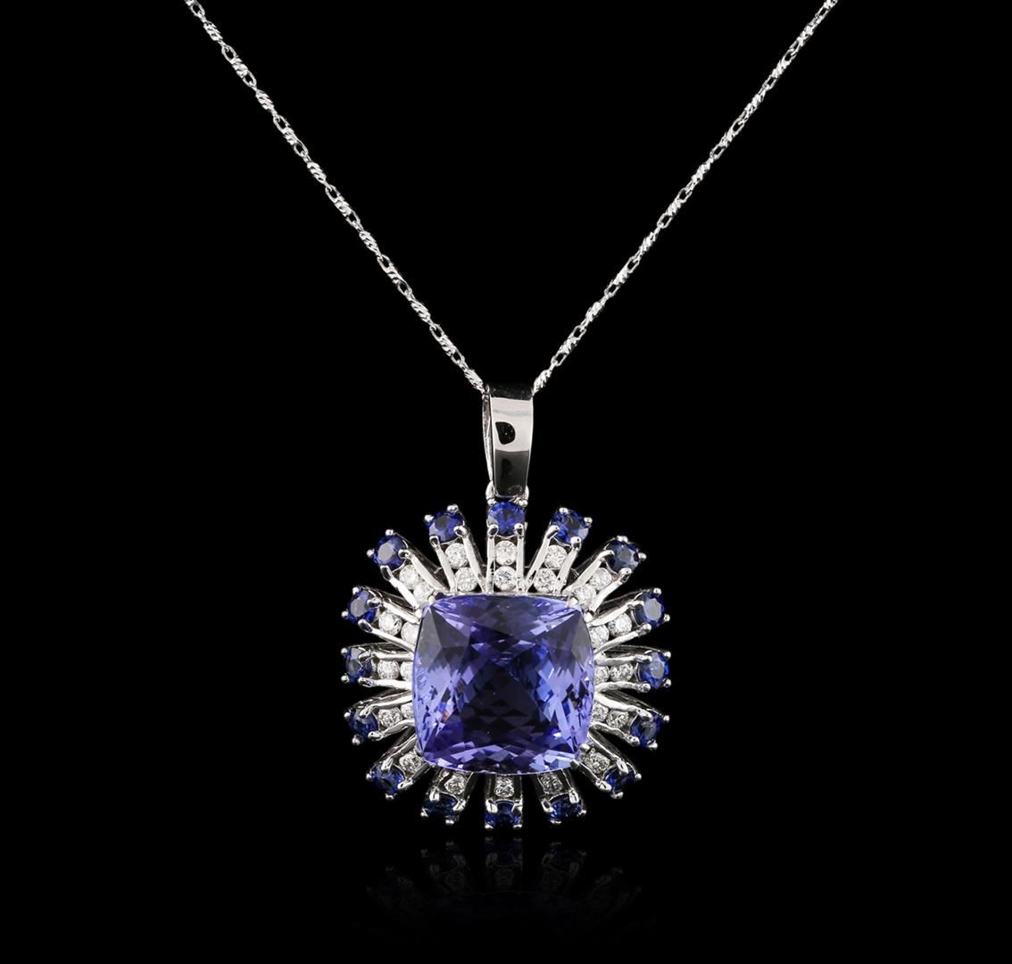One electronically tested 14KT white gold ladies cast & assembled tanzanite, sapphire and diamond pendant with chain. The pendant features a tanzanite set within a stylized sapphire and diamond bezel, completed by a white gold bail. The pendant is supported by an eighteen inch length 14KT white gold designer style chain, terminating in a lobster claw clasp. Bright polish finish. Identified with markings of "14K". Condition is new, good workmanship. Containing: One prong set square cushion mixed cut natural tanzanite, measuring 13.05 x 13.00 x 8.10mm, 10% bulge factor, approximate weight of 11.90ct., clarity is eye clean, type I, medium, very slightly grayish, bluish violet color, (GIA bV 5/3), cut is good. Transmitting light with no distortion, transparent. Colored Stone Grading Report attached. Graded in the setting. Tanzanite is a very rare gemstone that is only found in the country of Tanzania. Originally discovered in 1967. Tiffany & Company, named the stone Tanzanite. It is found in the Usumburu Mountains that border the Umba Valley of northern Tanzania. Tanzanite occurs in gray, brown, violet, blue, reddish-purple, & green. The gem is interesting because of its exceptional pleochroism. Rotated in different directions a tanzanite will exhibit multiple changes of color. Tanzanite has a low tolerance to ultrasonic cleaning, and should not be cleaned using this method. Sixteen prong set round brilliant cut natural blue sapphires, measuring 2.70 - 2.60 x 1.72 mm, approximate total weight of 1.60ct., clarity is eye clean, type II, medium dark, moderately strong, blue color, (GIA B 6/4), cut is good. Transmitting light with no distortion, transparent. Color grade is an average for the group. Indications of laboratory high temperature diffusion treatment. Graded in the setting. Thirty-Two channel set round brilliant cut diamonds, measuring 1.90 - 1.80 x 1.11mm (depth est.) approximate total weight of 32 Stones = 0.84ct. Graded in the setting. Clarity: SI-1 to I-1. Color: G - I. Total Weight of Colored Stones 13.50ct. Total Weight of Diamonds 0.84ct. Total Weight of Pendant With Chain 10.62 grams. AIG Appraised at $30,140.00.