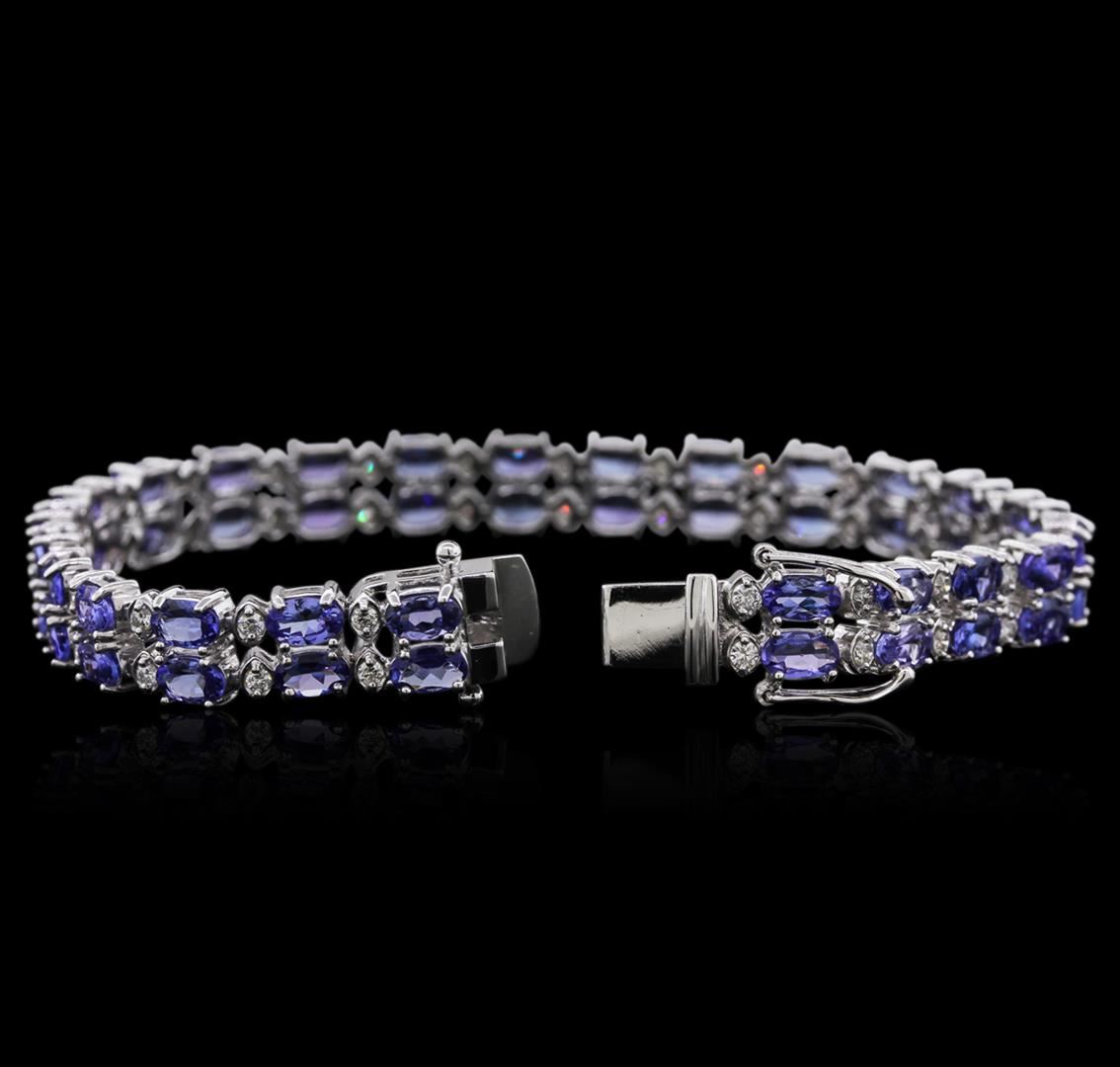 One electronically tested 14KT white gold ladies cast tanzanite and diamond bracelet with a hidden box clasp with safety closer with a bright polish finish. Measurements: 7" in length Identified with markings of "14K". Condition is new. Containing: Forty-eight prong set oval modified brilliant cut natural tanzanites, measuring 5.00 x 3.00 x 1.95mm, approximate total weight of 11.90ct., clarity is eye clean, type I, medium light, very slightly grayish, violet color, (GIA V 4/3), cut is good. Forty-Eight prong set round brilliant cut diamonds, measuring 1.50 - 1.50 x 0.90mm (depth est.) approximate total weight of 48 Stones = 0.95ct. Clarity: SI-1 to SI-2. Color: H - I, Cut is Good. Colored gemstones are presumed to have been subjected to commonly used enhancement processes. All diamonds and colored gemstones are graded in the mounting, unless otherwise stated. Total Weight of Colored Stones 11.90ct. Total Weight of Diamonds 0.95ct. Total Weight of Bracelet 17.50 grams. GGL Appraised at $8,415.00.