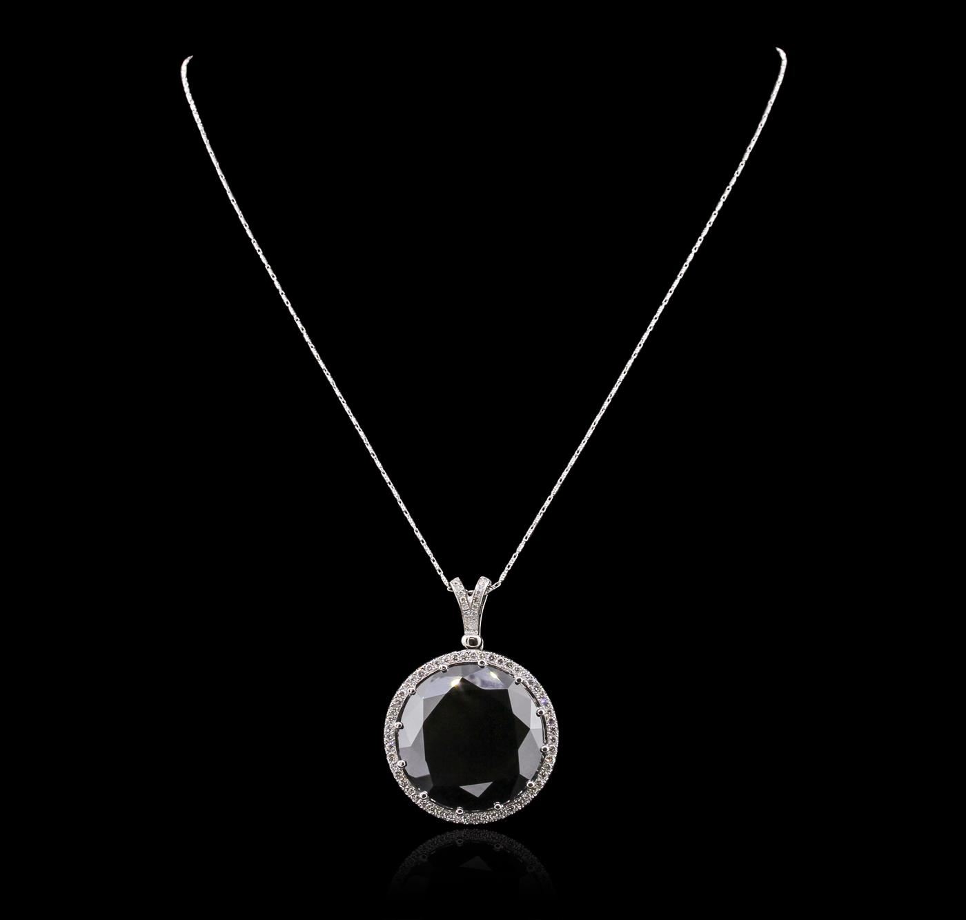 One electronically tested 14KT white gold ladies cast & assembled black and white diamond pendant with chain. Condition is new, good workmanship. The pendant features a black diamond set within a white diamond bezel, completed by a diamond set split bail. The pendant is supported by a twenty-two inch length designer style chain, terminating in a lobster claw clasp. Area measurements 2.25 x 1.50 inch. Bright polish finish. Identified with markings of "14K". Containing: One prong set round brilliant cut diamond, measuring 33.00 - 33.00 x 16.00mm (depth est.), 8.00.%. GTCF approximate weight of 114.88ct. Indications of multiple laboratory enhancements. The specific gravity of black diamond is 3.120 to 3.165. Diamond tester results are non reactive. Graded in the setting. Clarity Declasse,. Color: Fancy Black; Irradiated. Depth: 48.5%. Table: 66.7%. Fifty-Five prong set round brilliant cut diamonds, measuring 2.10 - 2.00 x 1.23mm (depth est.) approximate. Total Weight of 55 Stones = 1.83ct. Graded in the setting. Clarity: VS-1 to SI-1. Color: G - I Sixteen bead set round brilliant cut diamonds, measuring 1.60 - 1.40 x 0.90mm (depth est.) approximate. Total Weight of 16 Stones = 0.26ct. Graded in the setting. Clarity: VS-2 to SI-2. Color: G - I. Total Weight of Diamonds116.97ct. Total Weight of Pendant With Chain 55.30 grams. AIG Appraised at $26,815.00.