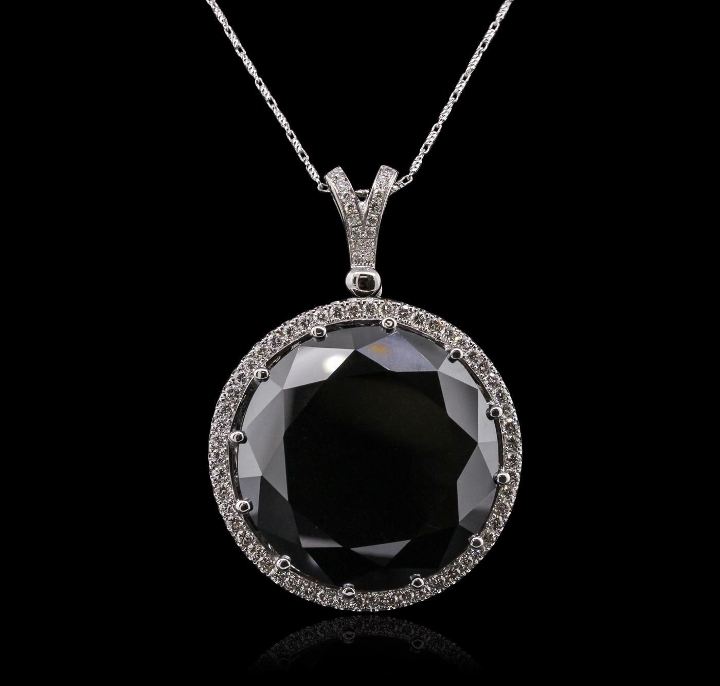 One electronically tested 14KT white gold ladies cast & assembled black and white diamond pendant with chain. Condition is new, good workmanship. The pendant features a black diamond set within a white diamond bezel, completed by a diamond set split bail. The pendant is supported by a twenty-two inch length designer style chain, terminating in a lobster claw clasp. Area measurements 2.25 x 1.50 inch. Bright polish finish. Identified with markings of "14K". Containing: One prong set round brilliant cut diamond, measuring 33.00 - 33.00 x 16.00mm (depth est.), 8.00.%. GTCF approximate weight of 114.88ct. Indications of multiple laboratory enhancements. The specific gravity of black diamond is 3.120 to 3.165. Diamond tester results are non reactive. Graded in the setting. Clarity Declasse,. Color: Fancy Black; Irradiated. Depth: 48.5%. Table: 66.7%. Fifty-Five prong set round brilliant cut diamonds, measuring 2.10 - 2.00 x 1.23mm (depth est.) approximate. Total Weight of 55 Stones = 1.83ct. Graded in the setting. Clarity: VS-1 to SI-1. Color: G - I Sixteen bead set round brilliant cut diamonds, measuring 1.60 - 1.40 x 0.90mm (depth est.) approximate. Total Weight of 16 Stones = 0.26ct. Graded in the setting. Clarity: VS-2 to SI-2. Color: G - I. Total Weight of Diamonds116.97ct. Total Weight of Pendant With Chain 55.30 grams. AIG Appraised at $26,815.00.