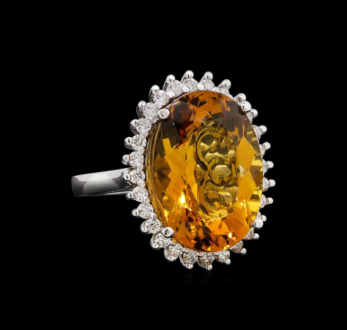 One electronically tested 14KT white gold ladies combination cast & assembled citrine and diamond ring with a bright polish finish. Identified with markings of "14K". Condition is new. Containing: One prong set oval modified brilliant cut natural citrine quartz, measuring 17.93 x 13.58 x 8.82mm, approximate weight of 12.00ct., clarity is eye clean, type I, medium light, brownish, orangy yellow color, (GIA oY 4/3), cut is good. Thirty prong set round brilliant cut diamonds, measuring 2.00 - 2.00 x 1.20mm (depth est.) approximate total weight of 30 Stones = 0.88ct. Clarity: SI-2 to I-1. Color: I - J, Cut is Good. Colored gemstones are presumed to have been subjected to commonly used enhancement processes. All diamonds and colored gemstones are graded in the mounting, unless otherwise stated. Total Weight of Colored Stones 12.00ct. Total Weight of Diamonds 0.88ct. Total Weight of Ring 9.20 grams. GGL Appraised at $3,870.00.