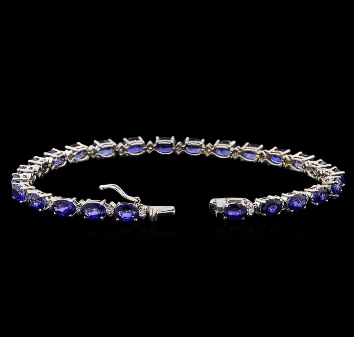 One electronically tested 14KT white gold ladies cast sapphire and diamond bracelet with a hidden box clasp with safety closer with a bright polish finish. Measurements: 7.25" in length Identified with markings of "14K". Condition is new. Containing: Twenty-five prong set oval modified brilliant cut natural blue sapphires, measuring 5.50 x 4.00 x 2.60mm, approximate total weight of 12.00ct., clarity is slightly included, type II, medium, moderately strong, blue color, (GIA B 5/4), cut is good. Twenty-Five prong set round brilliant cut diamonds, measuring 1.50 - 1.50 x 0.90mm (depth est.) approximate total weight of 25 Stones = 0.31ct. Clarity: SI-1. Color: I - J. Colored gemstones are presumed to have been subjected to commonly used enhancement processes, All diamonds and colored gemstones are graded in the mounting, unless otherwise stated. Total Weight of Colored Stones 12.00ct. Total Weight of Diamonds 0.31ct. Total Weight of Bracelet 10.80 grams. GGL Appraised at $4,975.00.