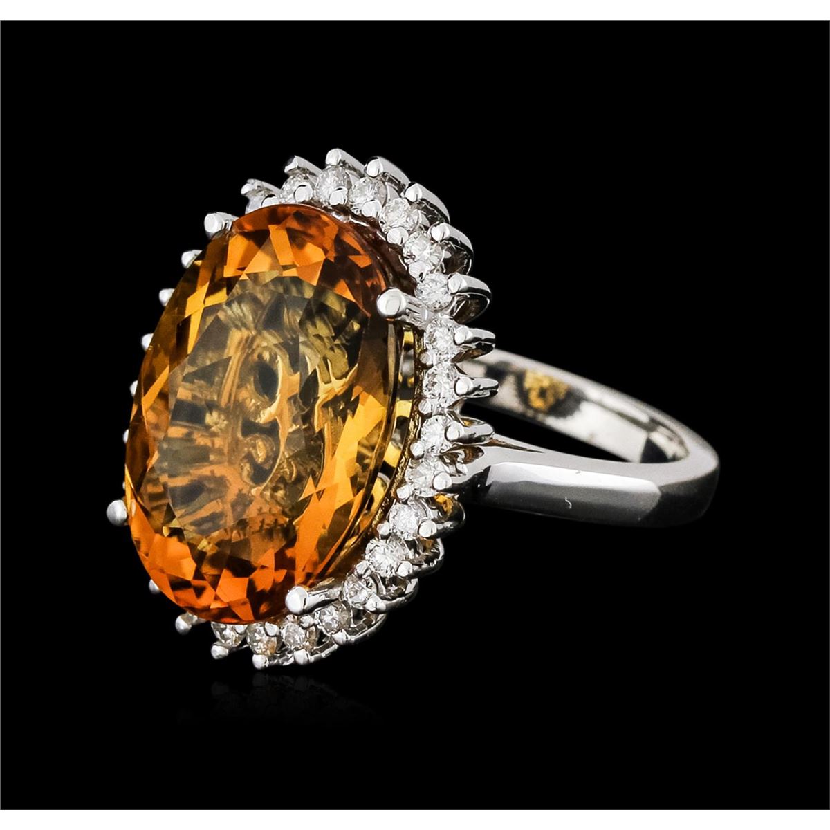 One electronically tested 14KT white gold ladies combination cast & assembled citrine and diamond ring with a bright polish finish. Identified with markings of "14K". Condition is new. Containing: One prong set oval modified brilliant cut natural citrine quartz, measuring 17.93 x 13.58 x 8.82mm, approximate weight of 12.00ct., clarity is eye clean, type I, medium light, brownish, orangy yellow color, (GIA oY 4/3), cut is good. Thirty prong set round brilliant cut diamonds, measuring 2.00 - 2.00 x 1.20mm (depth est.) approximate total weight of 30 Stones = 0.88ct. Clarity: SI-2 to I-1. Color: I - J, Cut is Good. Colored gemstones are presumed to have been subjected to commonly used enhancement processes. All diamonds and colored gemstones are graded in the mounting, unless otherwise stated. Total Weight of Colored Stones 12.00ct. Total Weight of Diamonds 0.88ct. Total Weight of Ring 9.20 grams. GGL Appraised at $3,870.00.