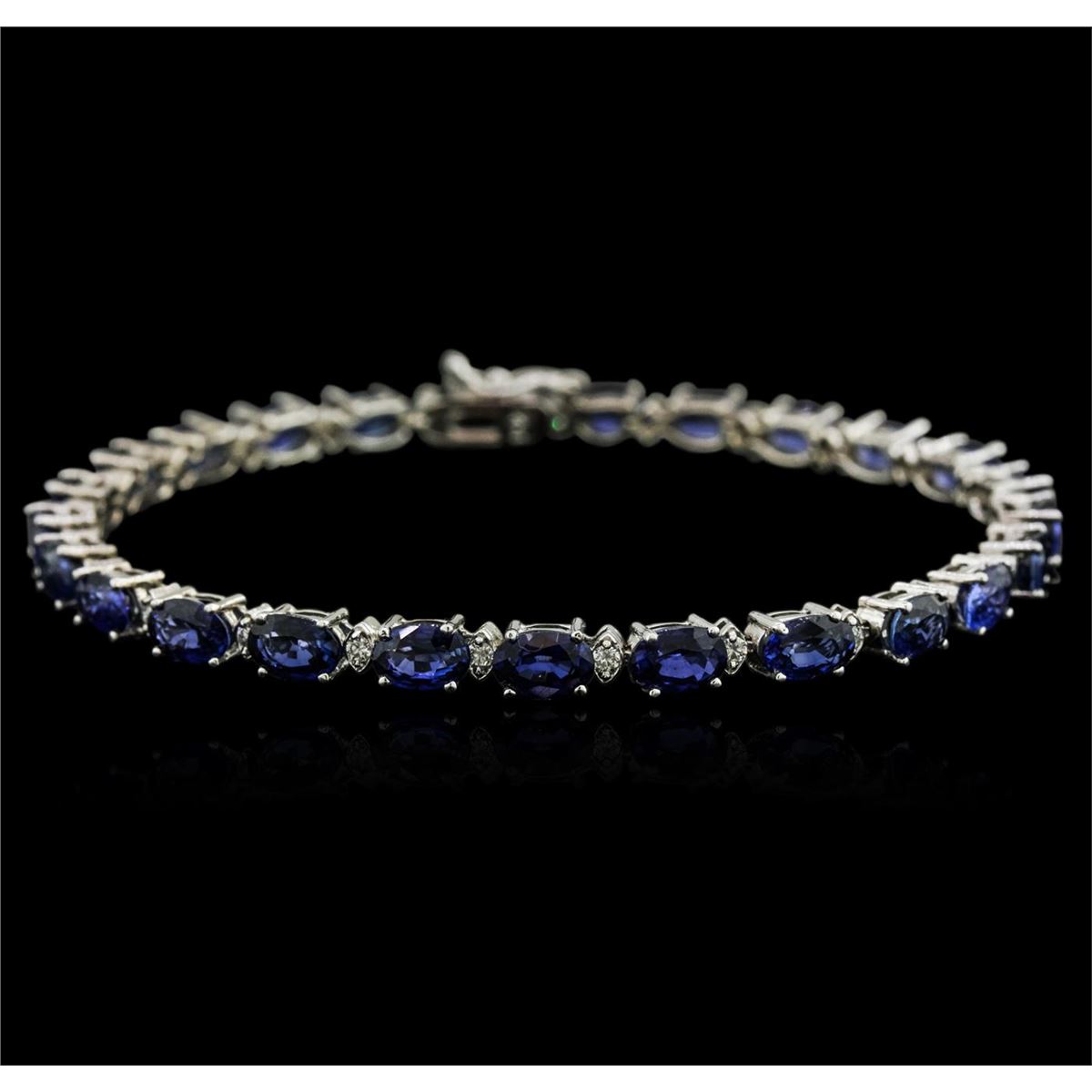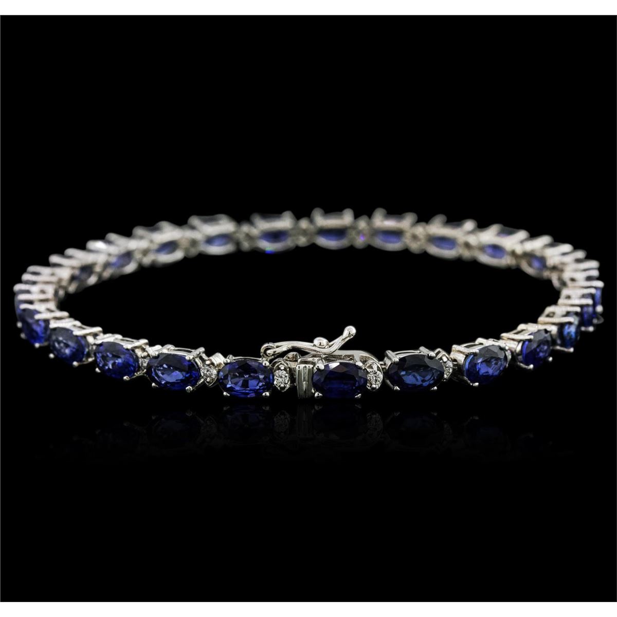 One electronically tested 14KT white gold ladies cast sapphire and diamond bracelet with a hidden box clasp with safety closer with a bright polish finish. Measurements: 7.25" in length Identified with markings of "14K". Condition is new. Containing: Twenty-five prong set oval modified brilliant cut natural blue sapphires, measuring 5.50 x 4.00 x 2.60mm, approximate total weight of 12.00ct., clarity is slightly included, type II, medium, moderately strong, blue color, (GIA B 5/4), cut is good. Twenty-Five prong set round brilliant cut diamonds, measuring 1.50 - 1.50 x 0.90mm (depth est.) approximate total weight of 25 Stones = 0.31ct. Clarity: SI-1. Color: I - J. Colored gemstones are presumed to have been subjected to commonly used enhancement processes, All diamonds and colored gemstones are graded in the mounting, unless otherwise stated. Total Weight of Colored Stones 12.00ct. Total Weight of Diamonds 0.31ct. Total Weight of Bracelet 10.80 grams. GGL Appraised at $4,975.00.