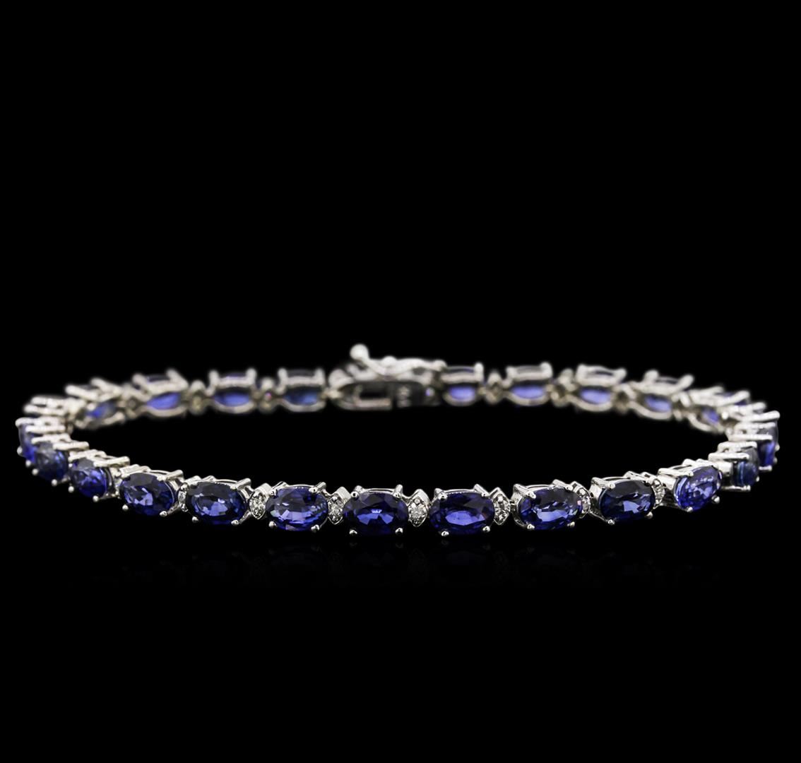One electronically tested 14KT white gold ladies cast sapphire and diamond bracelet with a hidden box clasp with safety closer with a bright polish finish. Measurements: 7.25" in length Identified with markings of "14K". Condition is new. Containing: Twenty-five prong set oval modified brilliant cut natural blue sapphires, measuring 5.50 x 4.00 x 2.60mm, approximate total weight of 12.00ct., clarity is slightly included, type II, medium, moderately strong, blue color, (GIA B 5/4), cut is good. Twenty-Five prong set round brilliant cut diamonds, measuring 1.50 - 1.50 x 0.90mm (depth est.) approximate total weight of 25 Stones = 0.31ct. Clarity: SI-1. Color: I - J. Colored gemstones are presumed to have been subjected to commonly used enhancement processes, All diamonds and colored gemstones are graded in the mounting, unless otherwise stated. Total Weight of Colored Stones 12.00ct. Total Weight of Diamonds 0.31ct. Total Weight of Bracelet 10.80 grams. GGL Appraised at $4,975.00.