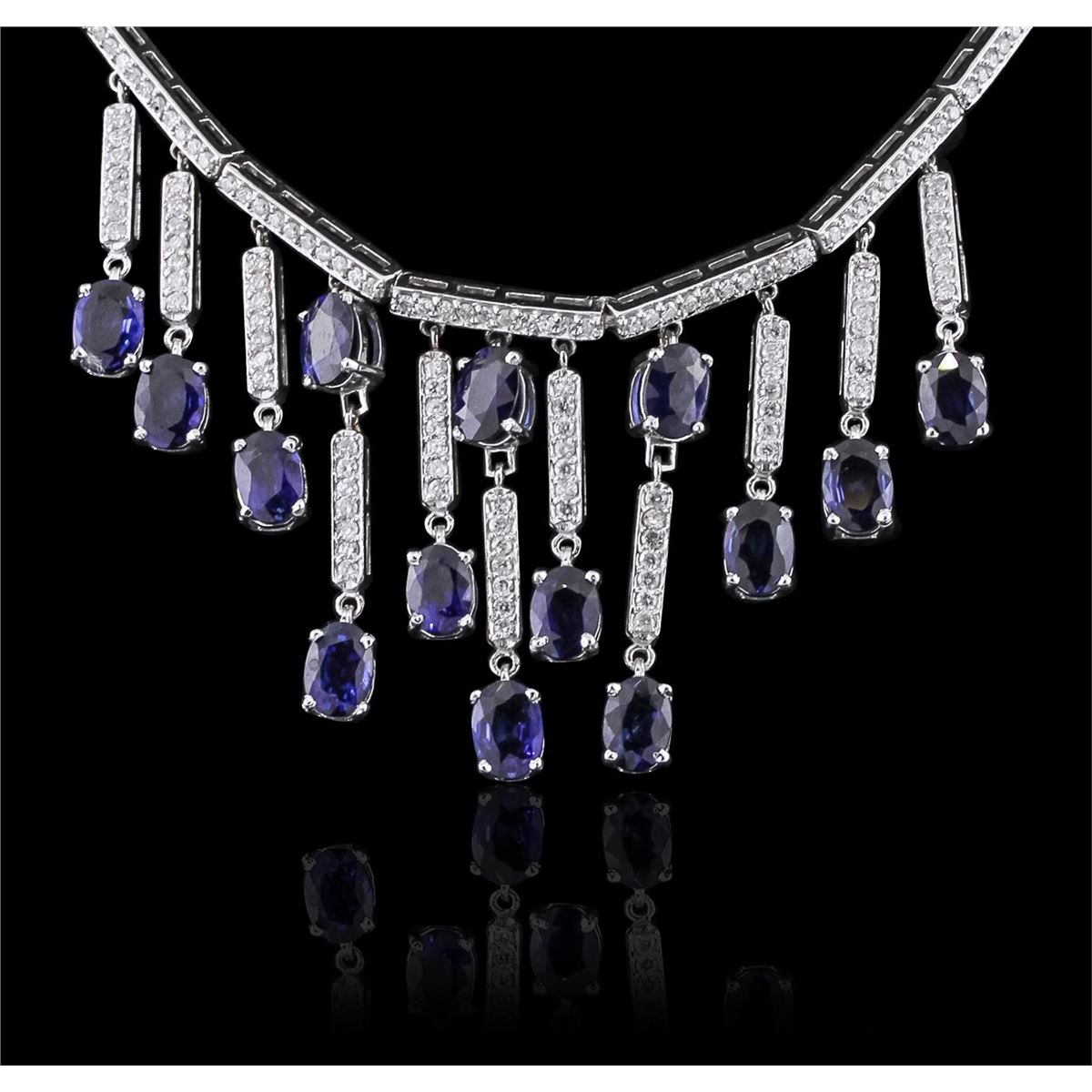 One electronically tested 14KT white gold ladies combination cast & assembled choker necklace with a hidden box clasp with a bright polish finish. Condition is new. Measurements: 14" in length. Identified with markings of "14K". Containing: Fourteen prong set oval modified brilliant cut natural blue sapphires, measuring 6.70 x 4.90 x 3.19mm, approximate. Total Weight of 12.04ct., clarity is eye clean, type II, medium, moderately strong, blue color, (GIA B 5/4), cut is good. Three Hundred Twenty-Seven prong set round brilliant cut diamonds, measuring 1.30 - 1.30 x 0.78mm (depth est.) approximate. Total Weight of 327 Stones = 2.62ct. Clarity: SI-2 to I-1. Color: G - H, Cut is Good. Colored gemstones are presumed to have been subjected to commonly used enhancement processes. All diamonds and colored gemstones are graded in the mounting, unless otherwise stated. Total Weight of Colored Stones 12.04ct. Total Weight of Diamonds 2.62ct. Total Weight of Necklace 31.80 grams. GGL Appraised at $24,720.00.