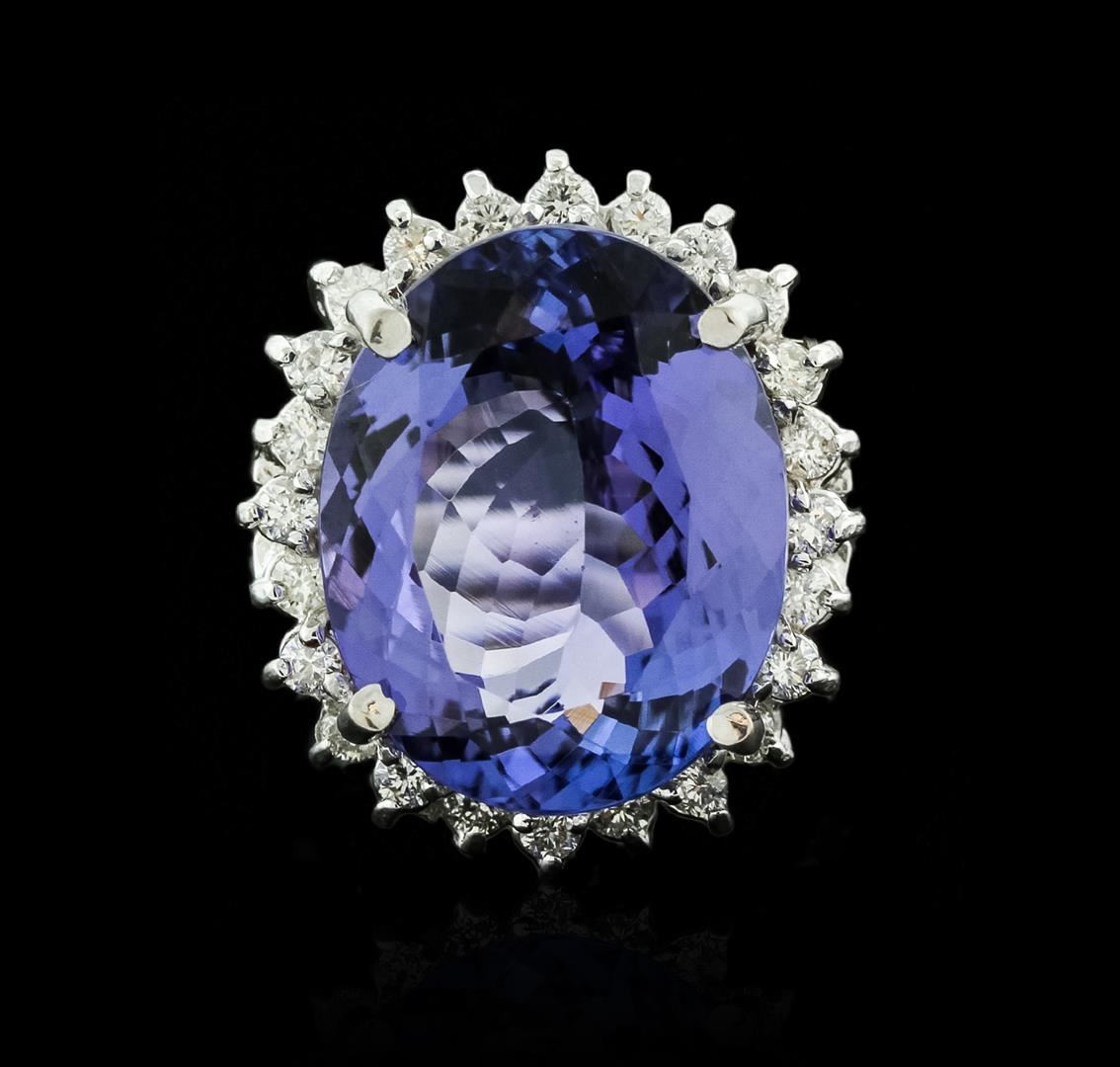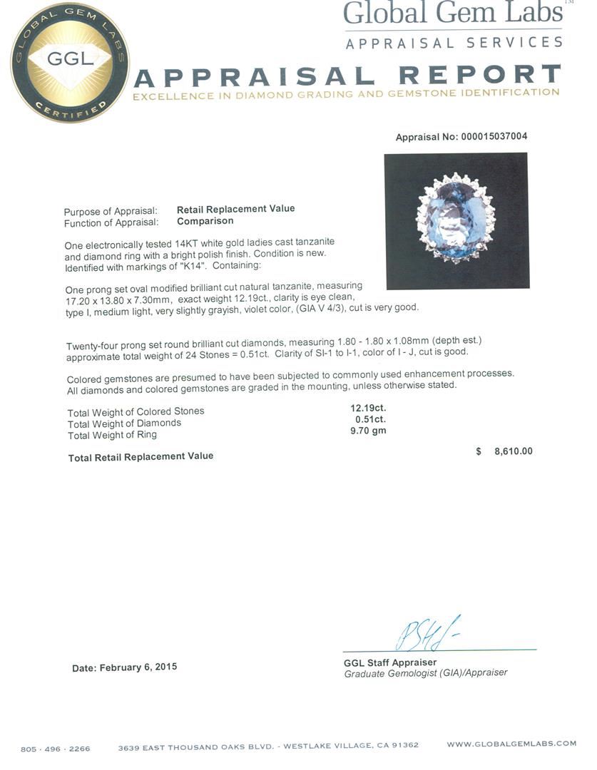 One electronically tested 14KT white gold ladies cast tanzanite and diamond ring with a bright polish finish. Identified with markings of "K14". Condition is new. Containing: One prong set oval modified brilliant cut natural tanzanite, measuring 17.20 x 13.80 x 7.30mm, exact weight 12.19ct., clarity is eye clean, type I, medium light, very slightly grayish, violet color, (GIA V 4/3), cut is very good. Twenty-Four prong set round brilliant cut diamonds, measuring 1.80 - 1.80 x 1.08mm (depth est.) approximate total weight of 24 Stones = 0.51ct. Clarity: SI-1 to I-1. Color: I - J, Cut is Good. Colored gemstones are presumed to have been subjected to commonly used enhancement processes. All diamonds and colored gemstones are graded in the mounting, unless otherwise stated. Total Weight of Colored Stones 12.19ct. Total Weight of Diamonds 0.51ct. Total Weight of Ring 9.70 grams. GGL Appraised at $8,610.00.