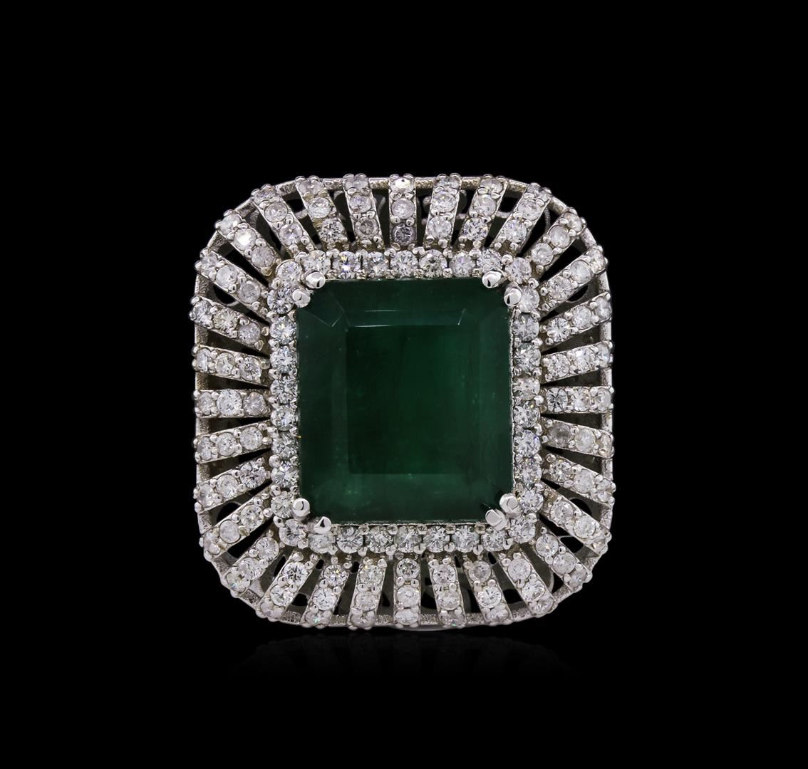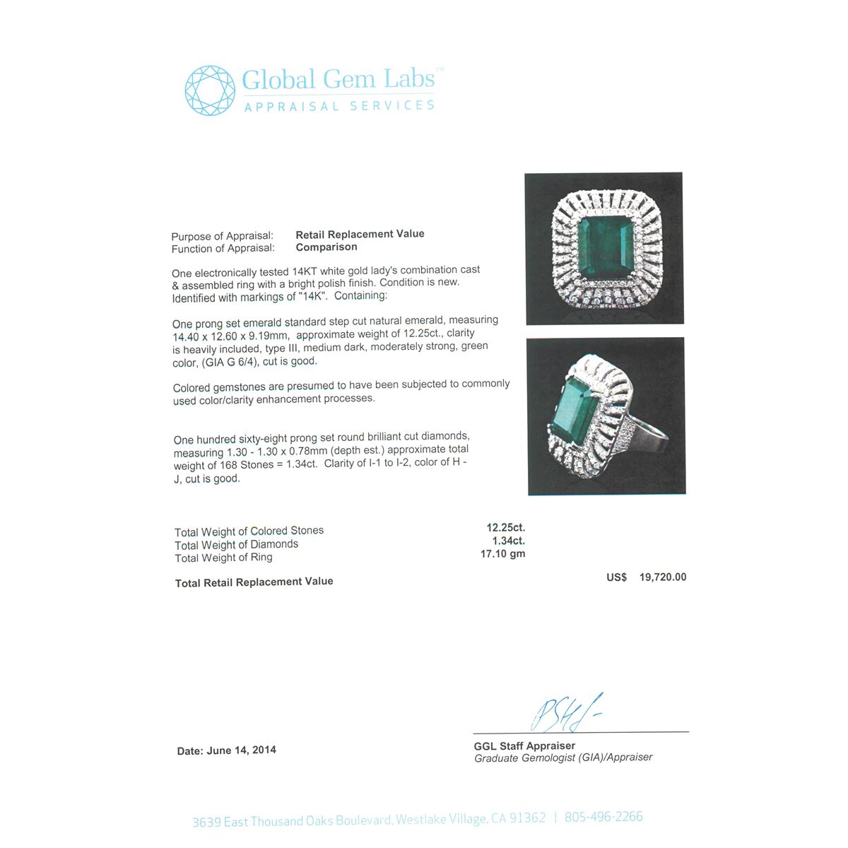 One electronically tested 14KT white gold Ladies combination cast & assembled ring with a bright polish finish. Condition is new. Identified with markings of "14K". Containing: One prong set emerald standard step cut natural emerald, measuring 14.40 x 12.60 x 9.19mm, approximate weight of 12.25ct., clarity is heavily included, type III, medium dark, moderately strong, green color, (GIA G 6/4), cut is good. Colored gemstones are presumed to have been subjected to commonly used color/clarity enhancement processes. One Hundred Sixty-Eight prong set round brilliant cut diamonds, measuring 1.30 - 1.30 x 0.78mm (depth est.) approximate. Total Weight of 168 Stones = 1.34ct. Clarity: I-1 to I-2. Color: H - J, Cut is Good. Total Weight of Colored Stones 12.25ct. Total Weight of Diamonds 1.34ct. Total Weight of Ring 17.10 grams. GGL Appraised at $19,720.00.