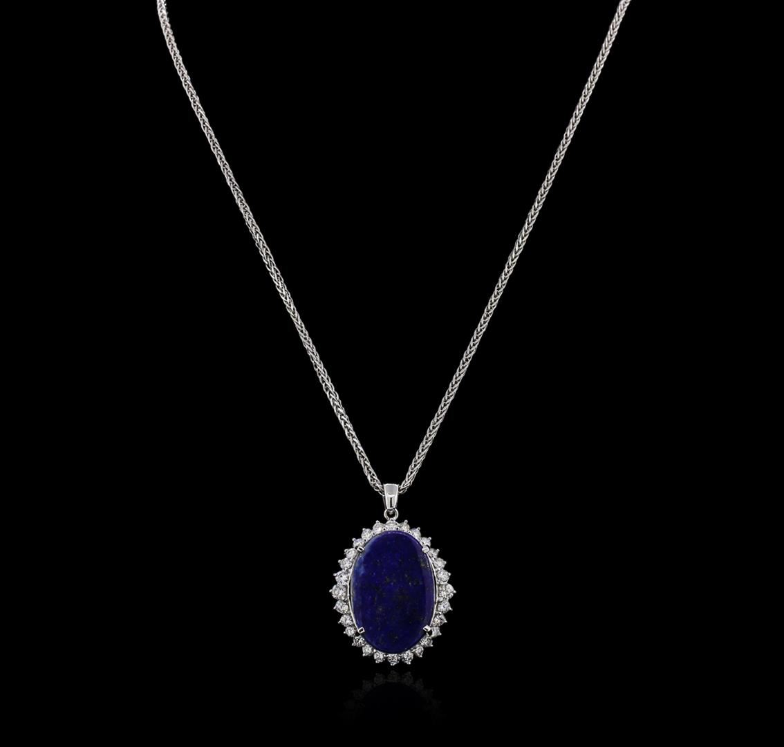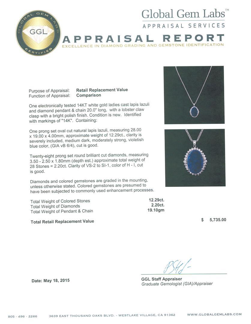 One electronically tested 14KT white gold ladies cast lapis lazuli and diamond pendant & chain 20.0" long, with a lobster claw clasp with a bright polish finish. Identified with markings of "14K". Condition is new. Containing: One prong set oval cut natural lapis lazuli, measuring 28.00 x 19.00 x 4.00mm, approximate weight of 12.29ct., clarity is severely included, medium dark, moderately strong, violetish blue color, (GIA vB 6/4), cut is good. Twenty-Eight prong set round brilliant cut diamonds, measuring 3.50 - 2.50 x 1.80mm (depth est.) approximate total weight of 28 Stones = 2.20ct. Clarity: VS-2 to SI-1. Color: H - I, Cut is Good. Diamonds and colored gemstones are graded in the mounting, unless otherwise stated. Colored gemstones are presumed to have been subjected to commonly used enhancement processes. Total Weight of Colored Stones 12.29ct. Total Weight of Diamonds 2.20ct. Total Weight of Pendant & Chain 19.10 grams. GGL Appraised at $5,735.00.