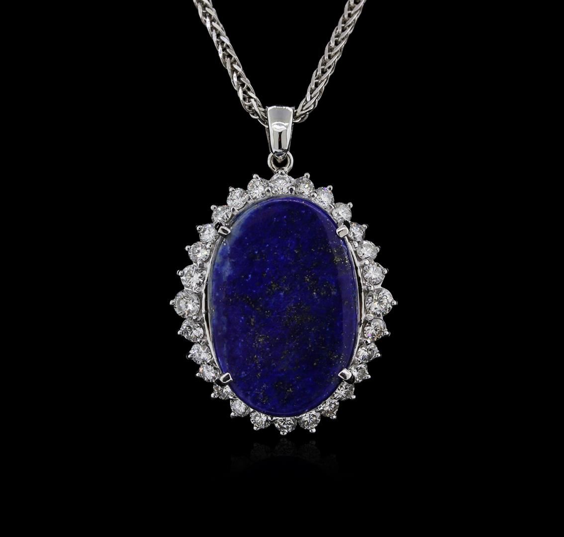One electronically tested 14KT white gold ladies cast lapis lazuli and diamond pendant & chain 20.0" long, with a lobster claw clasp with a bright polish finish. Identified with markings of "14K". Condition is new. Containing: One prong set oval cut natural lapis lazuli, measuring 28.00 x 19.00 x 4.00mm, approximate weight of 12.29ct., clarity is severely included, medium dark, moderately strong, violetish blue color, (GIA vB 6/4), cut is good. Twenty-Eight prong set round brilliant cut diamonds, measuring 3.50 - 2.50 x 1.80mm (depth est.) approximate total weight of 28 Stones = 2.20ct. Clarity: VS-2 to SI-1. Color: H - I, Cut is Good. Diamonds and colored gemstones are graded in the mounting, unless otherwise stated. Colored gemstones are presumed to have been subjected to commonly used enhancement processes. Total Weight of Colored Stones 12.29ct. Total Weight of Diamonds 2.20ct. Total Weight of Pendant & Chain 19.10 grams. GGL Appraised at $5,735.00.