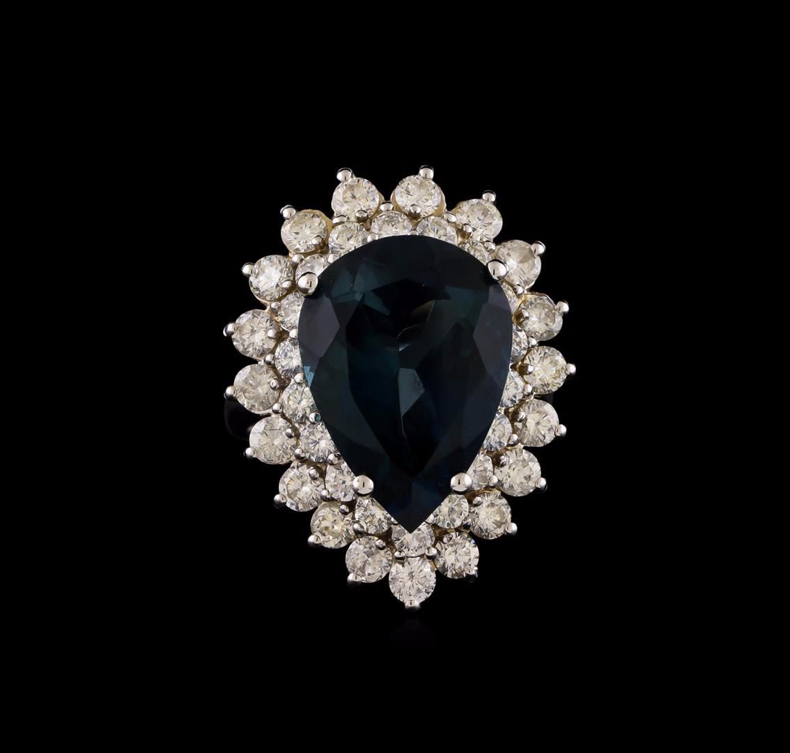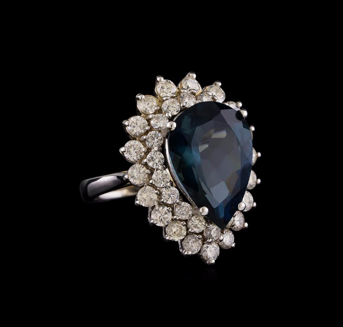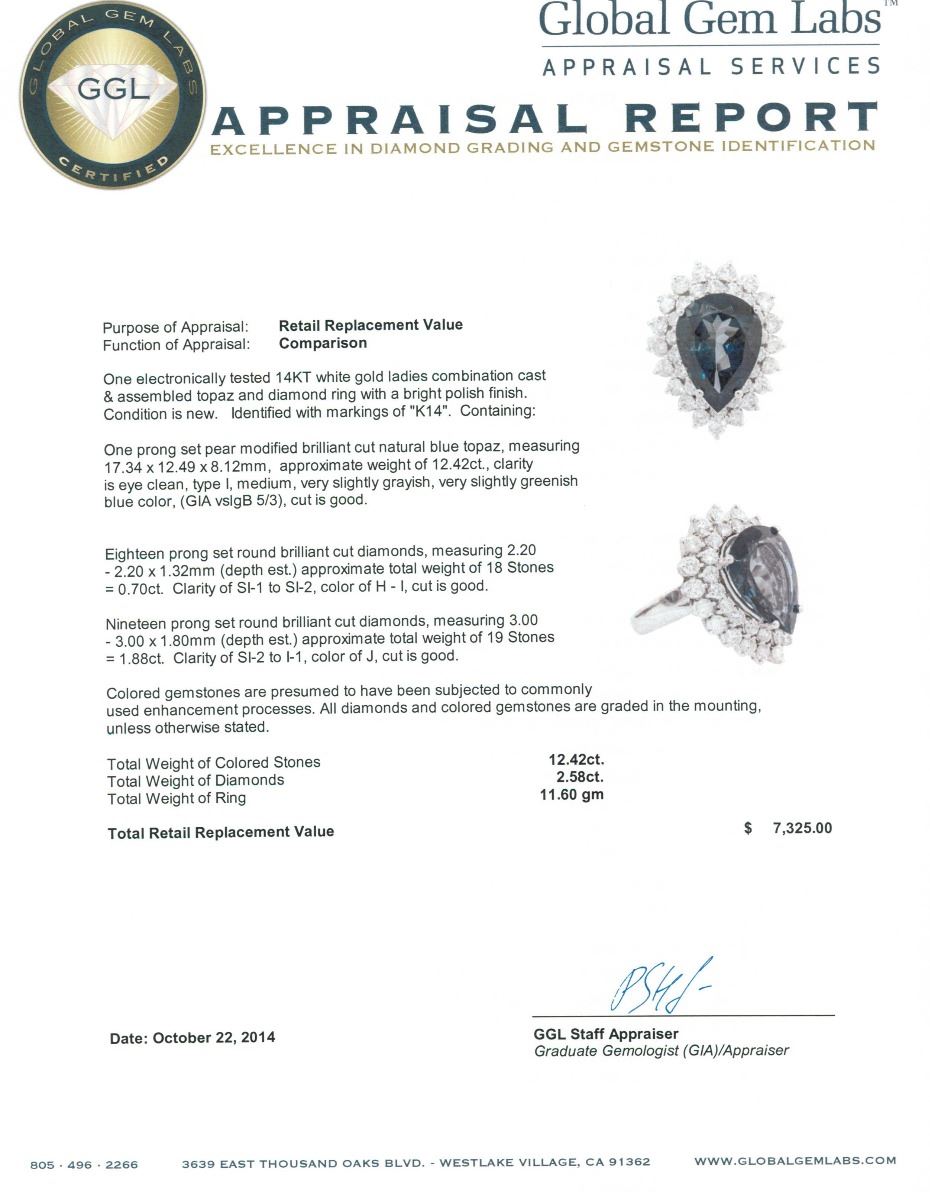 One electronically tested 14KT white gold ladies combination cast & assembled topaz and diamond ring with a bright polish finish. Identified with markings of "K14". Condition is new. Containing: One prong set pear modified brilliant cut natural blue topaz, measuring 17.34 x 12.49 x 8.12mm, approximate weight of 12.42ct., clarity is eye clean, type I, medium, very slightly grayish, very slightly greenish blue color, (GIA vslgB 5/3), cut is good. Eighteen prong set round brilliant cut diamonds, measuring 2.20 - 2.20 x 1.32mm (depth est.) approximate total weight of 18 Stones = 0.70ct. Clarity: SI-1 to SI-2. Color: H - I, Cut is Good. Nineteen prong set round brilliant cut diamonds, measuring 3.00 - 3.00 x 1.80mm (depth est.) approximate total weight of 19 Stones = 1.88ct. Clarity: SI-2 to I-1. Color: J, Cut is Good. Colored gemstones are presumed to have been subjected to commonly used enhancement processes. All diamonds and colored gemstones are graded in the mounting, unless otherwise stated. Total Weight of Colored Stones 12.42ct. Total Weight of Diamonds 2.58ct. Total Weight of Ring 11.60 grams. GGL Appraised at $7,325.00.