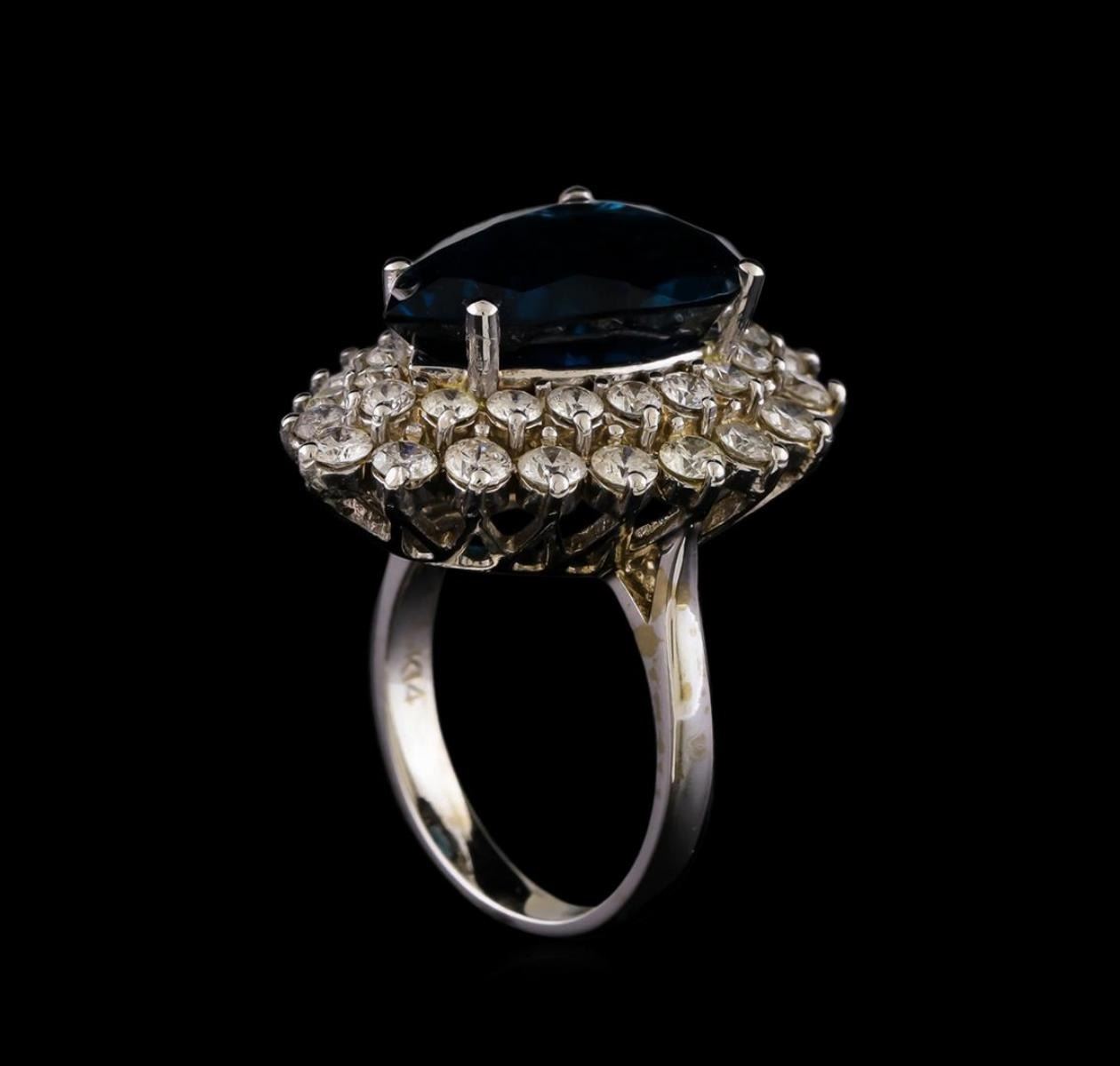One electronically tested 14KT white gold ladies combination cast & assembled topaz and diamond ring with a bright polish finish. Identified with markings of "K14". Condition is new. Containing: One prong set pear modified brilliant cut natural blue topaz, measuring 17.34 x 12.49 x 8.12mm, approximate weight of 12.42ct., clarity is eye clean, type I, medium, very slightly grayish, very slightly greenish blue color, (GIA vslgB 5/3), cut is good. Eighteen prong set round brilliant cut diamonds, measuring 2.20 - 2.20 x 1.32mm (depth est.) approximate total weight of 18 Stones = 0.70 ct. Clarity: SI-1 to SI-2. Color: H - I, Cut is Good. Nineteen prong set round brilliant cut diamonds, measuring 3.00 - 3.00 x 1.80mm (depth est.) approximate total weight of 19 Stones = 1.88ct. Clarity: SI-2 to I-1. Color: J, Cut is Good. Colored gemstones are presumed to have been subjected to commonly used enhancement processes. All diamonds and colored gemstones are graded in the mounting, unless otherwise stated. Total Weight of Colored Stones 12.42ct. Total Weight of Diamonds 2.58ct. Total Weight of Ring 11.60 grams. GGL Appraised.