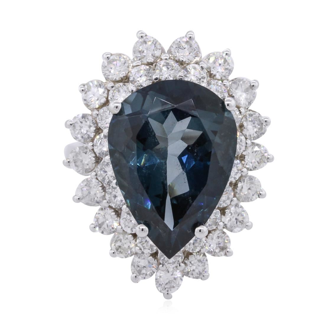 One electronically tested 14KT white gold ladies combination cast & assembled topaz and diamond ring with a bright polish finish. Identified with markings of "K14". Condition is new. Containing: One prong set pear modified brilliant cut natural blue topaz, measuring 17.34 x 12.49 x 8.12mm, approximate weight of 12.42ct., clarity is eye clean, type I, medium, very slightly grayish, very slightly greenish blue color, (GIA vslgB 5/3), cut is good. Eighteen prong set round brilliant cut diamonds, measuring 2.20 - 2.20 x 1.32mm (depth est.) approximate total weight of 18 Stones = 0.70ct. Clarity: SI-1 to SI-2. Color: H - I, Cut is Good. Nineteen prong set round brilliant cut diamonds, measuring 3.00 - 3.00 x 1.80mm (depth est.) approximate total weight of 19 Stones = 1.88ct. Clarity: SI-2 to I-1. Color: J, Cut is Good. Colored gemstones are presumed to have been subjected to commonly used enhancement processes. All diamonds and colored gemstones are graded in the mounting, unless otherwise stated. Total Weight of Colored Stones 12.42ct. Total Weight of Diamonds 2.58ct. Total Weight of Ring 11.60 grams. GGL Appraised at $7,325.00.