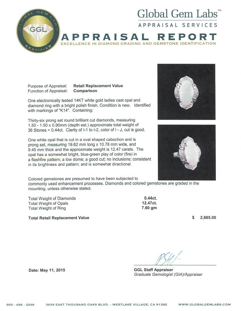One electronically tested 14KT white gold ladies cast opal and diamond ring with a bright polish finish. Identified with markings of "K14". Condition is new. Containing: Thirty-Six prong set round brilliant cut diamonds, measuring 1.50 - 1.50 x 0.90mm (depth est.) approximate total weight of 36 Stones = 0.44ct. Clarity: I-1 to I-2. Color: I - J, Cut is Good. One white opal that is cut in a oval shaped cabochon and is prong set, measuring 19.62 mm long x 10.78 mm wide, and 9.45 mm thick and the approximate weight is 12.47 carats. The opal has a somewhat bright, blue-green play of color (fire) in a flashfire pattern; a low dome; a good cut; no inclusions; consistent in its brightness and pattern; and is somewhat directional. Colored gemstones are presumed to have been subjected to commonly used enhancement processes. Diamonds and colored gemstones are graded in the mounting, unless otherwise stated. Total Weight of Diamonds 0.44ct. Total Weight of Opals 12.47ct. Total Weight of Ring 7.60 grams. GGL Appraised at $2,685.00.
