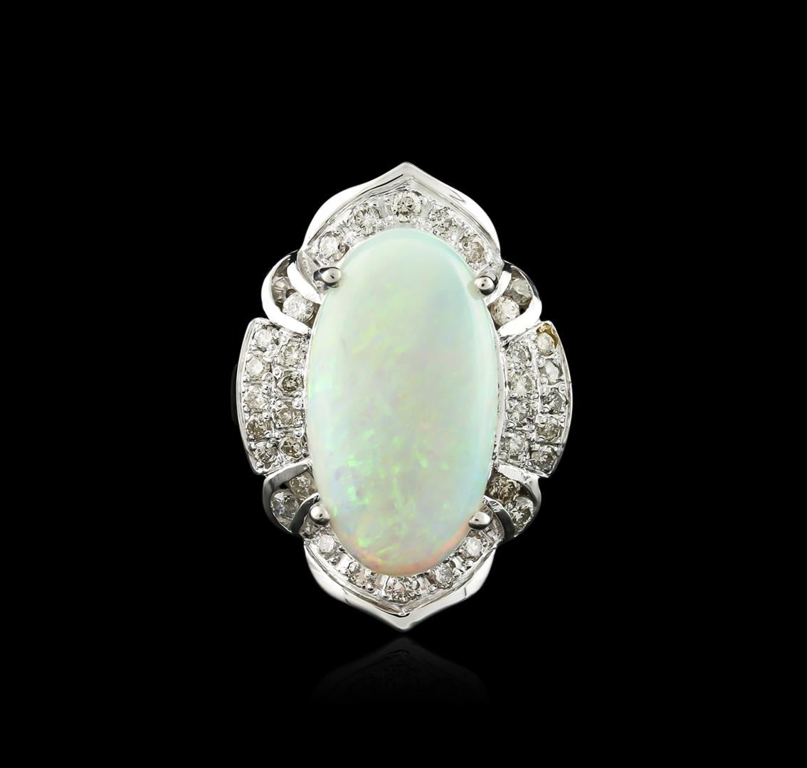 One electronically tested 14KT white gold ladies cast opal and diamond ring with a bright polish finish. Identified with markings of "K14". Condition is new. Containing: Thirty-Six prong set round brilliant cut diamonds, measuring 1.50 - 1.50 x 0.90mm (depth est.) approximate total weight of 36 Stones = 0.44ct. Clarity: I-1 to I-2. Color: I - J, Cut is Good. One white opal that is cut in a oval shaped cabochon and is prong set, measuring 19.62 mm long x 10.78 mm wide, and 9.45 mm thick and the approximate weight is 12.47 carats. The opal has a somewhat bright, blue-green play of color (fire) in a flashfire pattern; a low dome; a good cut; no inclusions; consistent in its brightness and pattern; and is somewhat directional. Colored gemstones are presumed to have been subjected to commonly used enhancement processes. Diamonds and colored gemstones are graded in the mounting, unless otherwise stated. Total Weight of Diamonds 0.44ct. Total Weight of Opals 12.47ct. Total Weight of Ring 7.60 grams. GGL Appraised at $2,685.00.
