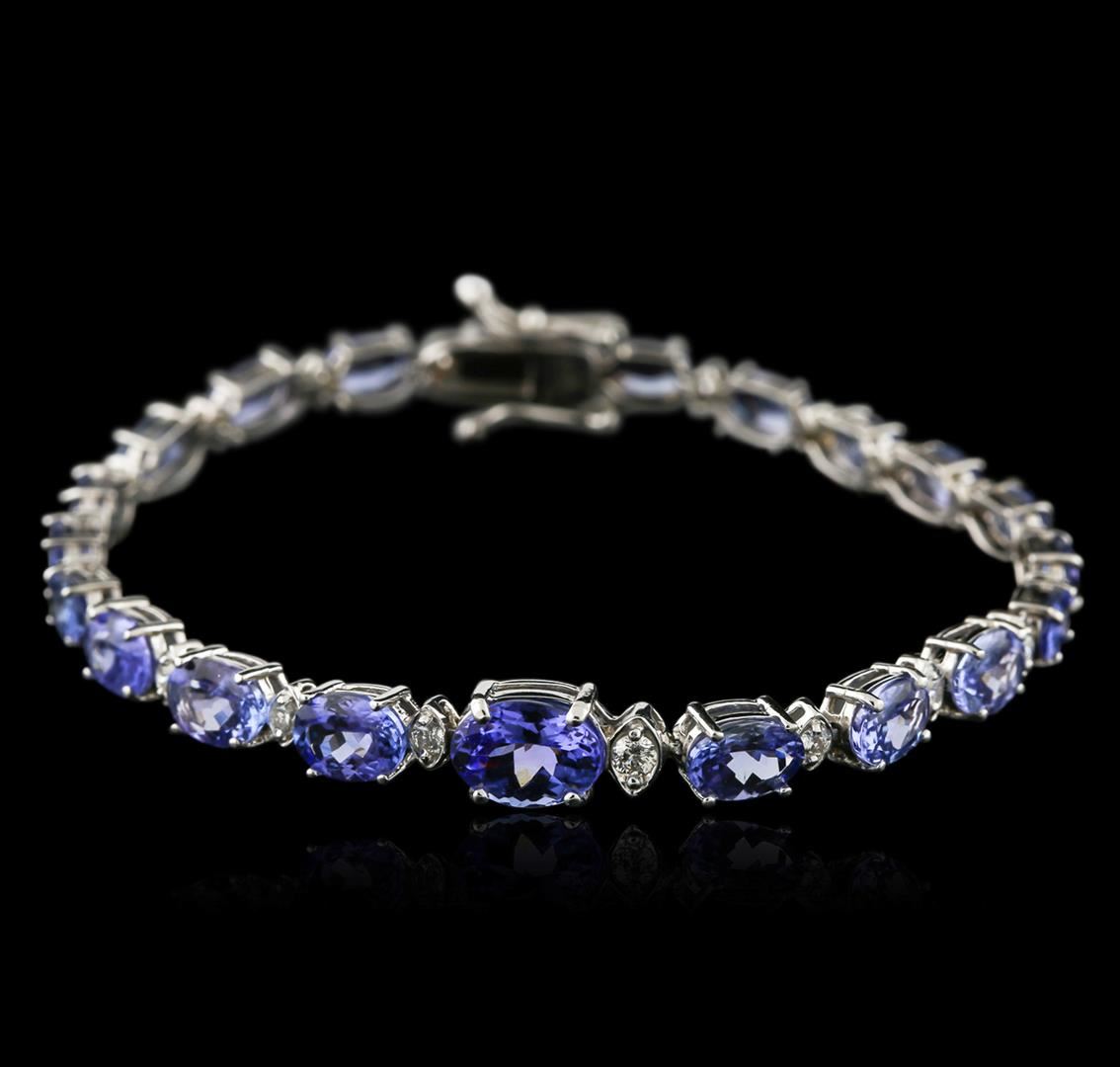 One bracelet featuring: Metal: 14k Solid White Gold. Face Measurements: 7 x 180mm. Size: 7. Finish: Bright Polish. Total Item Weight: 11.0 grams. Markings: Stamped 14K. Country Made: USA. Main Stone: Tanzanite. Quantity: 20. Shape: Oval. Color: Blue. Carat Total Weight: 12.50. Measurements: 4 x 6 - 7 x 9mm. Treatment: None. Setting: Prong. Hue: Blue. Saturation: Moderately Strong. Tone: Medium Dark. Clarity: Type 2. Cut: Very Good. Secondary Stone: Diamond. Quantity: 20. Shape: Round. Color: White. Carat Total Weight: 0.80. Measurements: 1.5 - 2mm. Treatment: None. Setting: Prong. Color Grade: H - I. Clarity: SI1 - SI2. Cut: Very Good. Excellent Workmanship. Gemstones graded in the mounting. Beverly Hills Gemological Lab at $9,500.00.